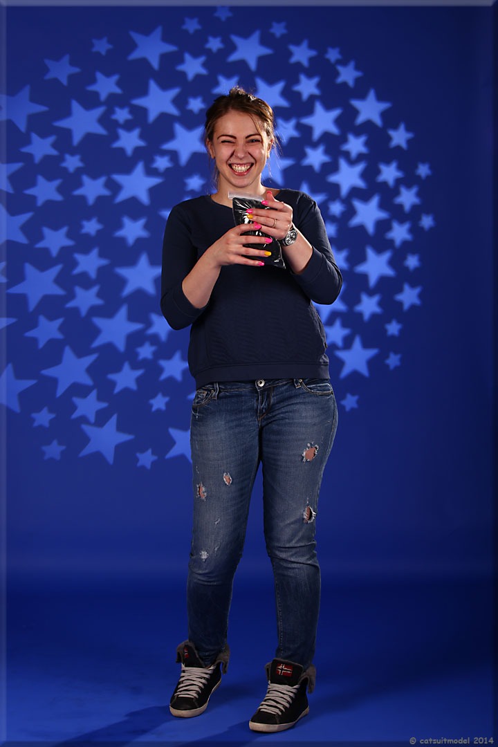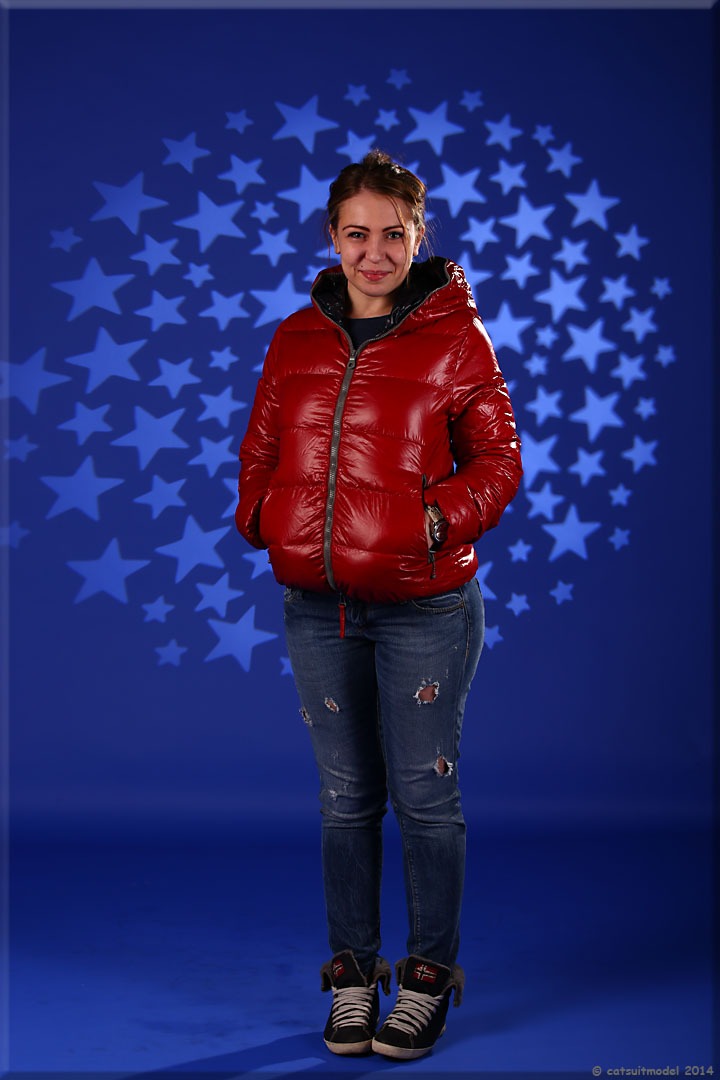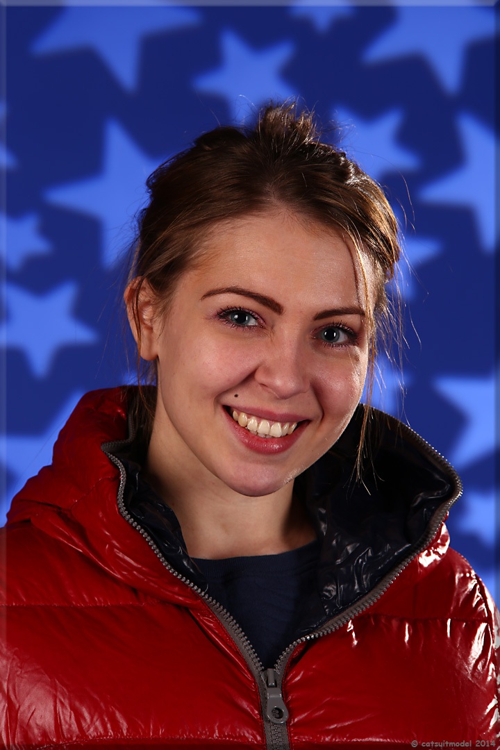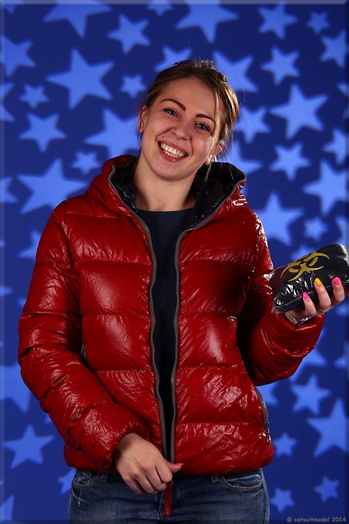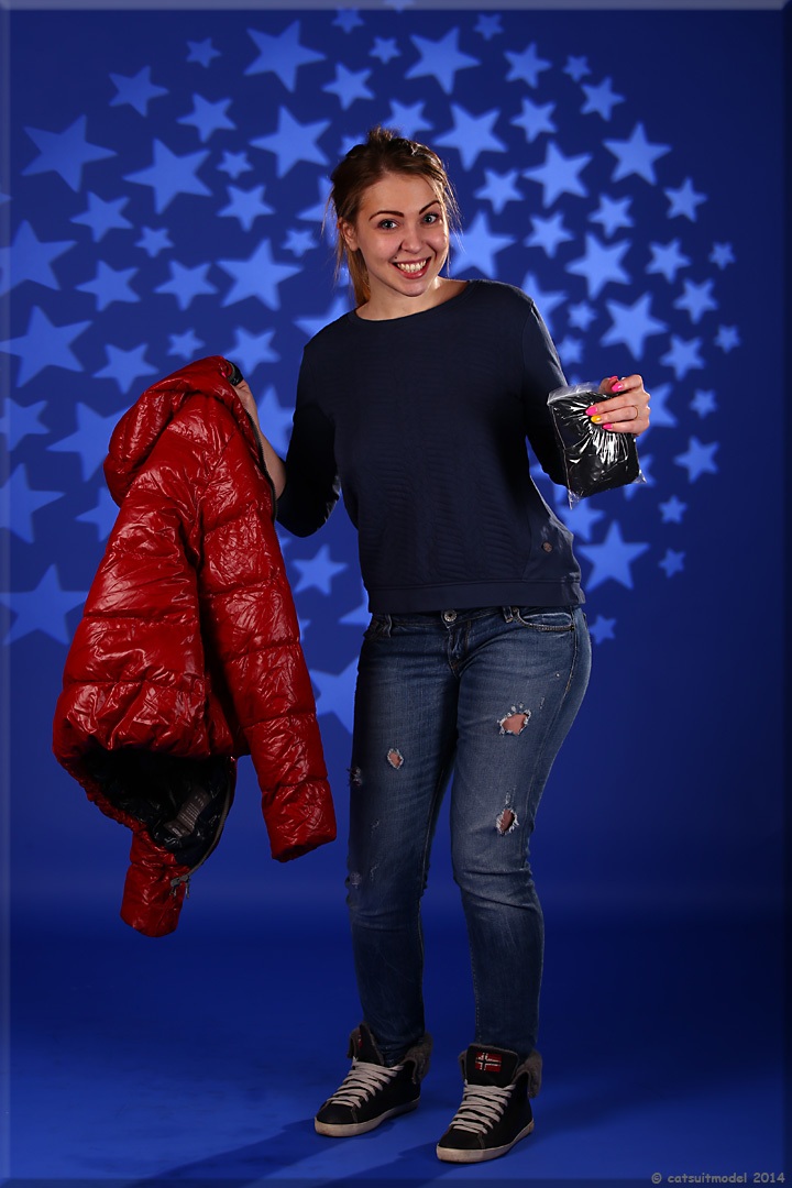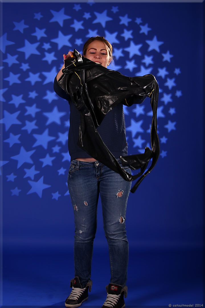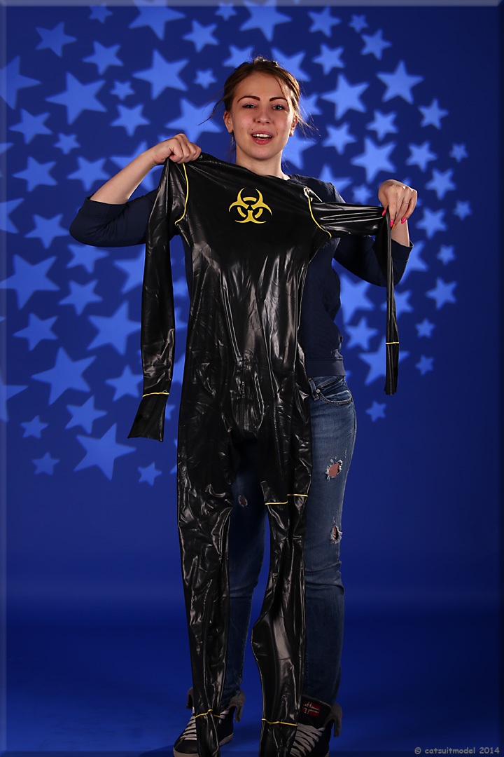 Adela zog sich vor der Kamera ganz selbstbewusst an. Catsuit: Mannequin von Fantasticrubber. Sie hatte ihn nicht zum ersten Mal an.