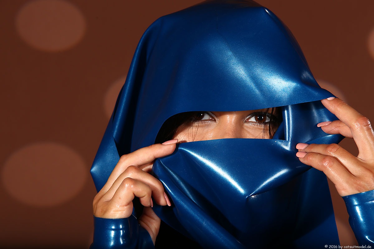 Der Catsuit heisst „Feenstaub“, kommt von Latexcrazy und stand schon lange auf meinem persönlichen Wunschzettel. Die Besonderheit ist der Schal, die Haube oder was Katya auch immer damit anstellt.