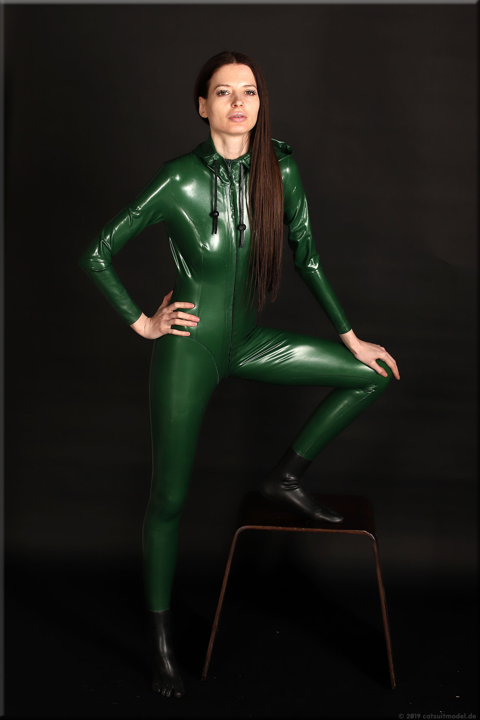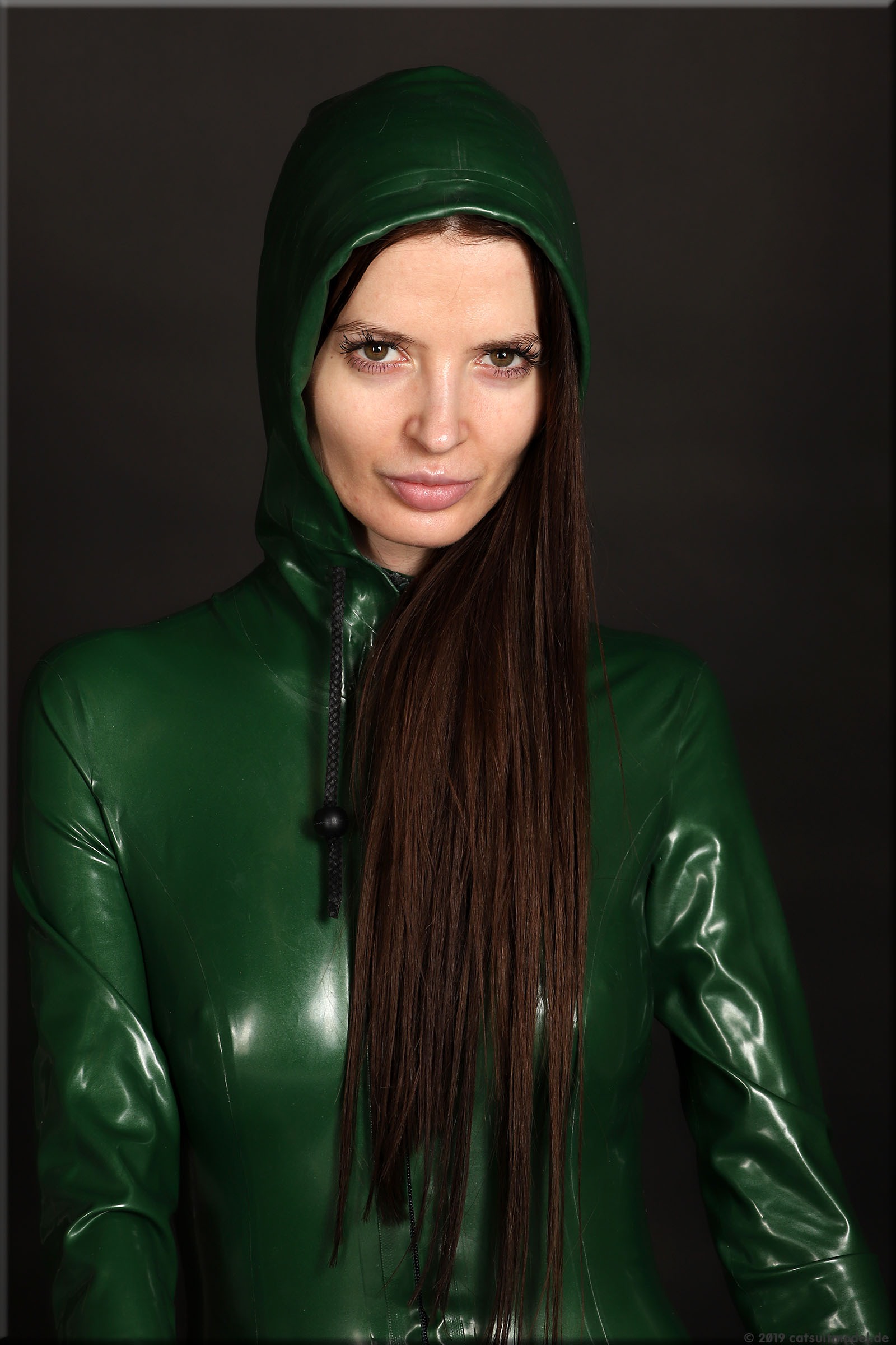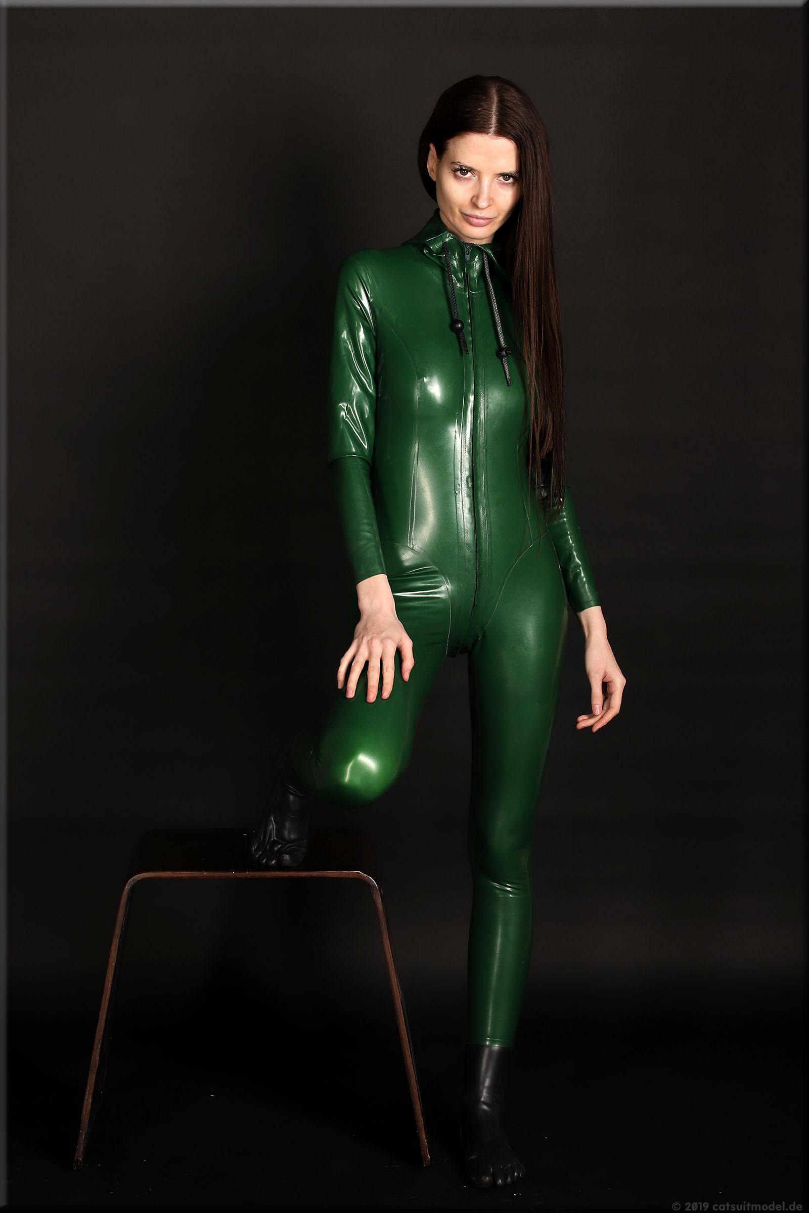 Olesia trägt einen Catsuit mit Kapuze von Latexcrazy.