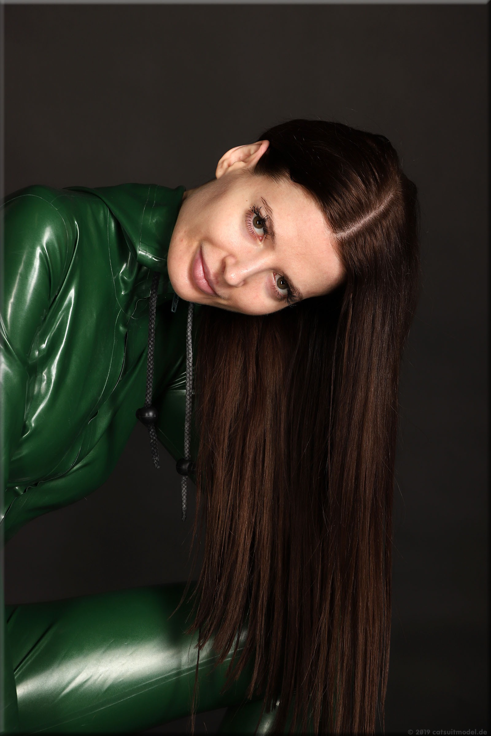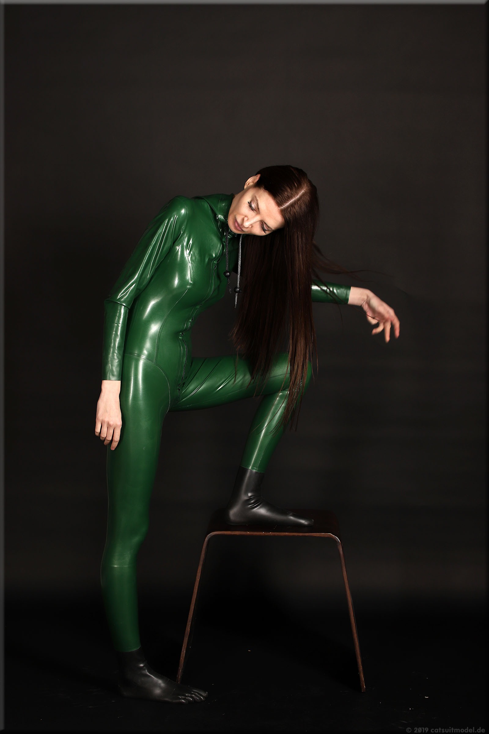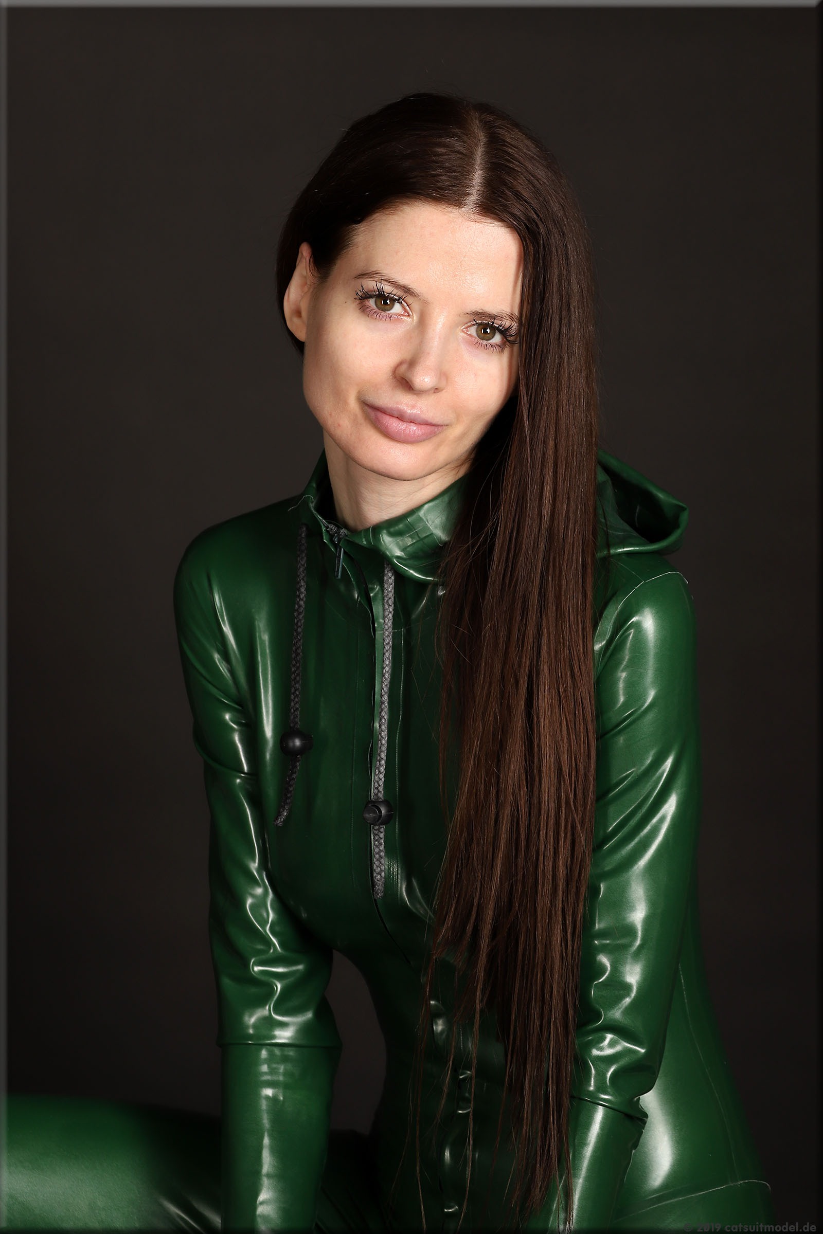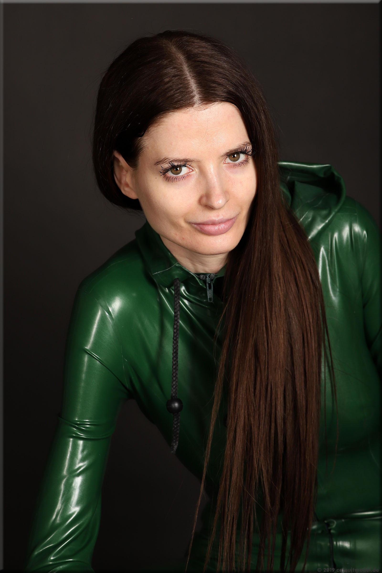 Olesia trägt einen Catsuit mit Kapuze von Latexcrazy.