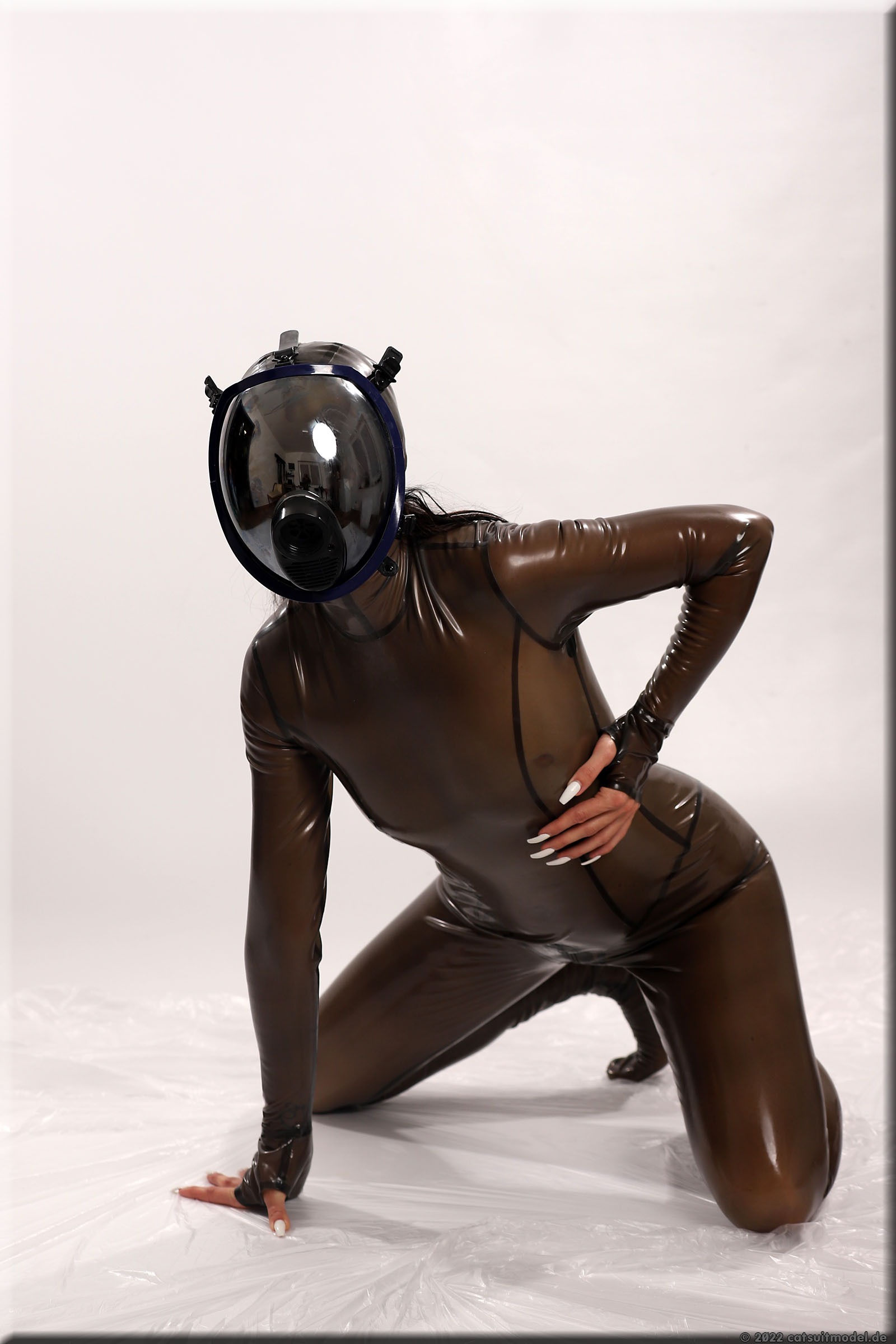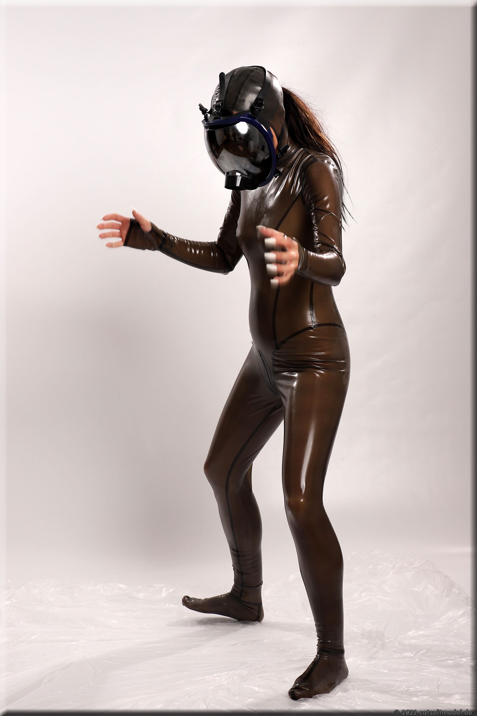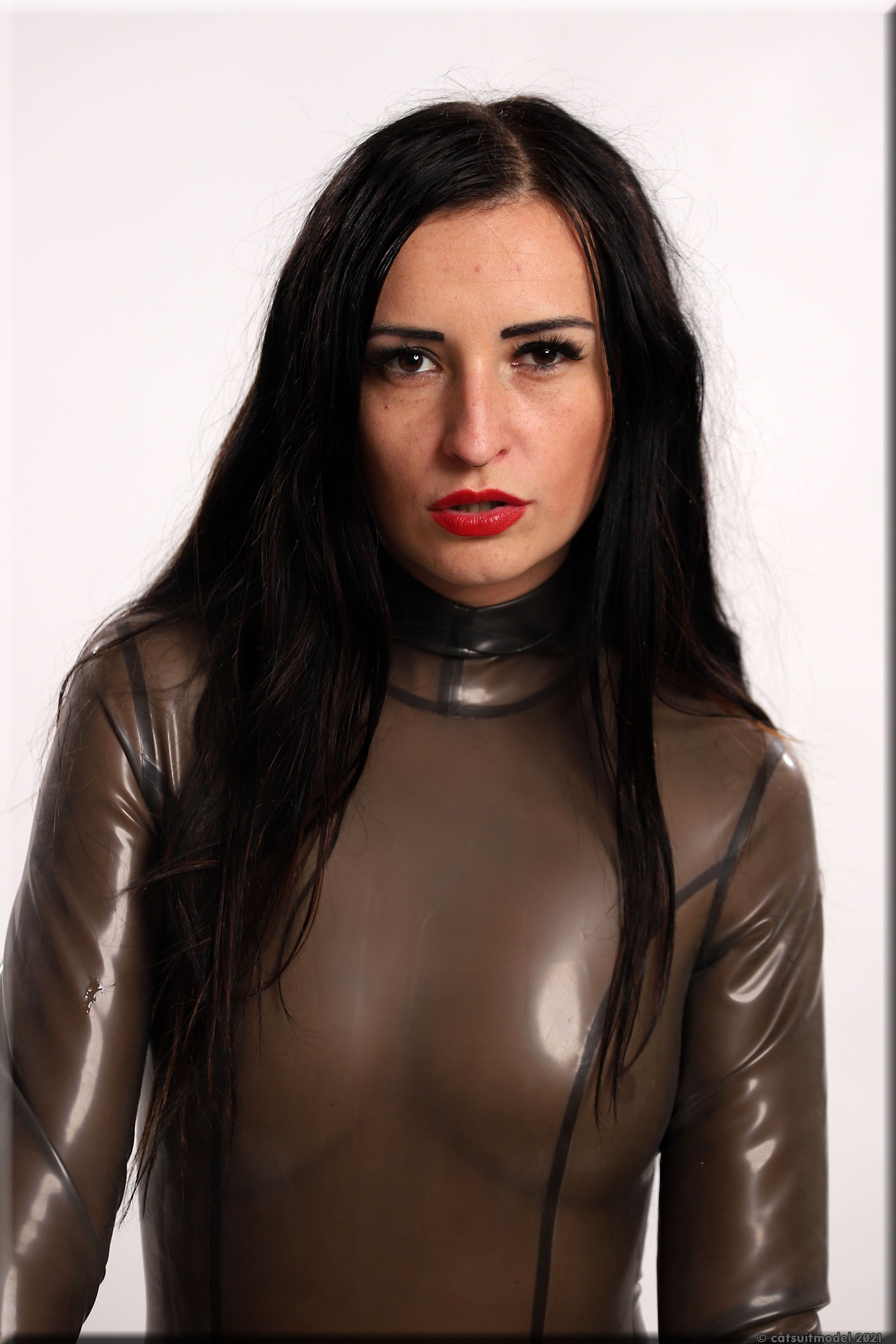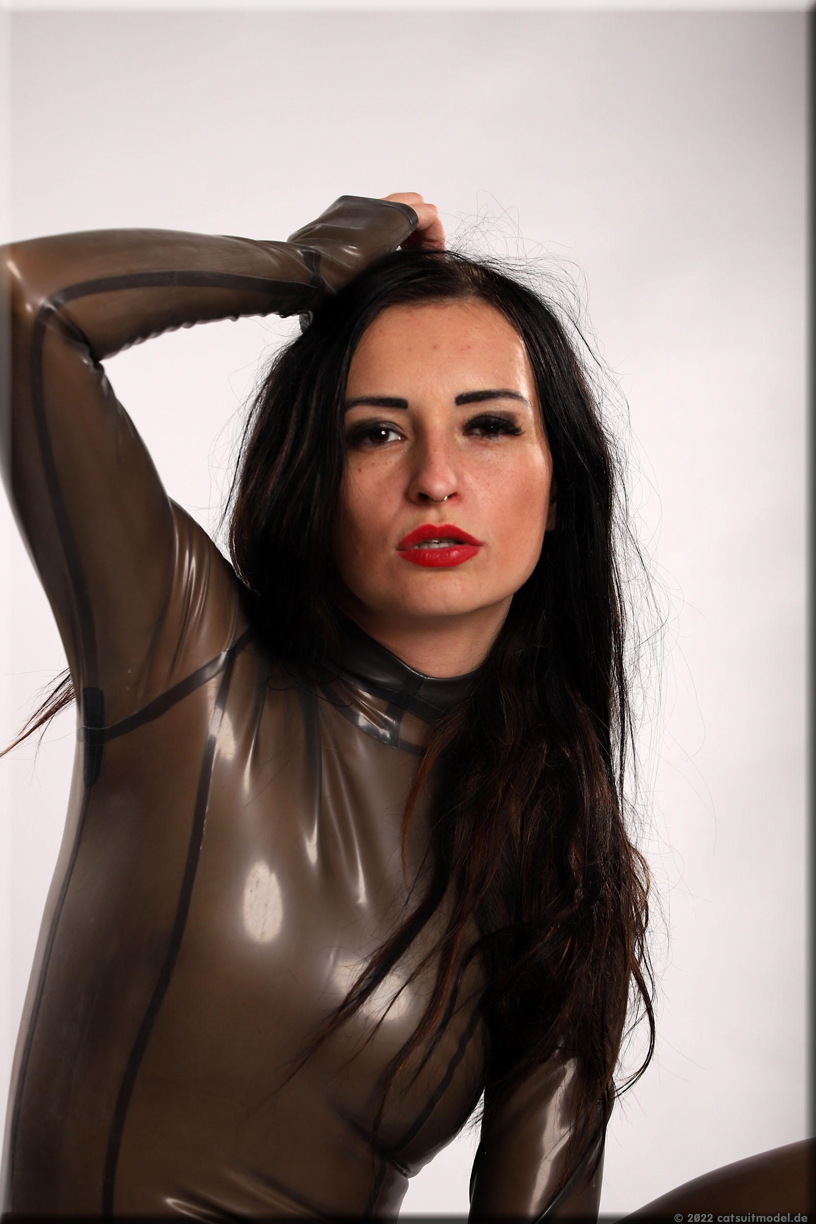 Kira trägt heute einen transparenten, dennoch fast allumschliessenden Catsuit in rauchgrau transparent von Latexcrazy.