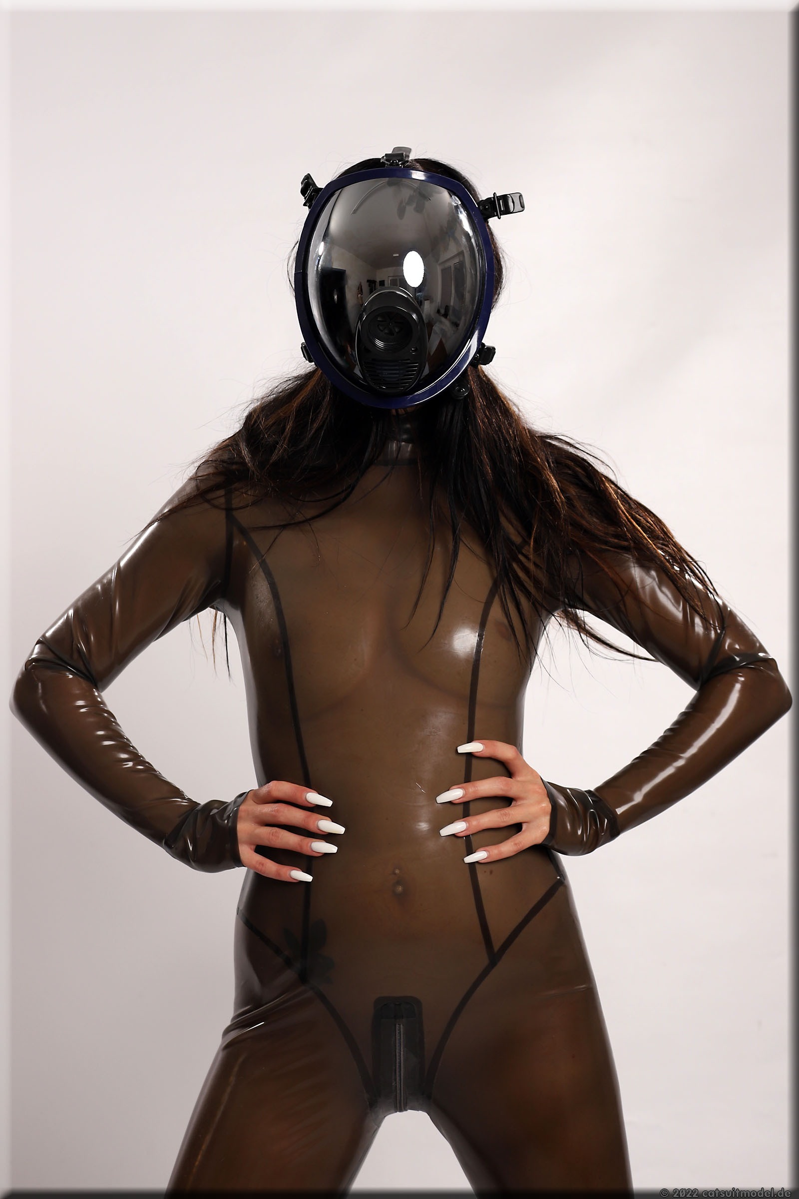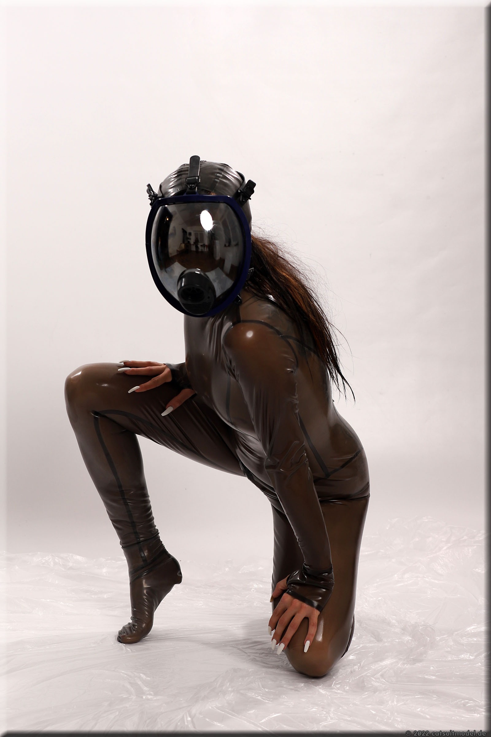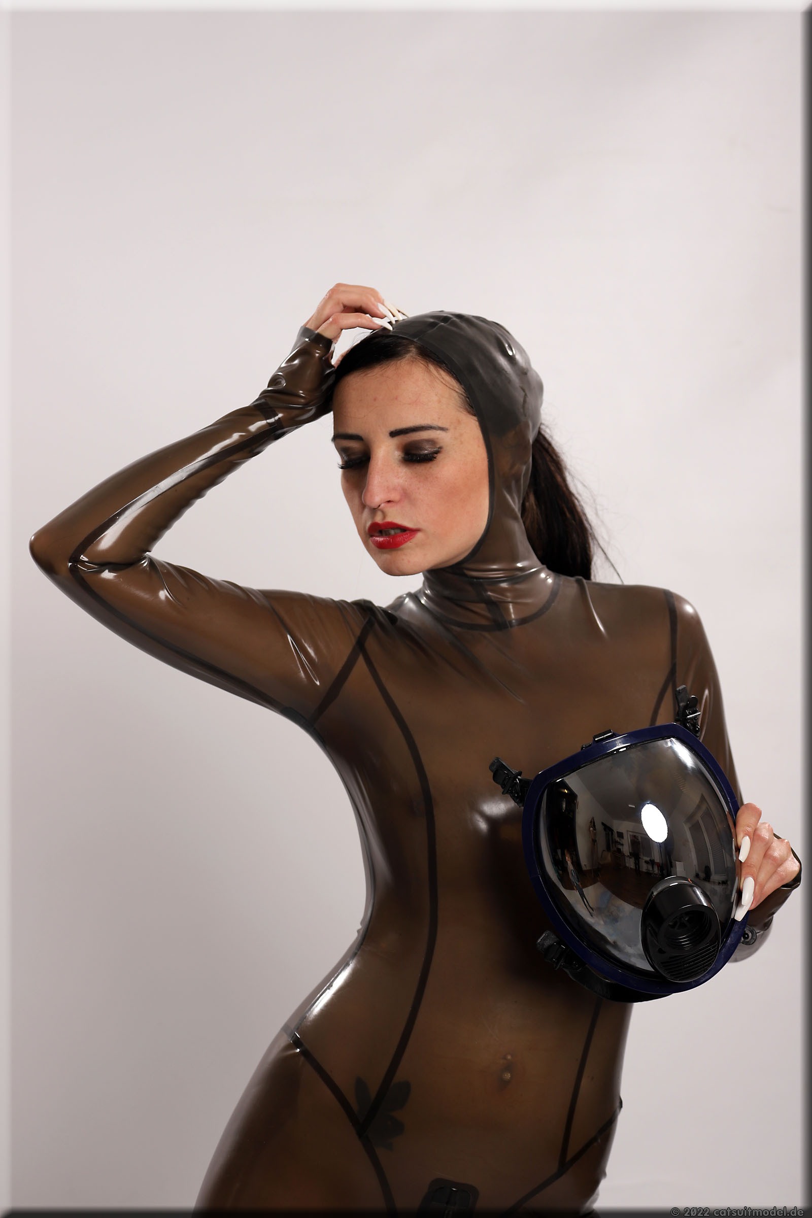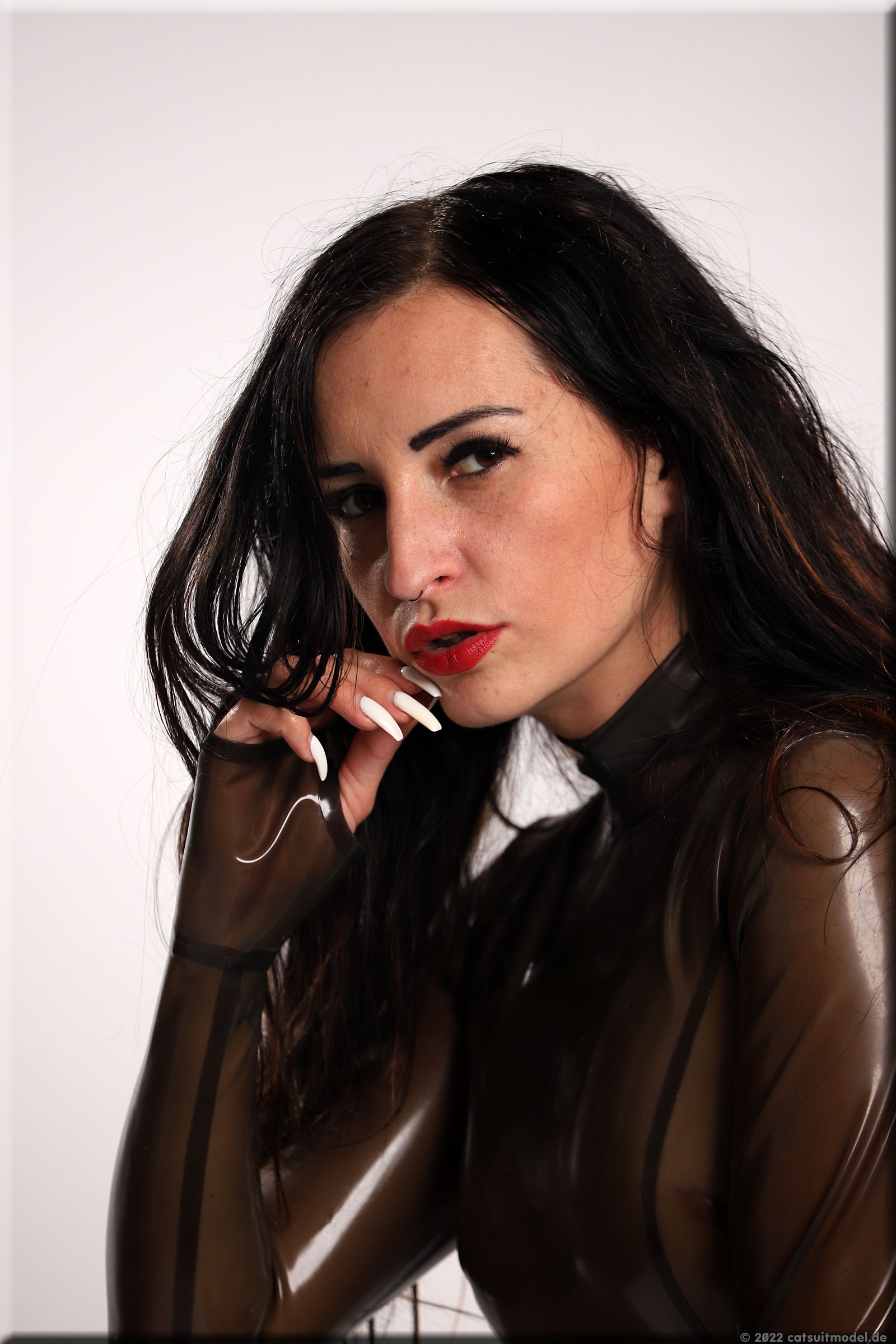 Kira trägt heute einen transparenten, dennoch fast allumschliessenden Catsuit in rauchgrau transparent von Latexcrazy.