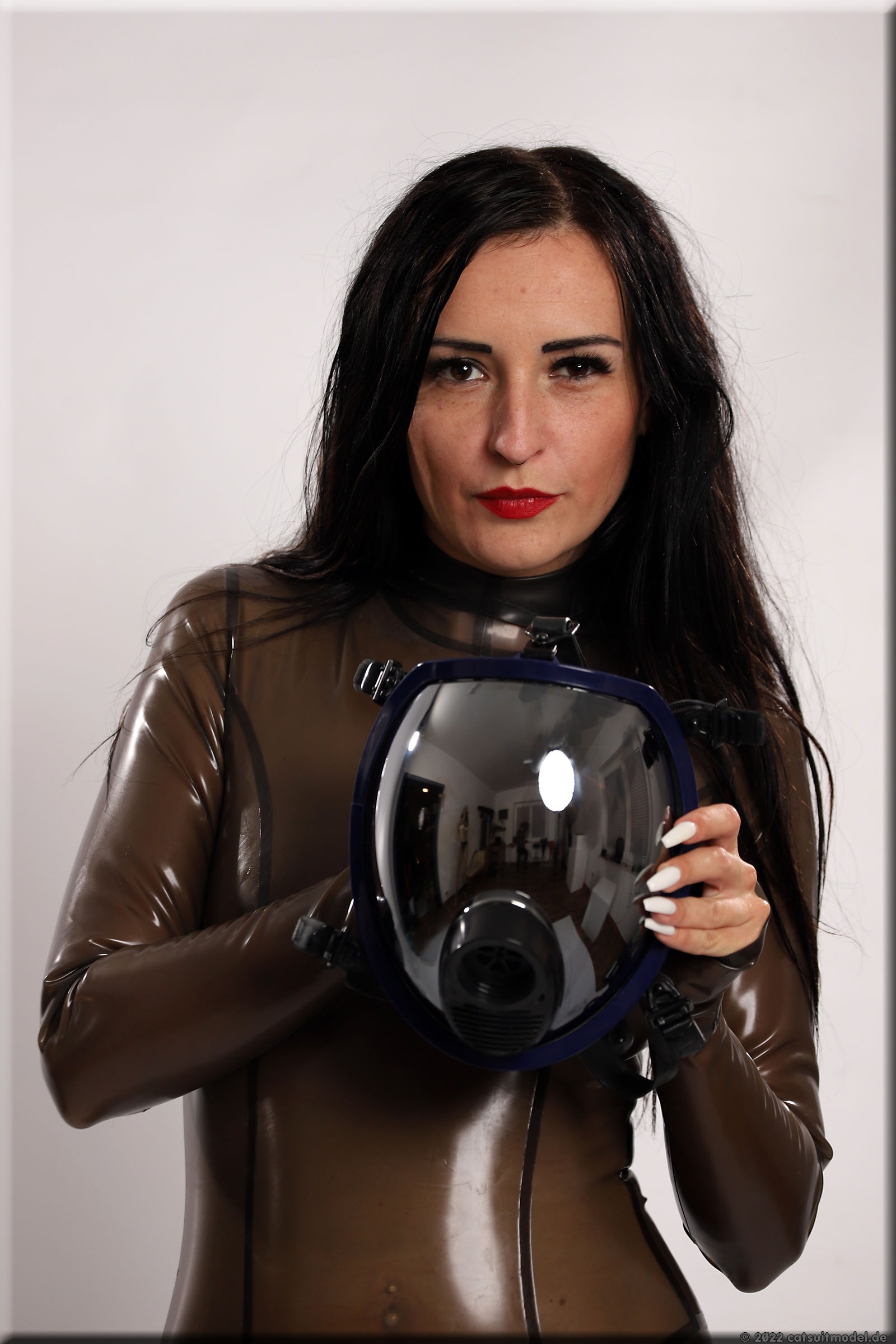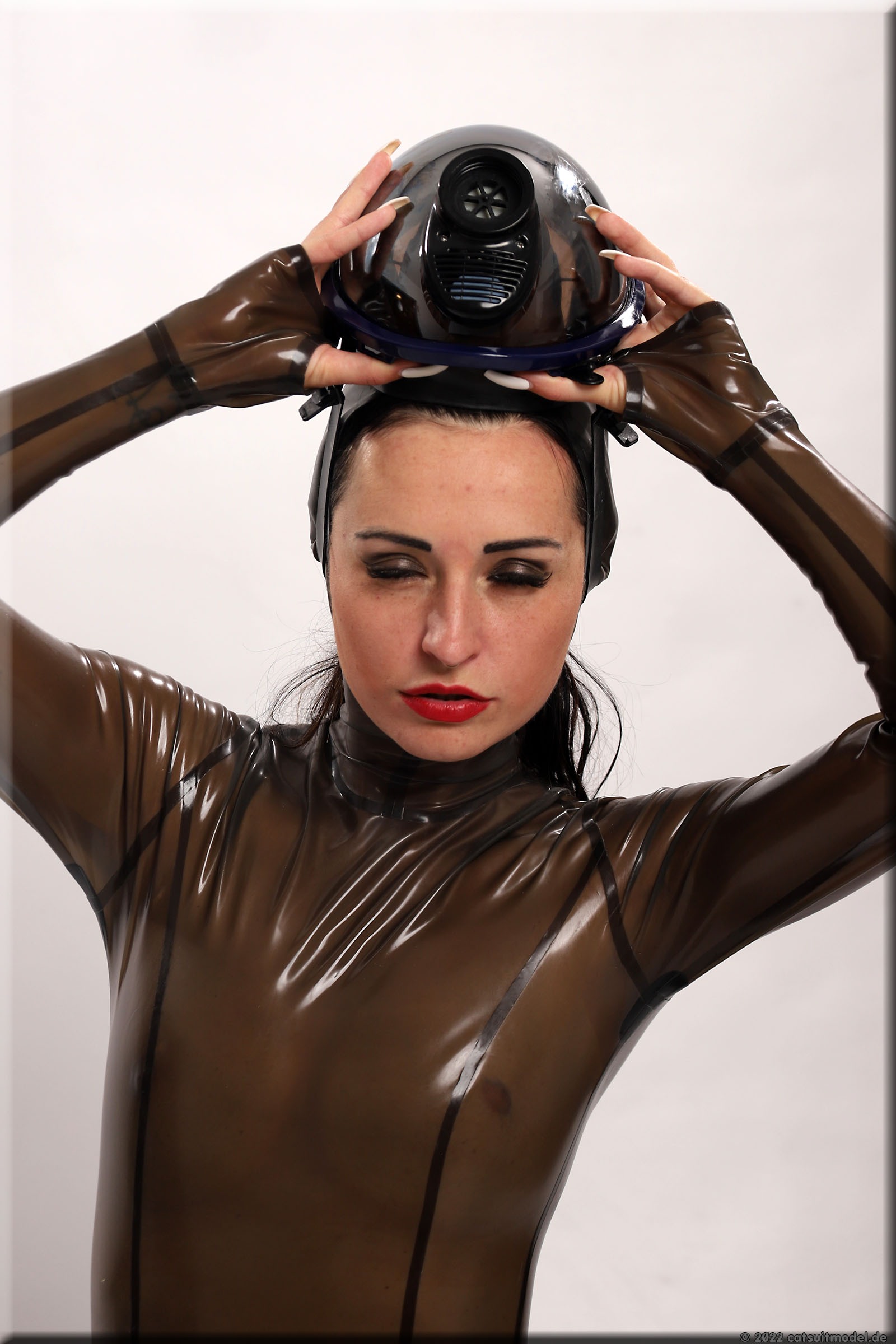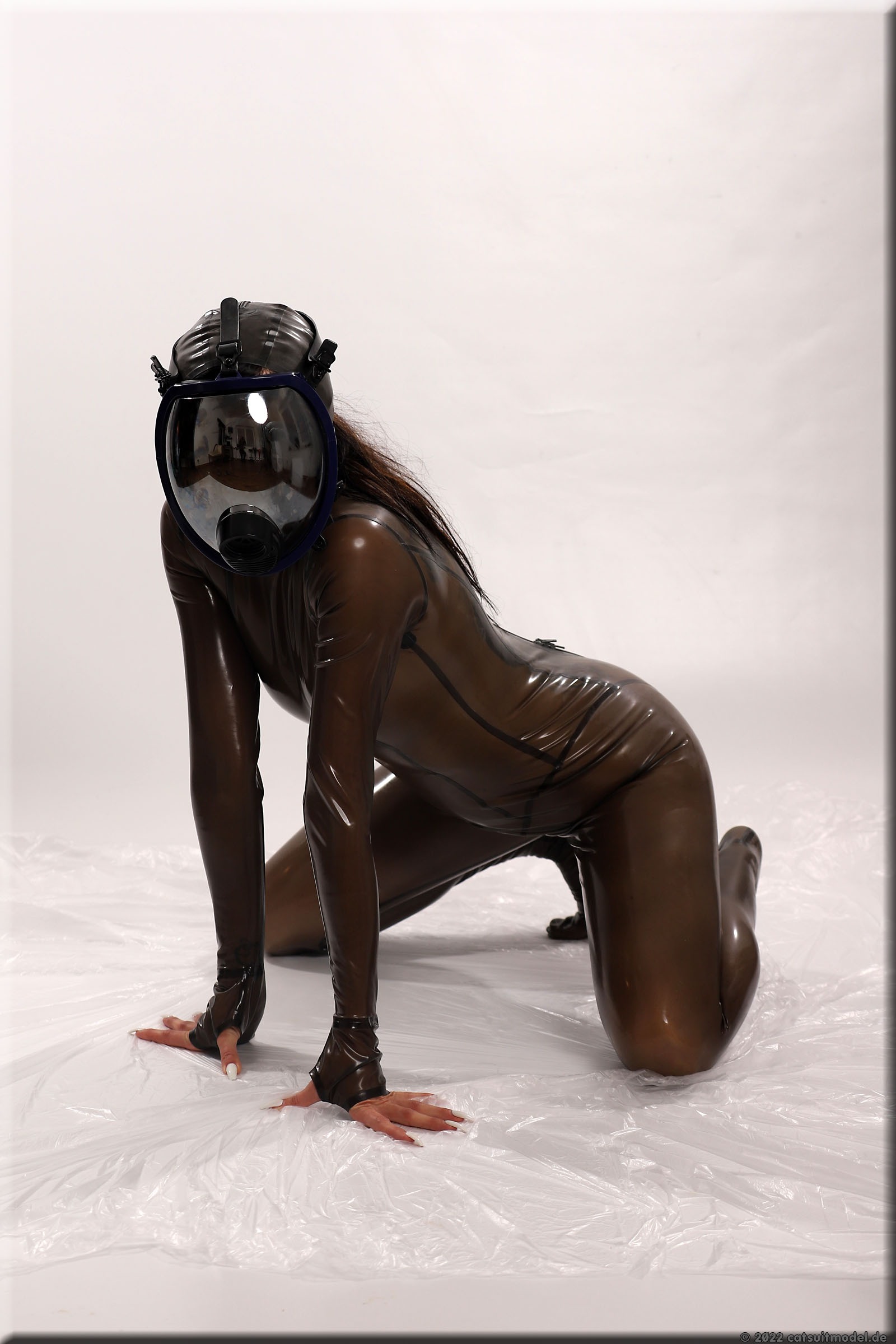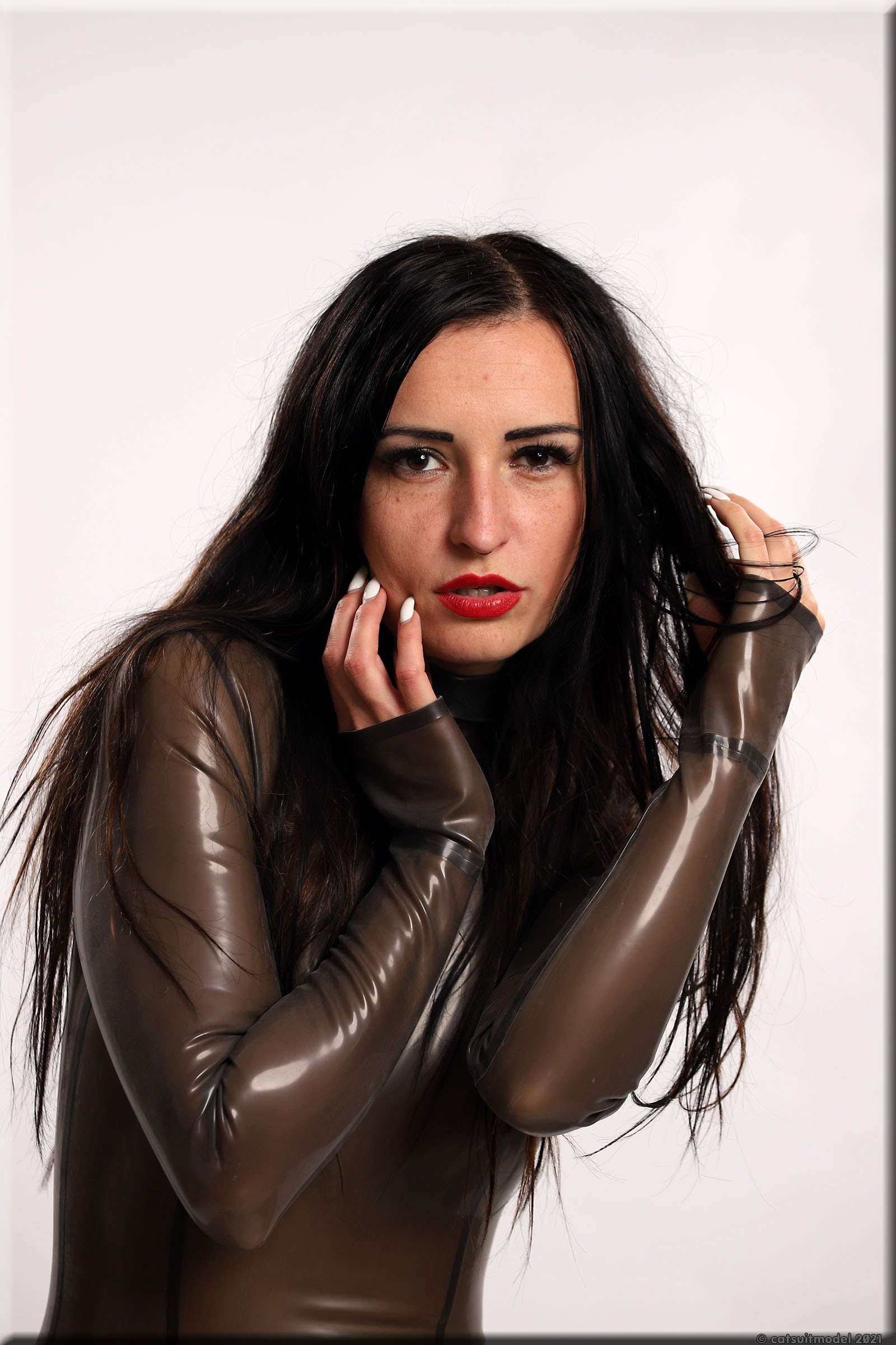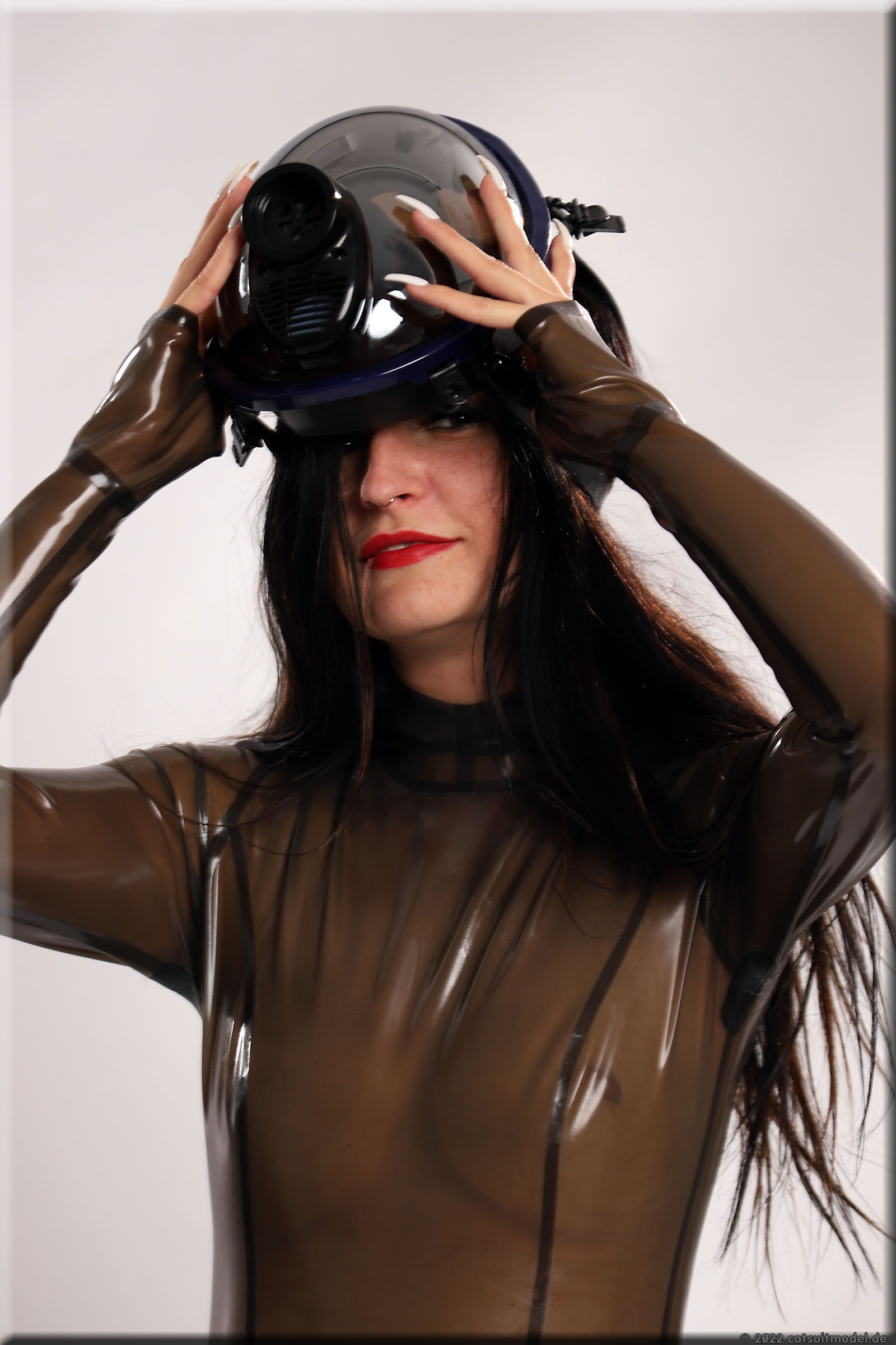 Kira trägt heute einen transparenten, dennoch fast allumschliessenden Catsuit in rauchgrau transparent von Latexcrazy.