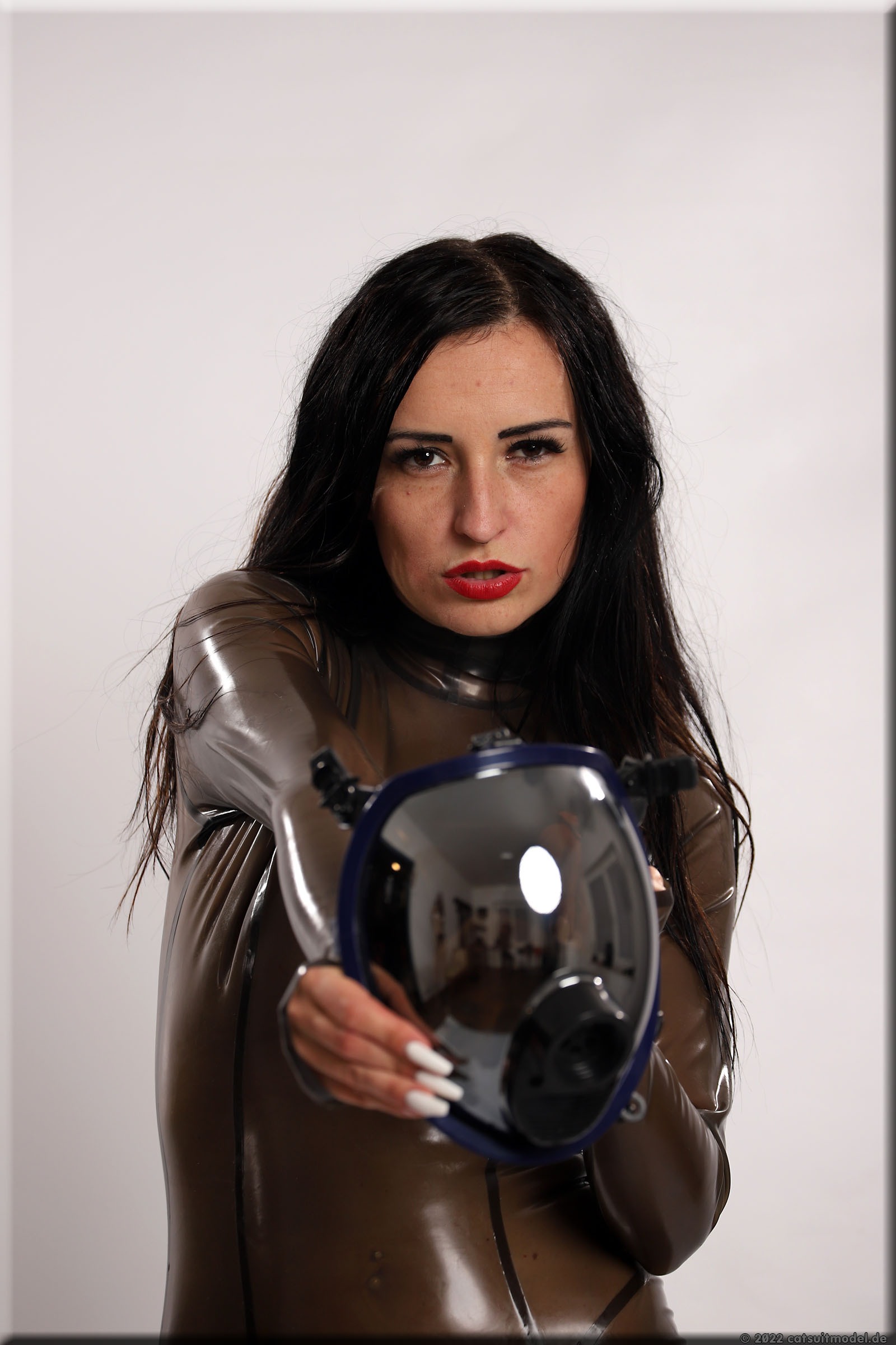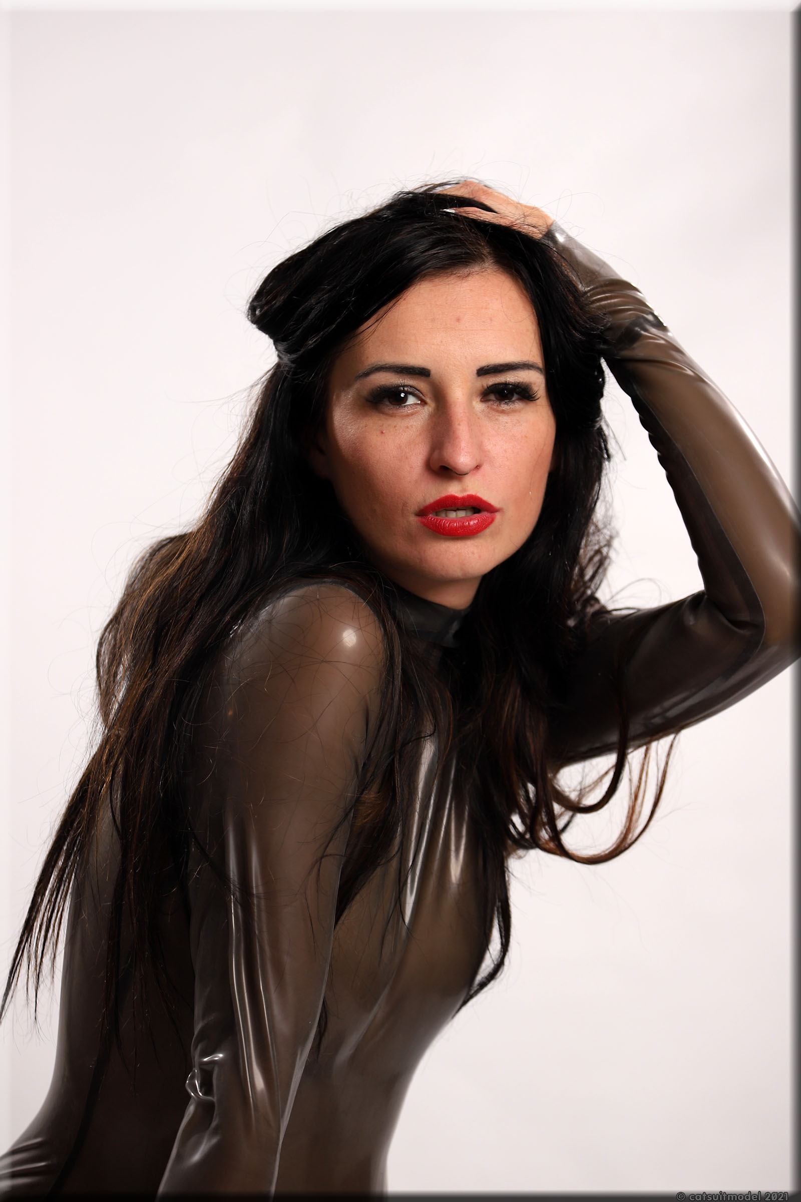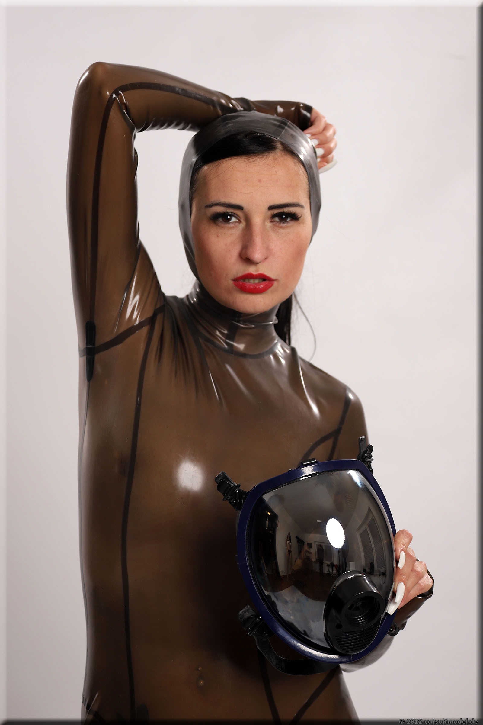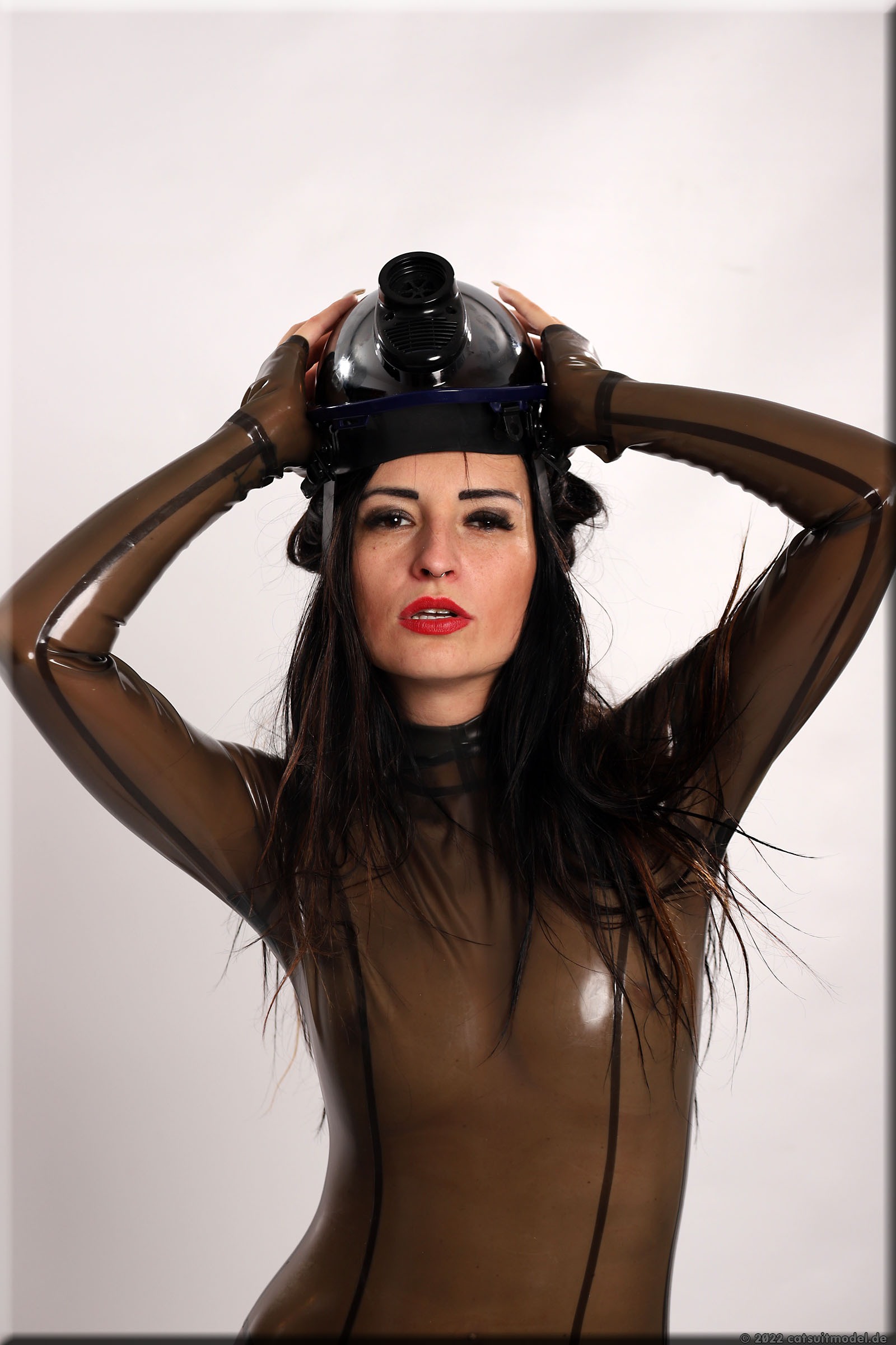 Kira trägt heute einen transparenten, dennoch fast allumschliessenden Catsuit in rauchgrau transparent von Latexcrazy.