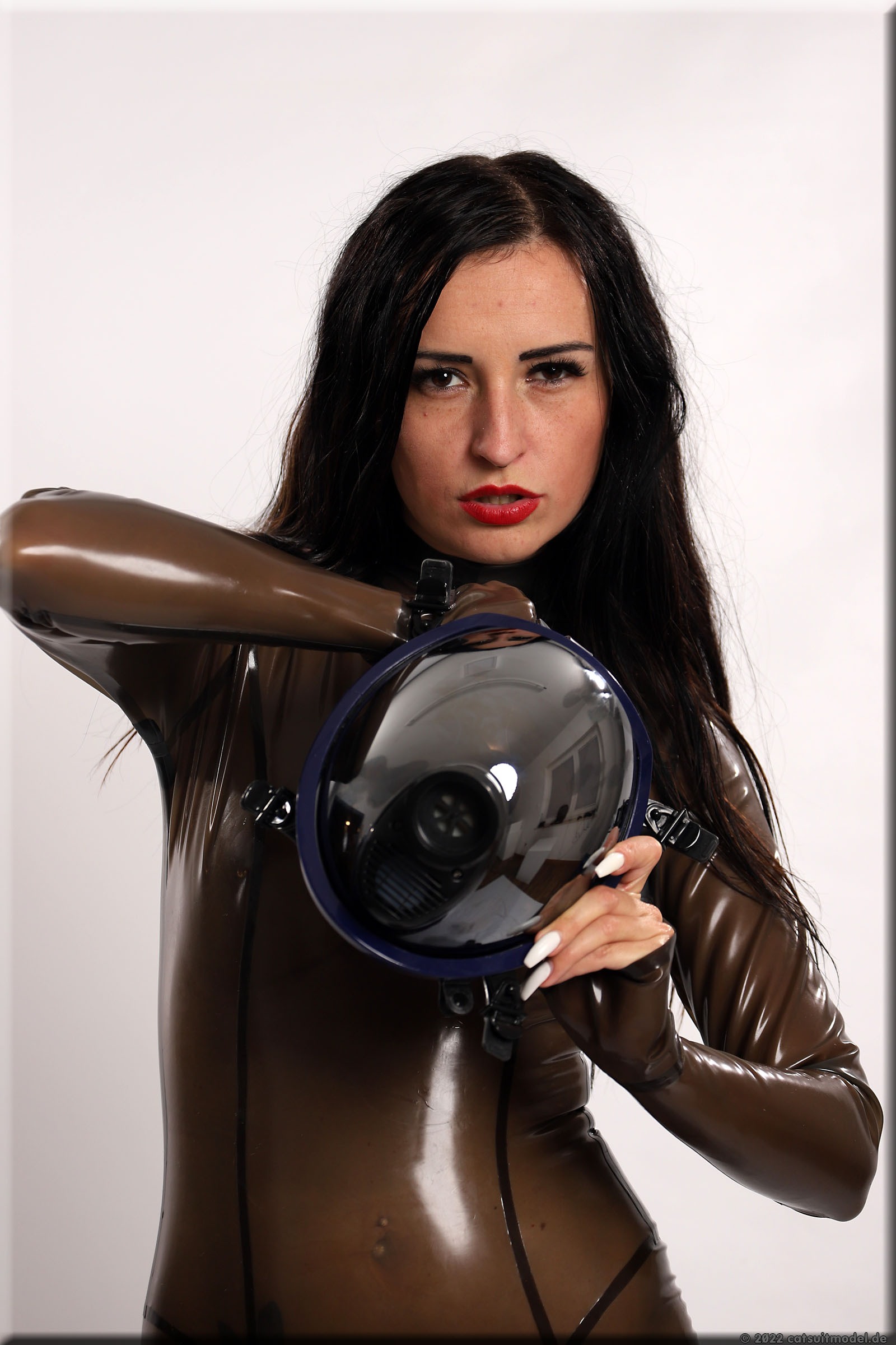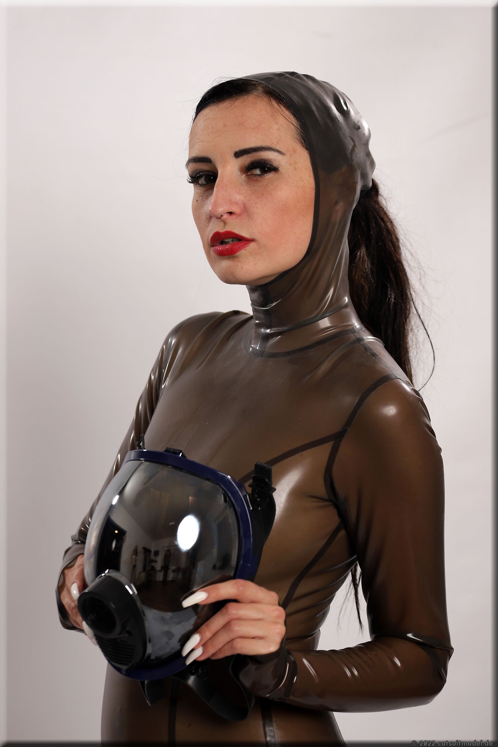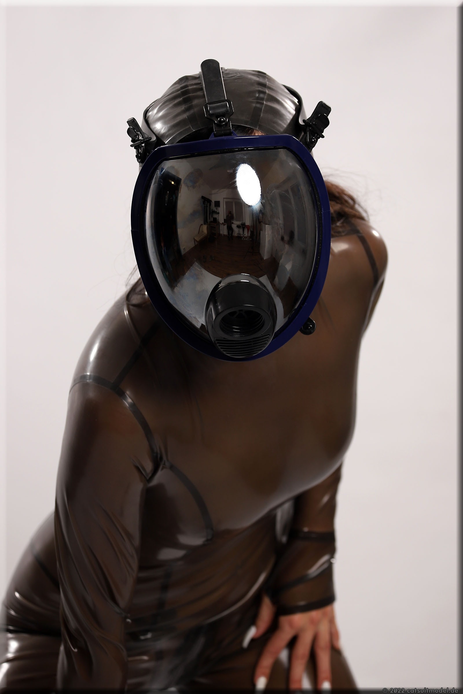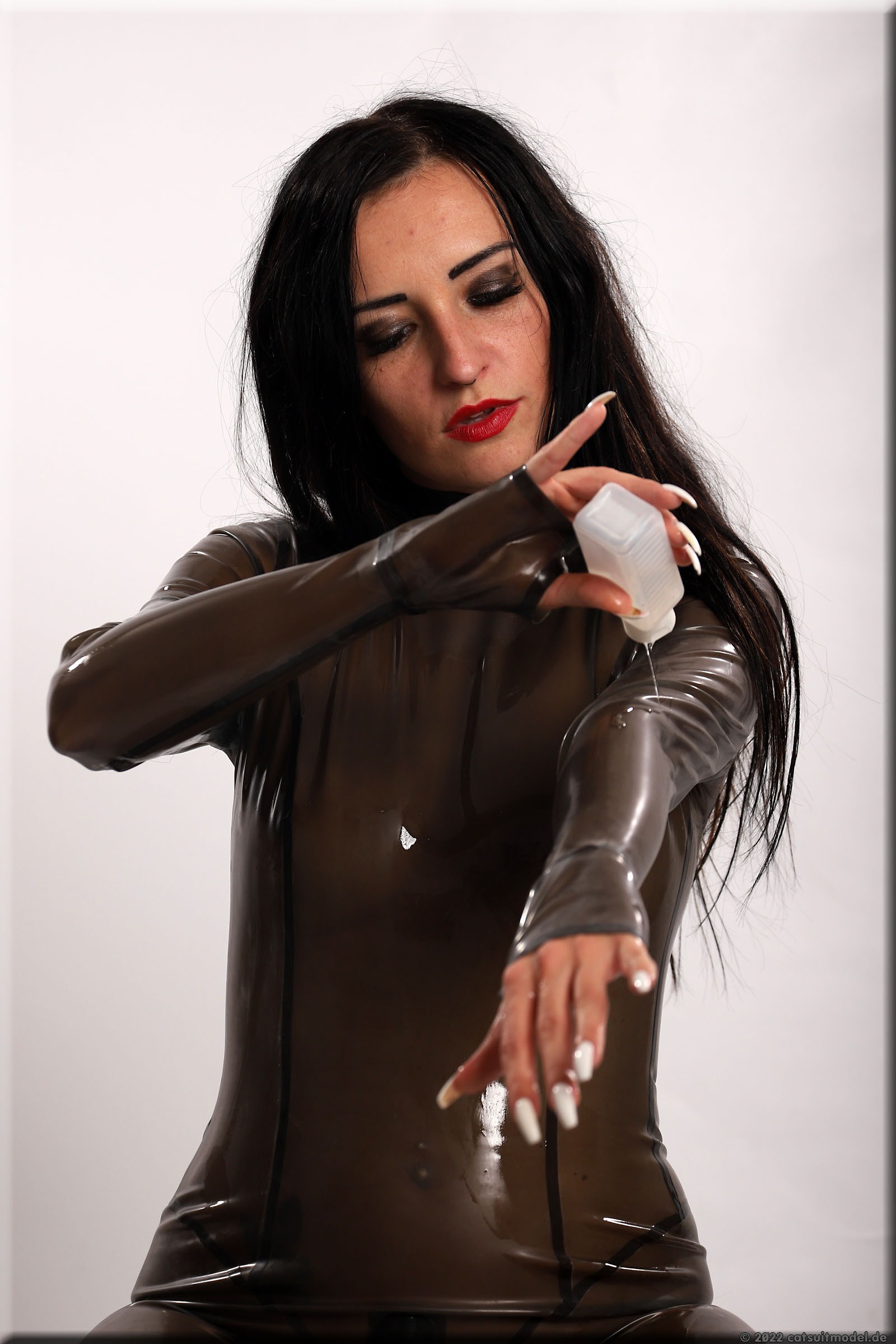 Kira trägt heute einen transparenten, dennoch fast allumschliessenden Catsuit in rauchgrau transparent von Latexcrazy.