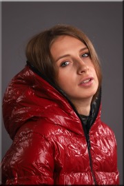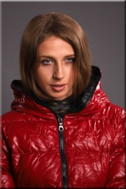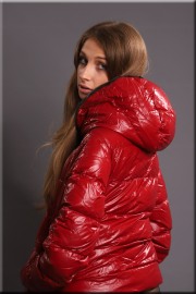 Anna im kaum zu sehenden Latexcatsuit und in einer Daunenjacke von Duvetica.