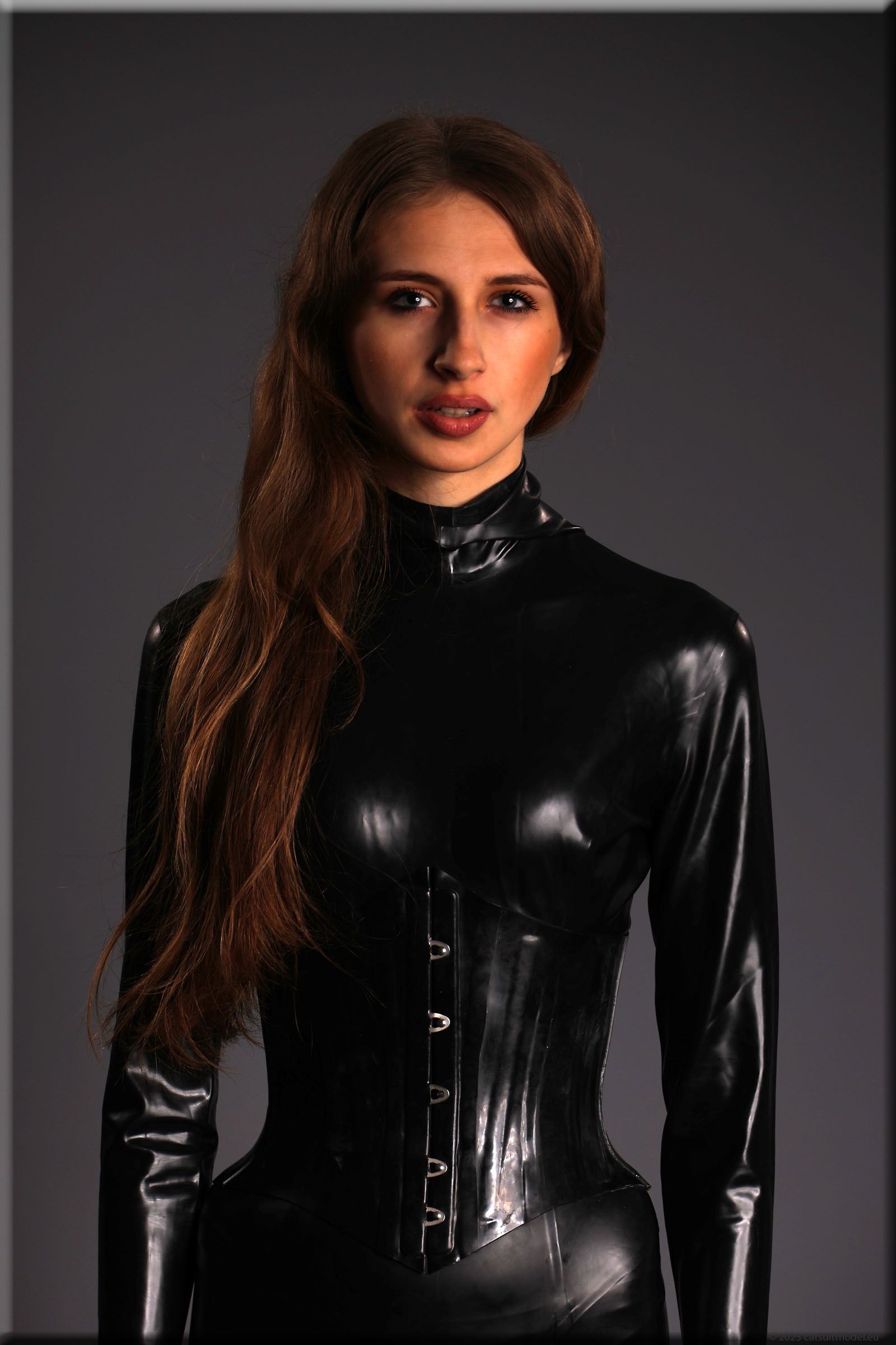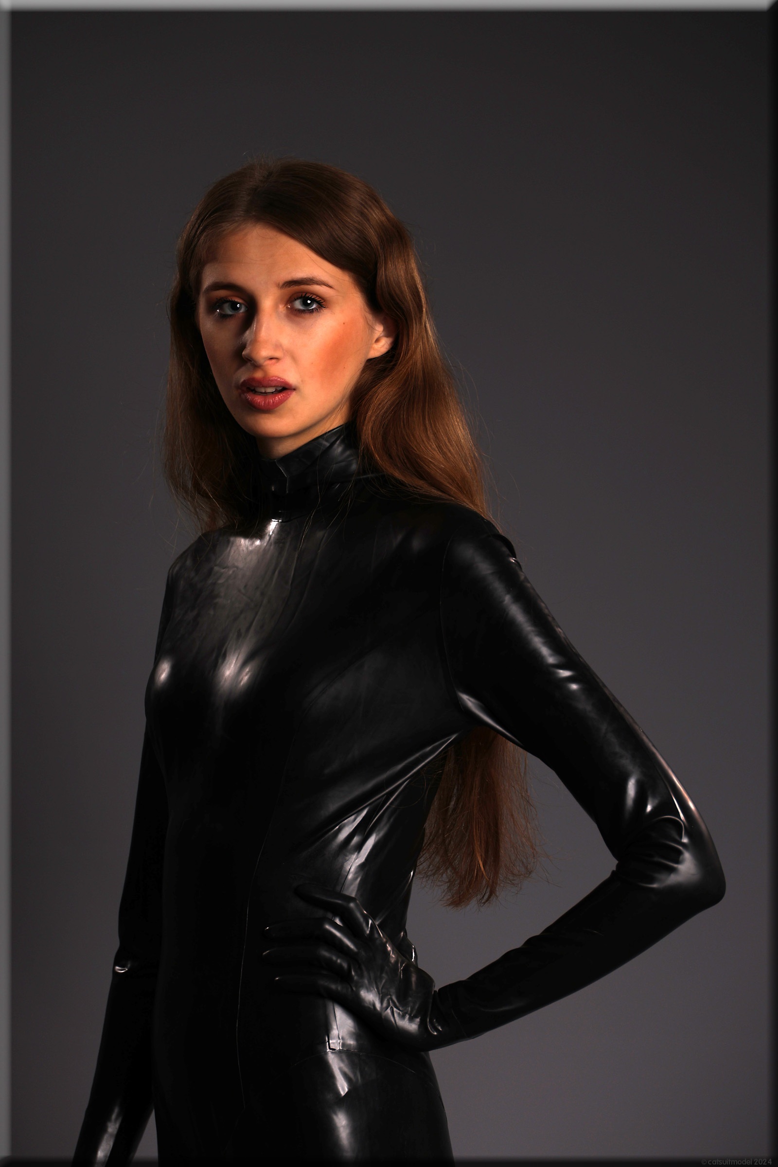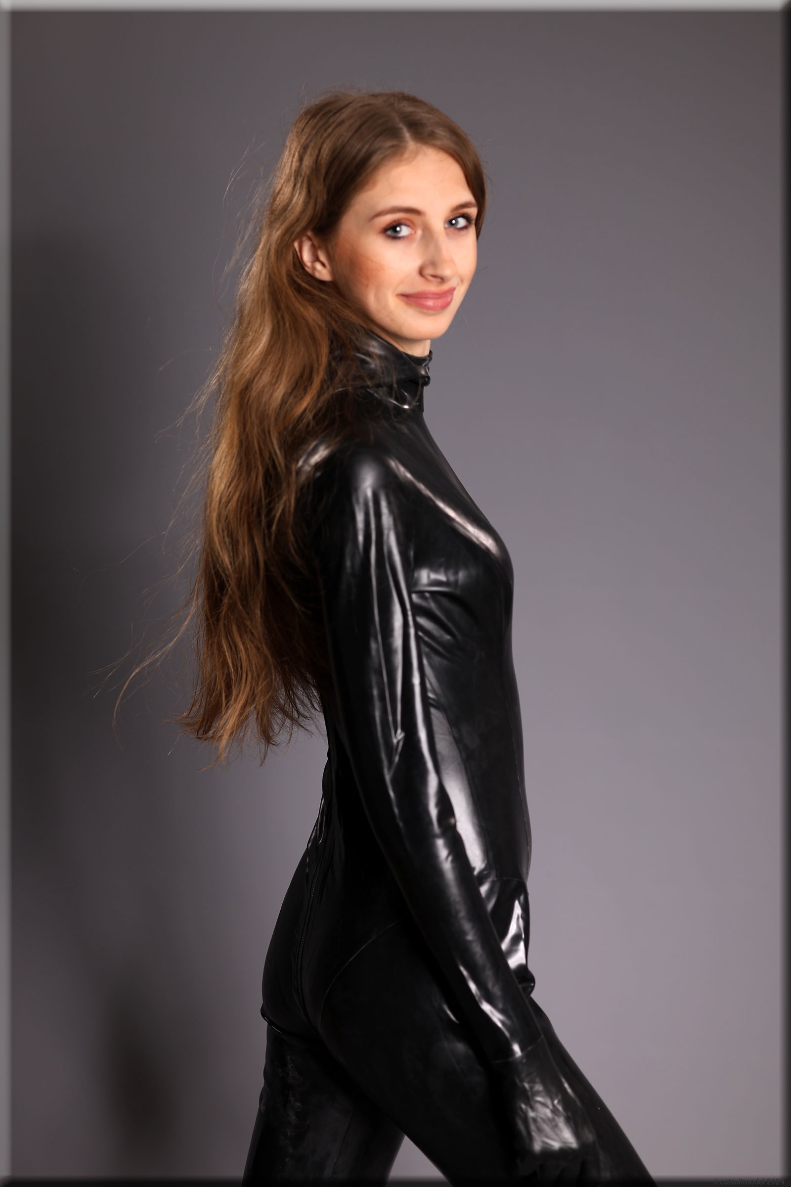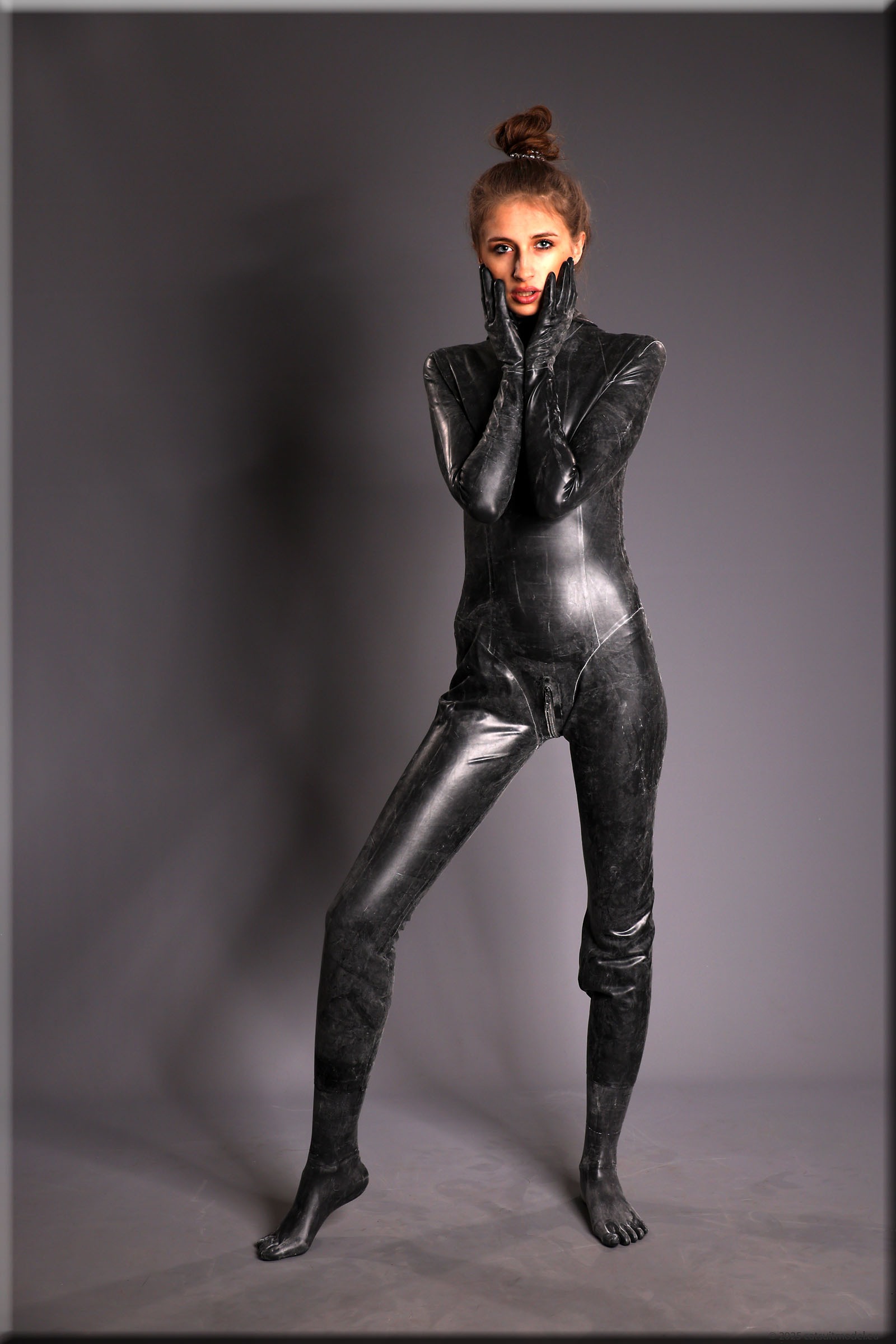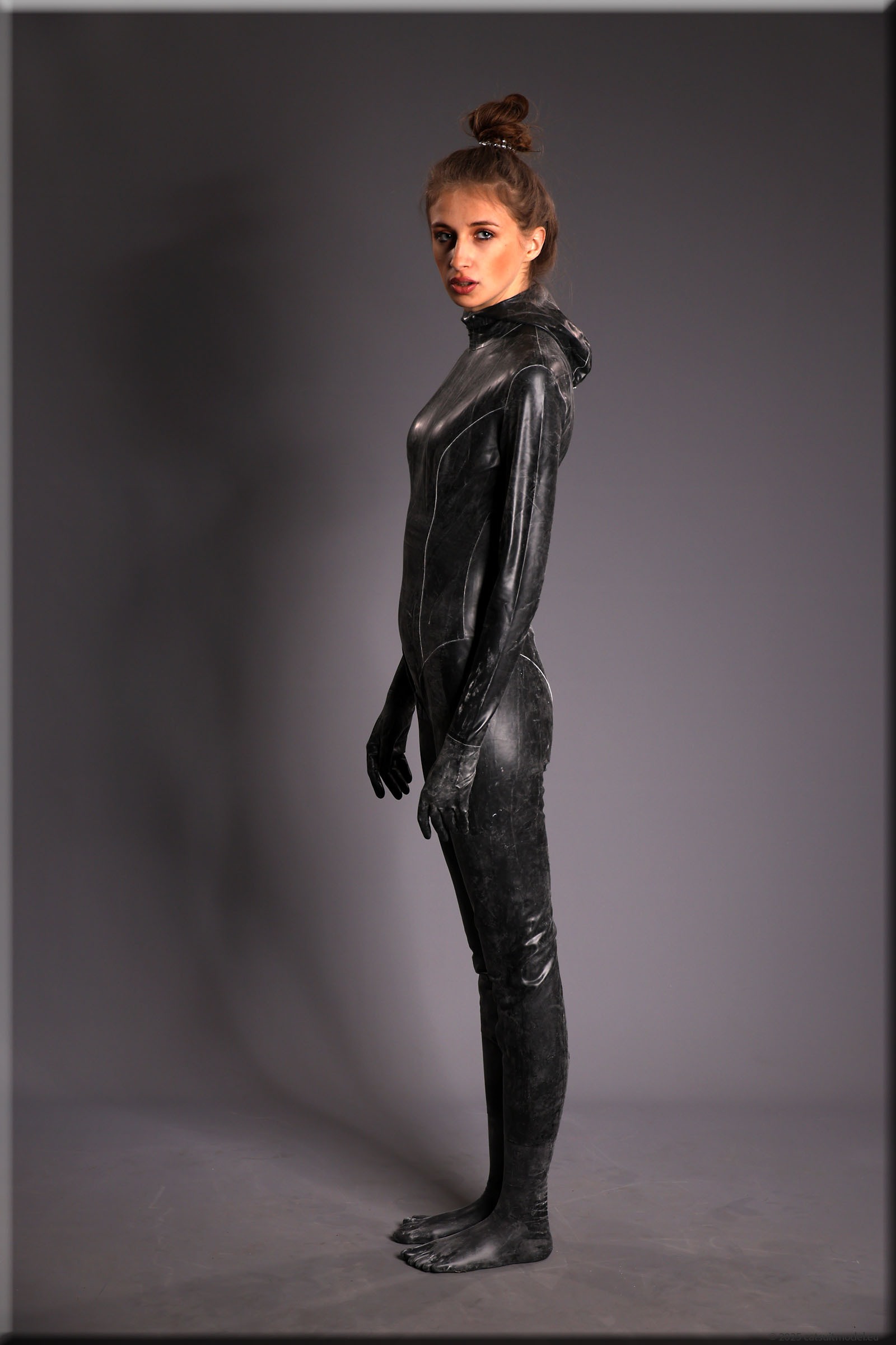 Anna im vermutlich ältesten Catsuit, den ich habe – ein Produkt von Latexcrazy. Bilder von ihm gibt es schon 2012 mit J. Leider habe ich ihn einmal verborgt und mein „Borgepartner“ hat die Füßlinge abgeschnitten. Ich hatte Sorgen, dass das Material nach 12 Jahren weich und brüchig ist, aber es ging gut.