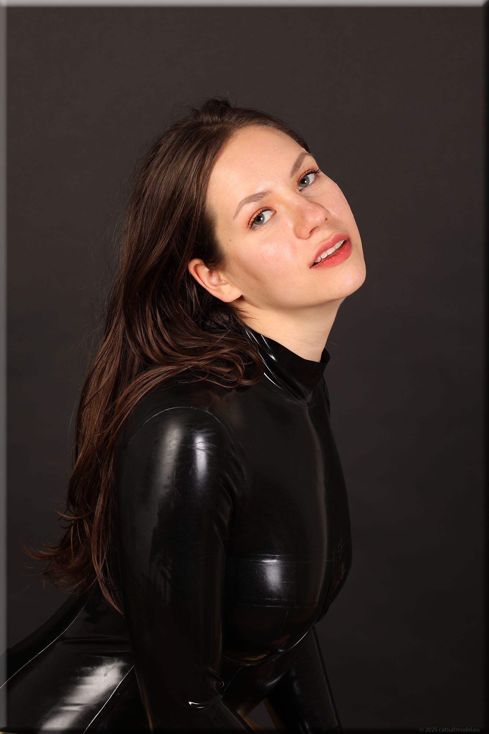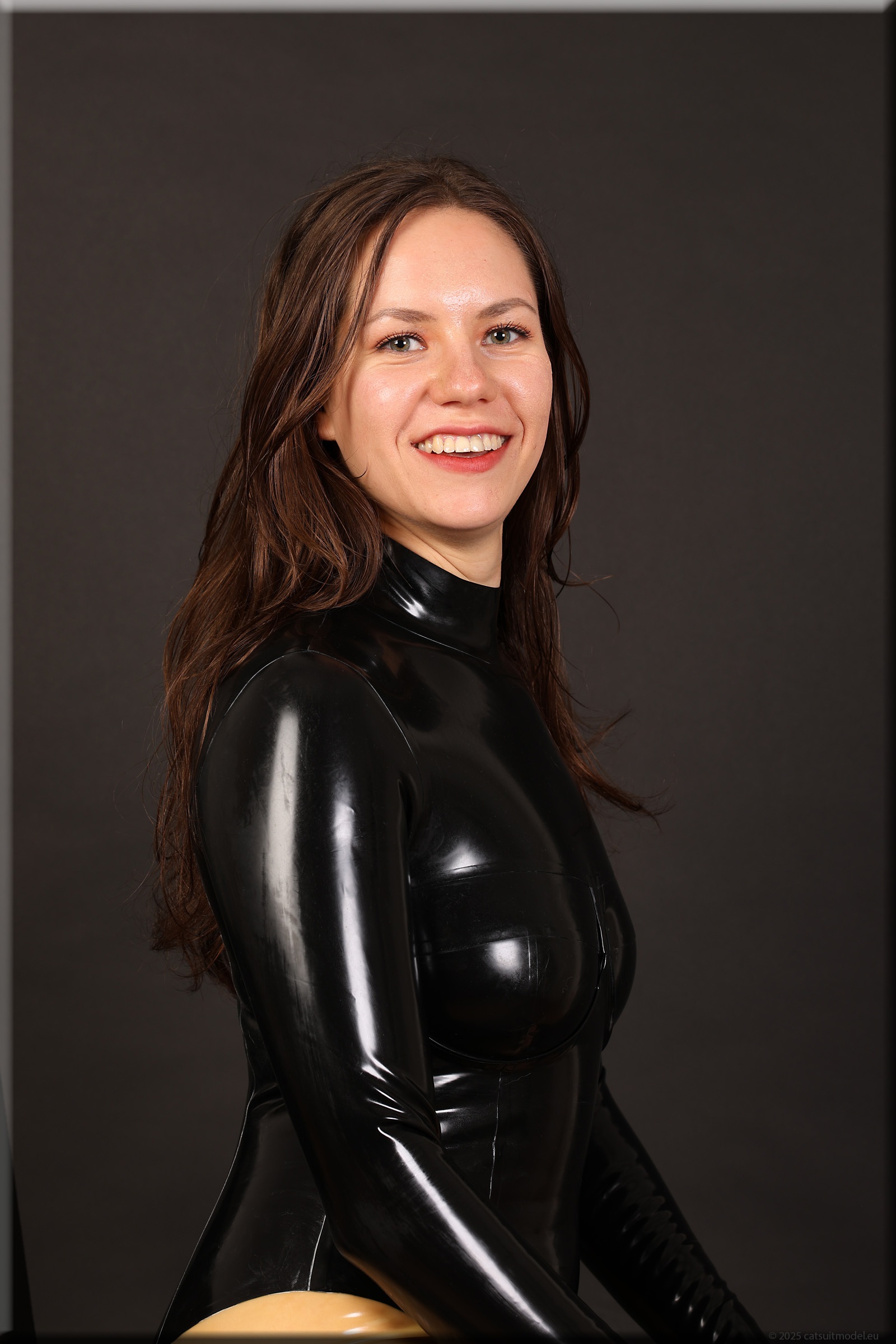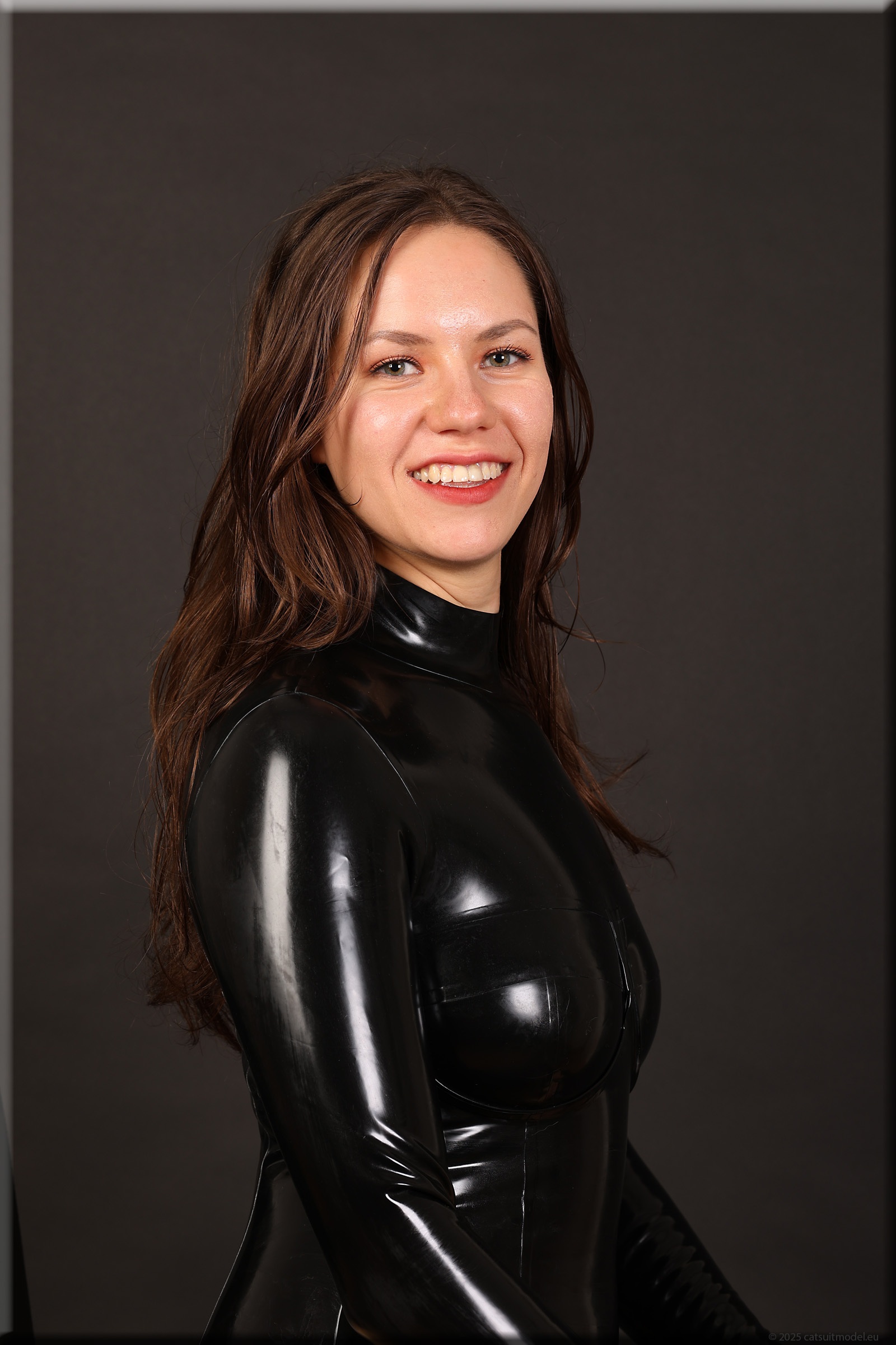 Beim 15. Shooting wird es schwer, neue Kleidung für Polina zu finden. Aber ich mag ihr Lächeln. Catsuit „underwired“ von Latexcrazy. Neu 126-125.