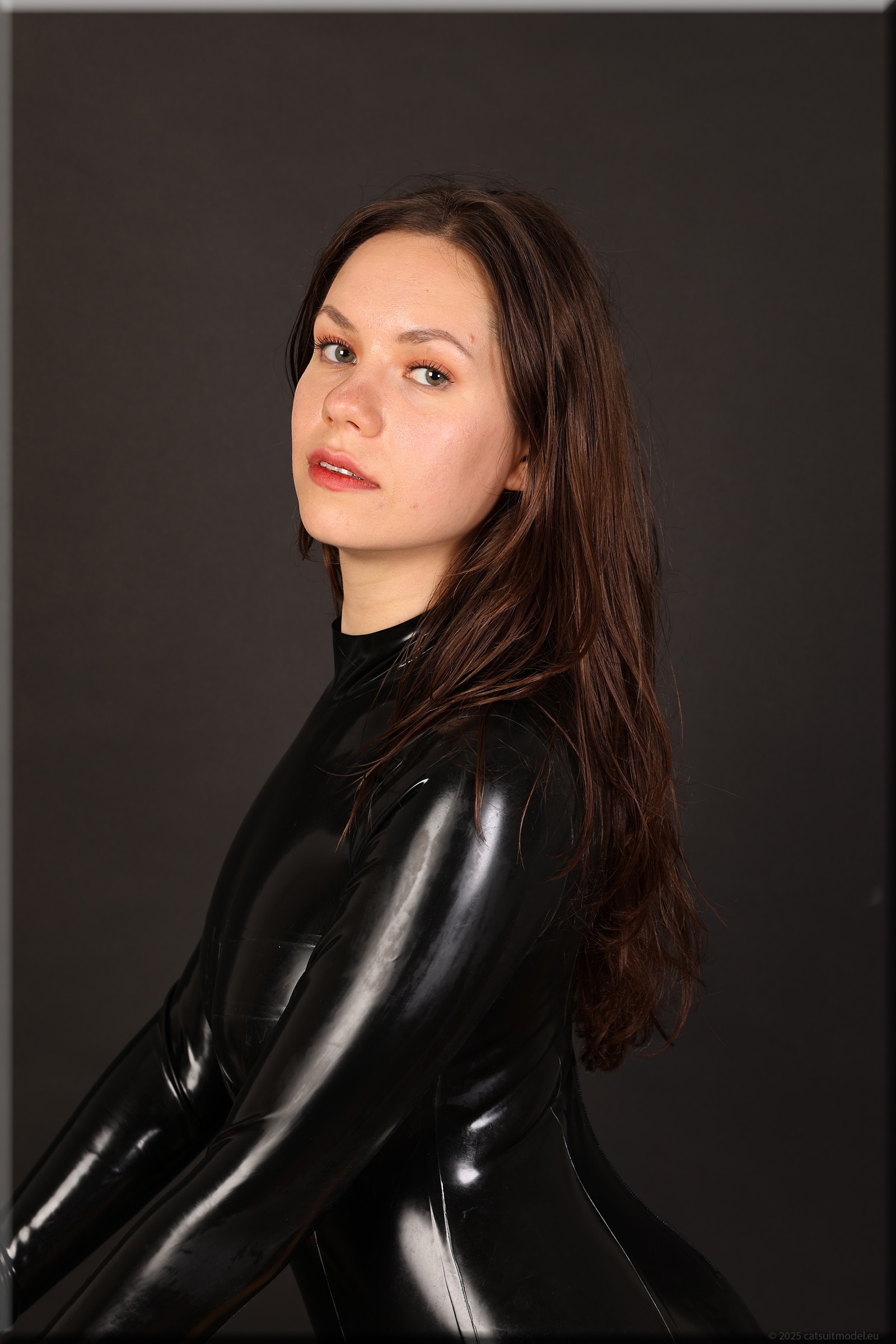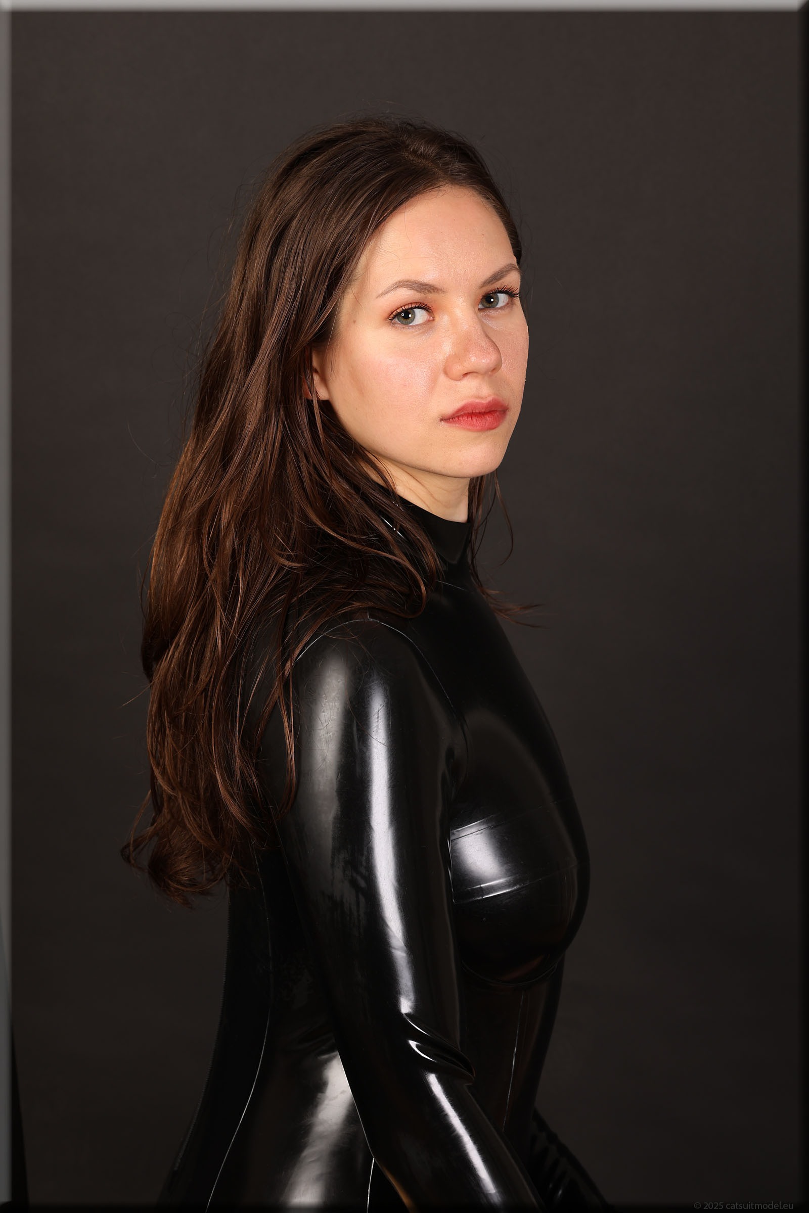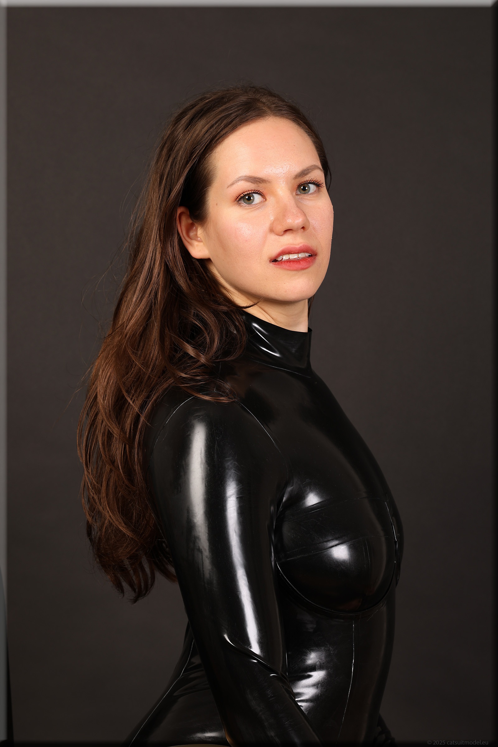 Beim 15. Shooting wird es schwer, neue Kleidung für Polina zu finden. Aber ich mag ihr Lächeln. Catsuit „underwired“ von Latexcrazy. Neu 126-125.