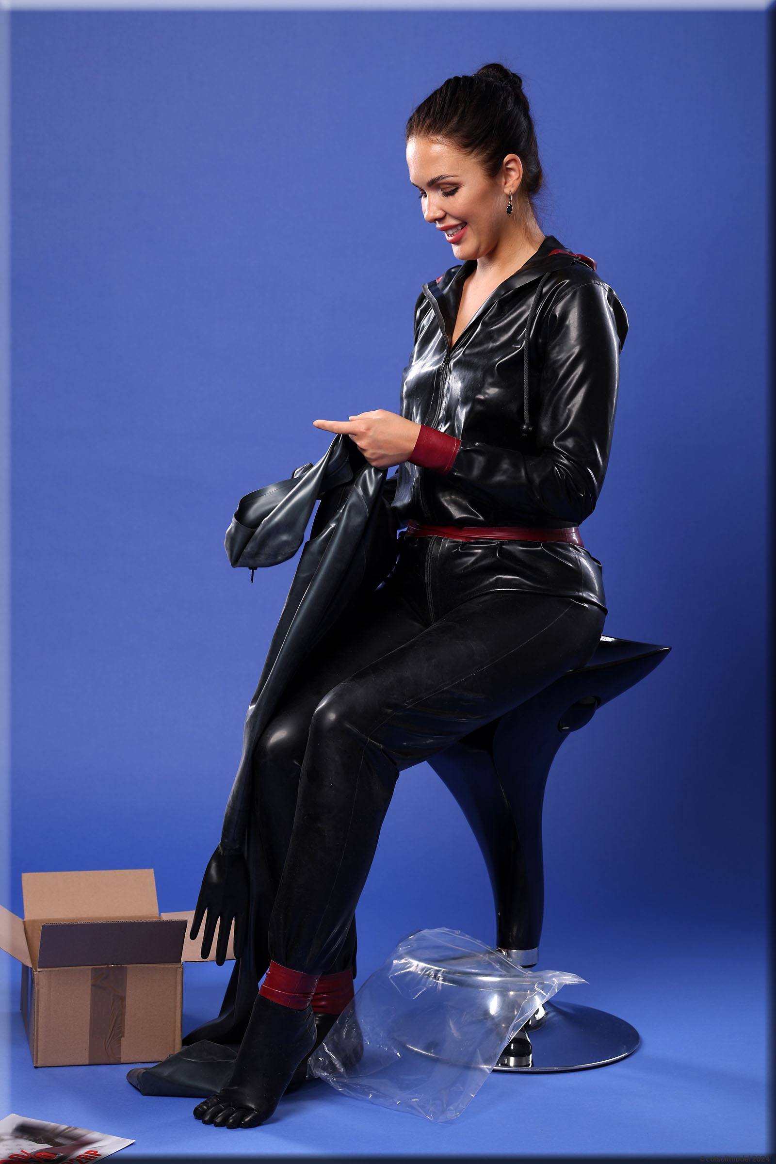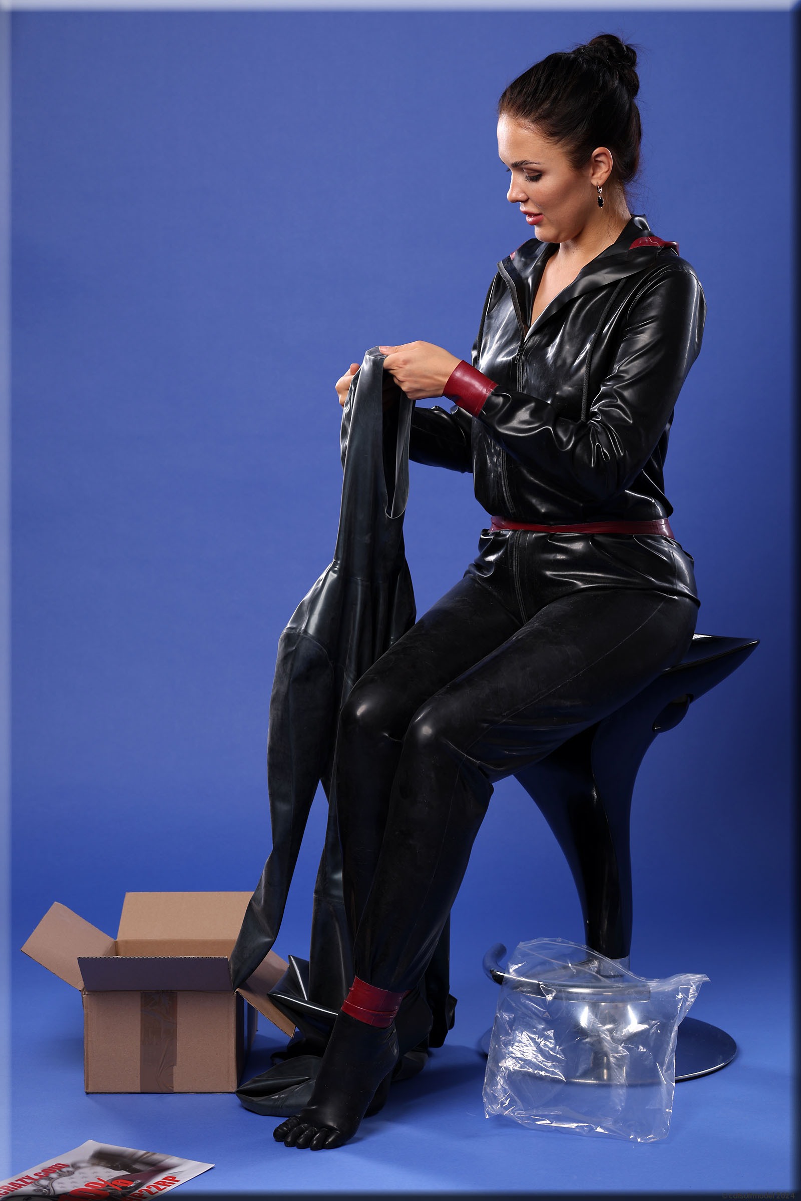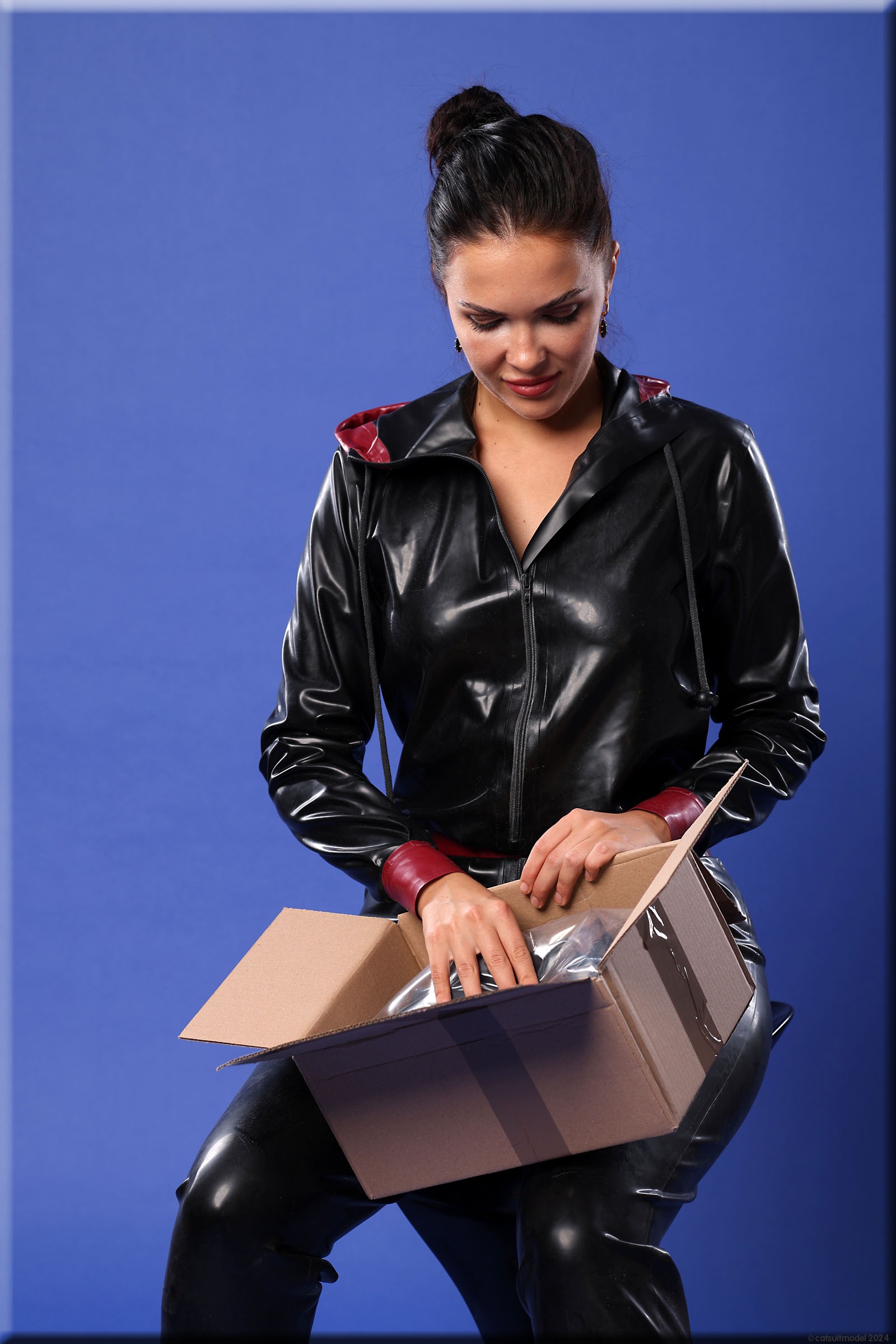 Ein schwarzer Catsuit mit Handschuhen, Zehensocken und Haube gehört zwar zu meinen Lieblingsphantasien, er war aber schon in die Jahre gekommen. Das Päckchen von Latexcrazy kam knapp eine Stunde vor dem Shooting aus der Packstation. So durfte Olga das beliebte Influenzer-Spiel : „unboxing“ spielen. Neu ab 386.