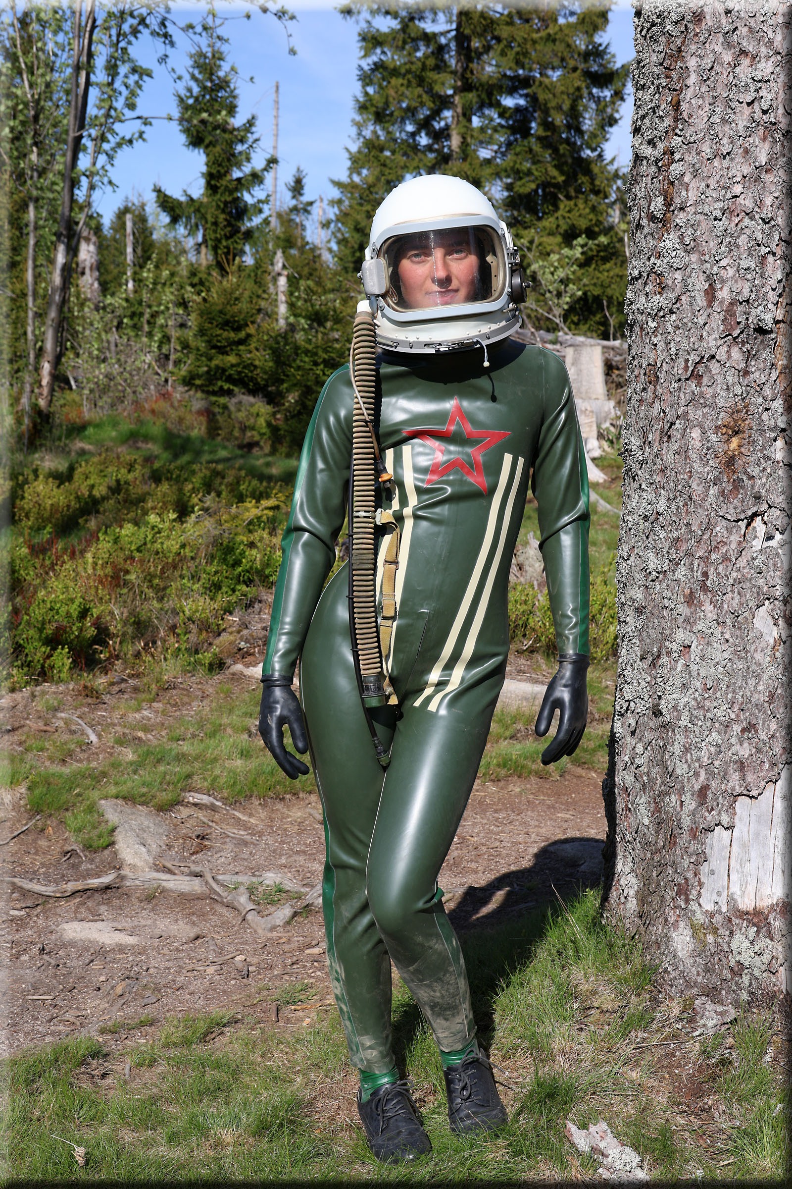 Ja, und ich mag den Jetfighter immer noch sehr sehr, obwohl ein allgemein unbeliebter roter Stern hinten drauf ist. Ich hab auch wieder Socken dazu und lass sie an den einen ankleben. Der zweite bekommt ein richtiges Upgrade: Socken wieder dran, Hals um 6 cm verlängert, damit der Helmring nicht so hart auf die Schultern drückt (es gab 6 cm Latexstreifen im Originalmaterial) und eine Beurteilung, ob man den Nacken-zu-Nabel-Reißverschluss in einen Schulter-zu-Schulter-Reißverschluss umbauen kann.