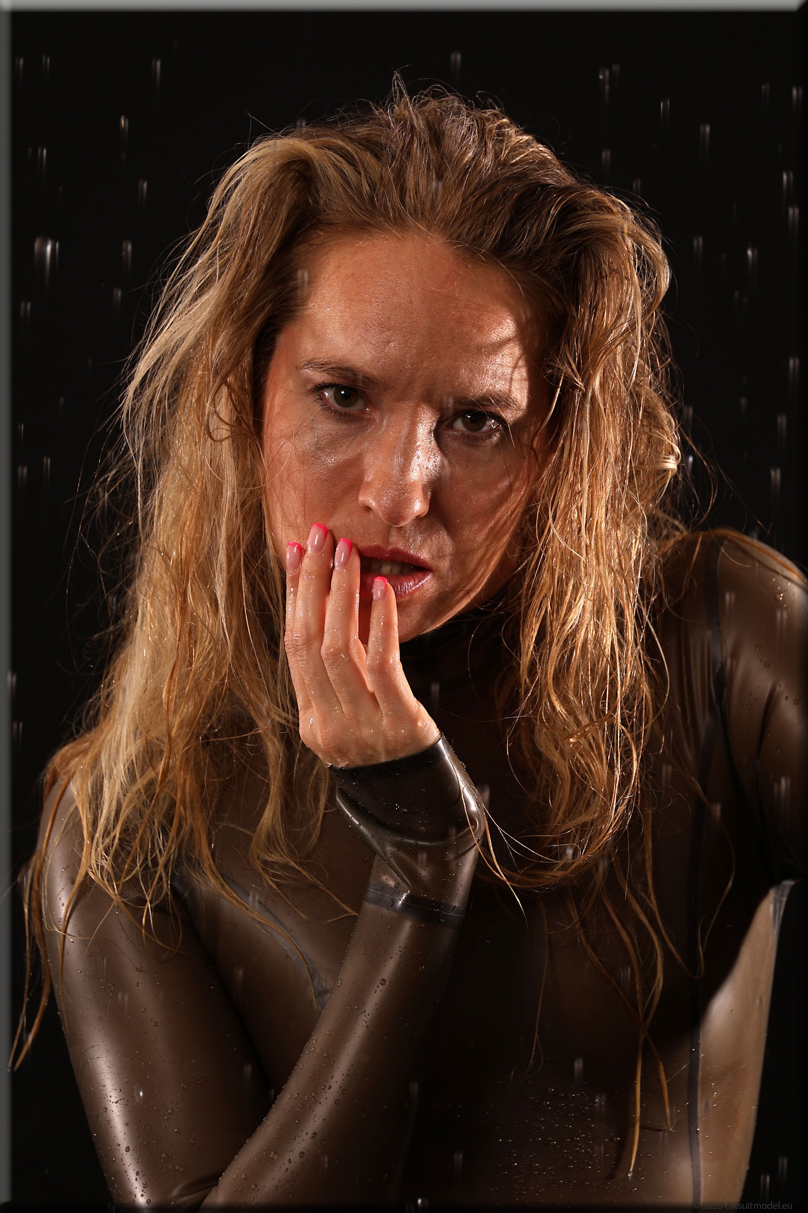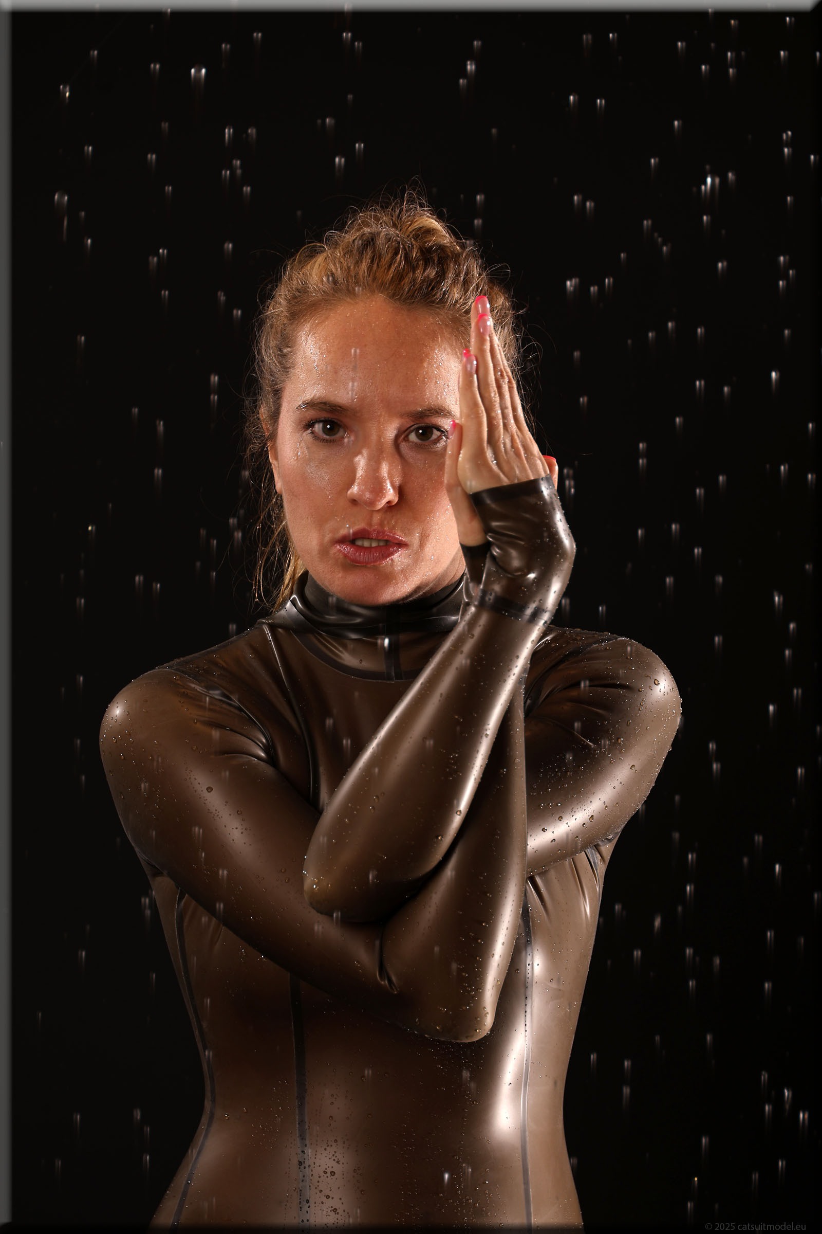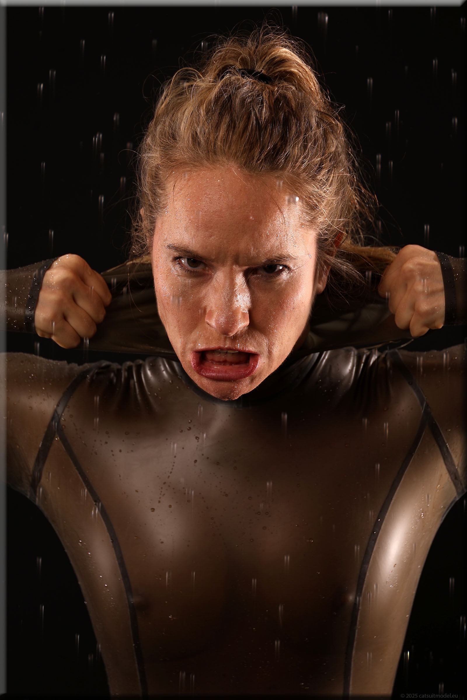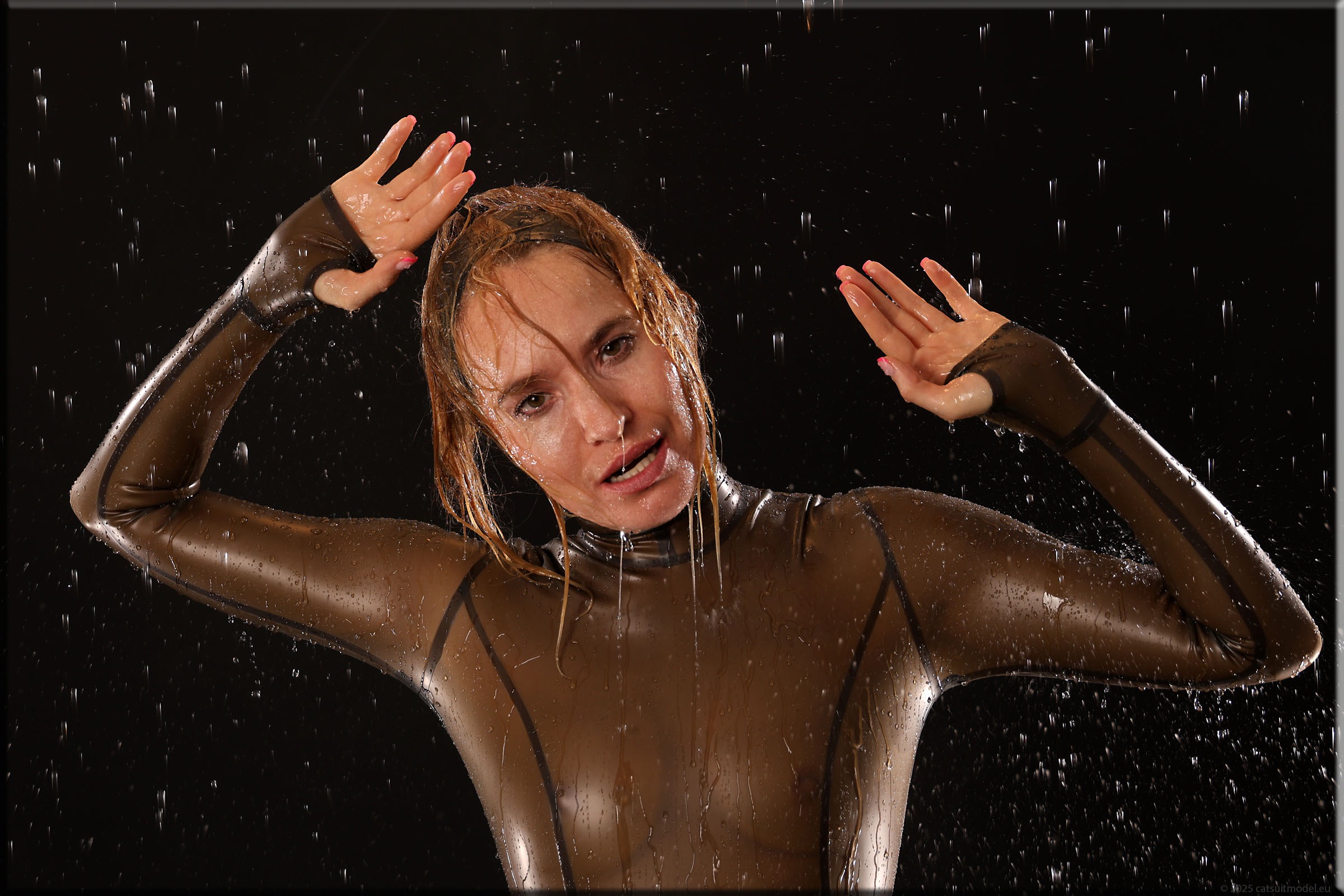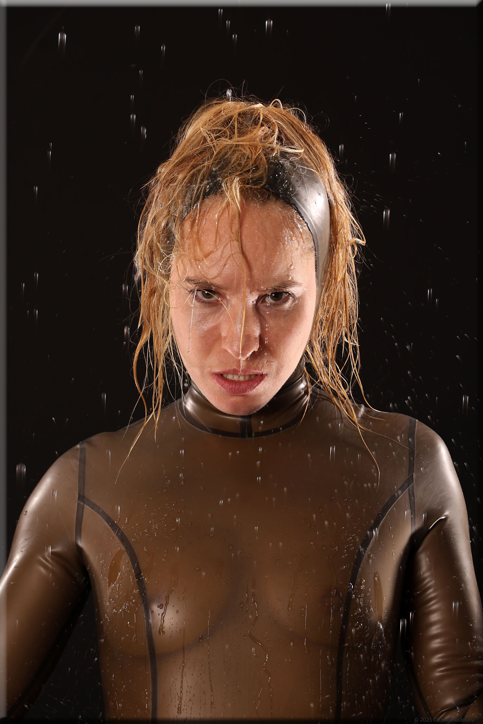 Als erstes musste Maria in den transparenten Catsuit von Latexcrazy steigen, dann hieß es „Wasser marsch!“ und sie musste in 25° warmem Wasser posieren. Es ist laut und anstrengend. Neu ab 326.