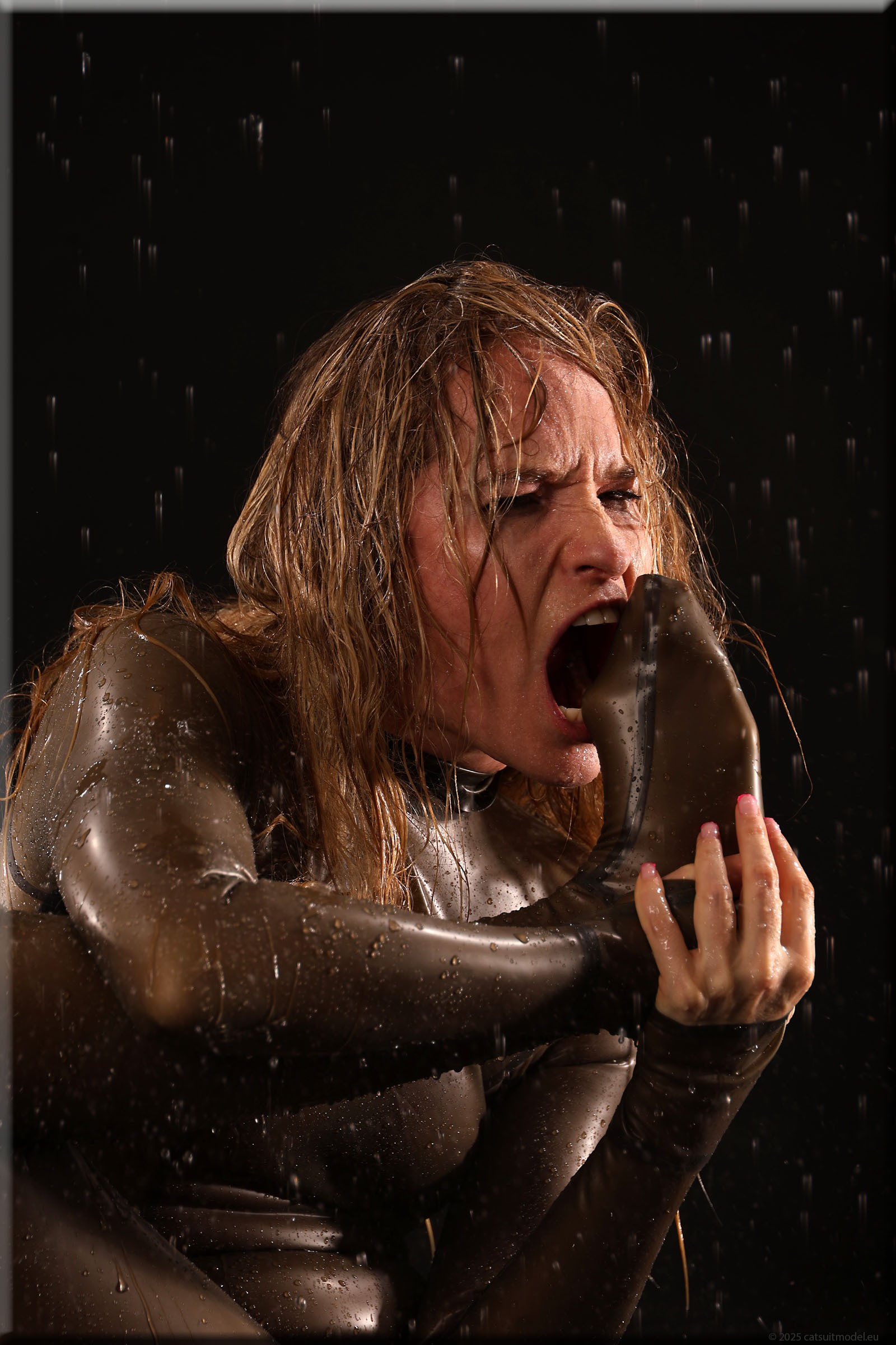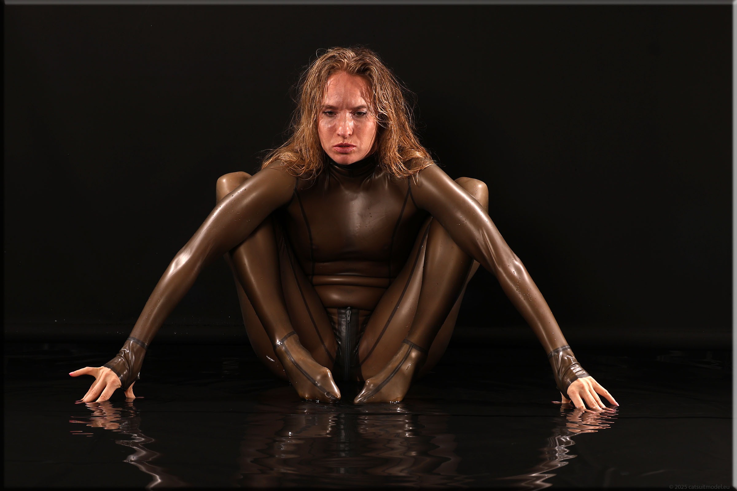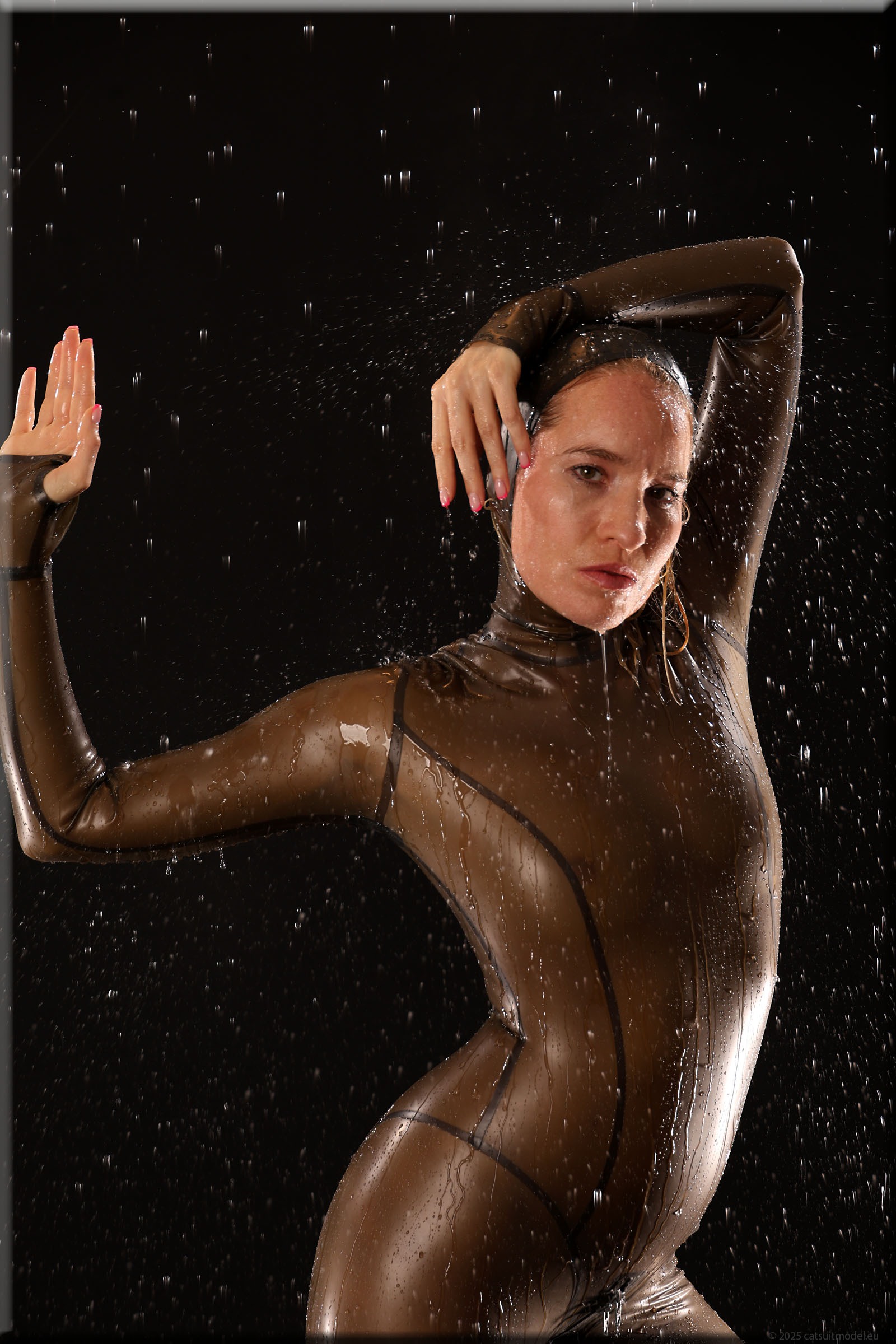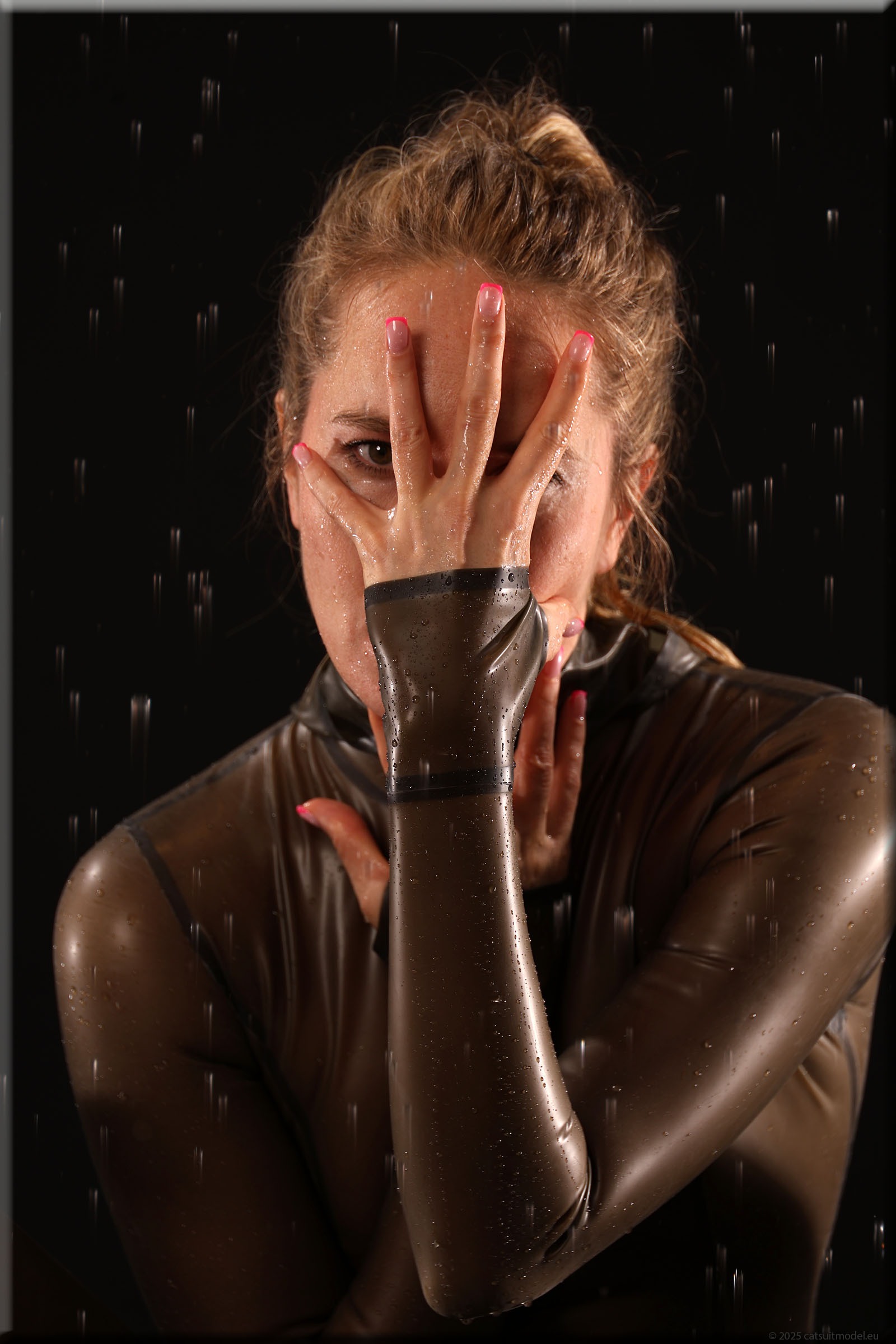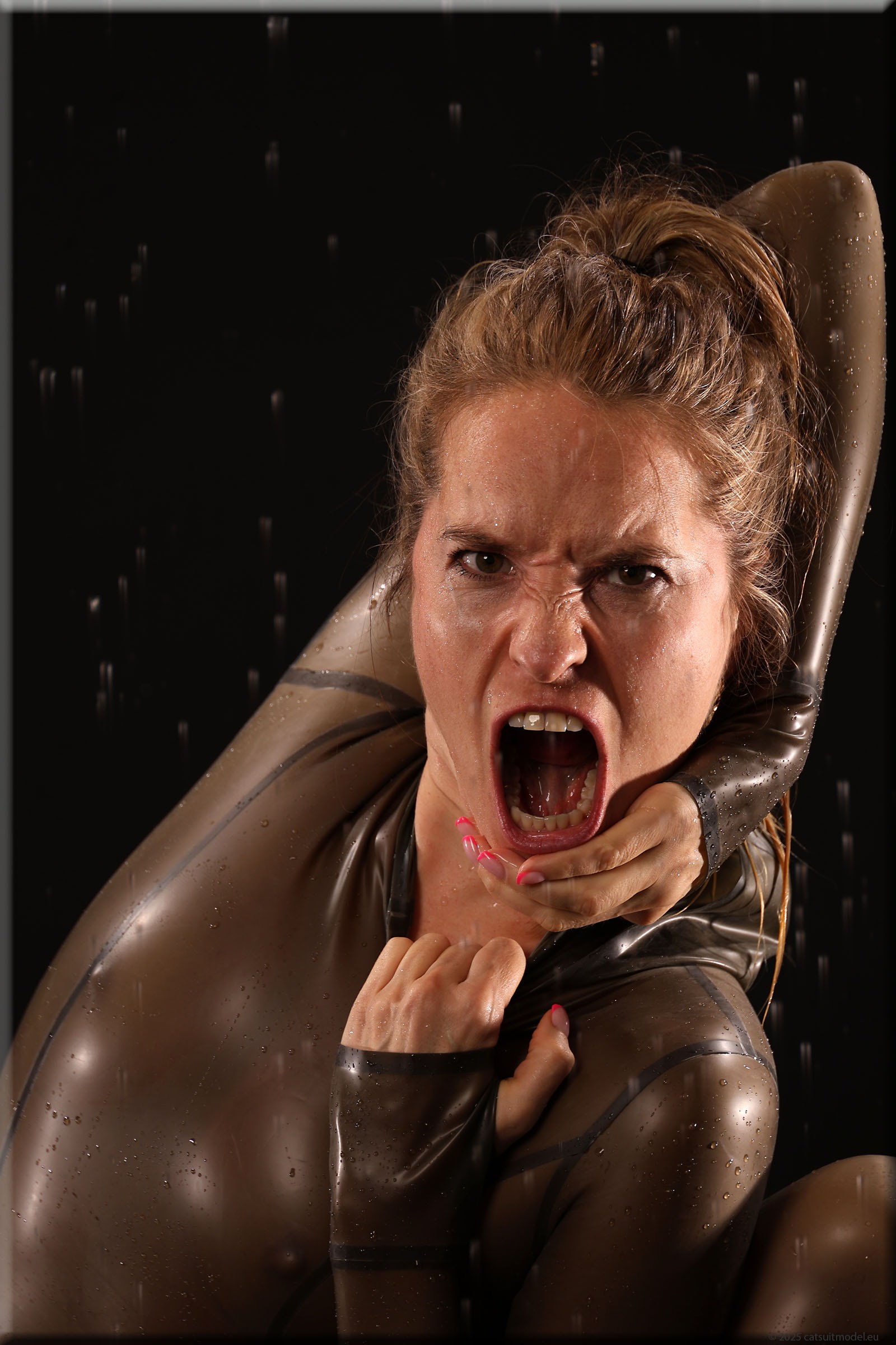 Als erstes musste Maria in den transparenten Catsuit von Latexcrazy steigen, dann hieß es „Wasser marsch!“ und sie musste in 25° warmem Wasser posieren. Es ist laut und anstrengend. Neu ab 326.