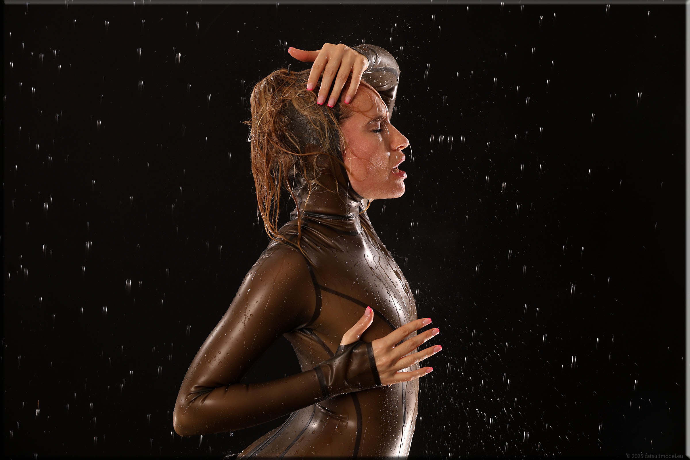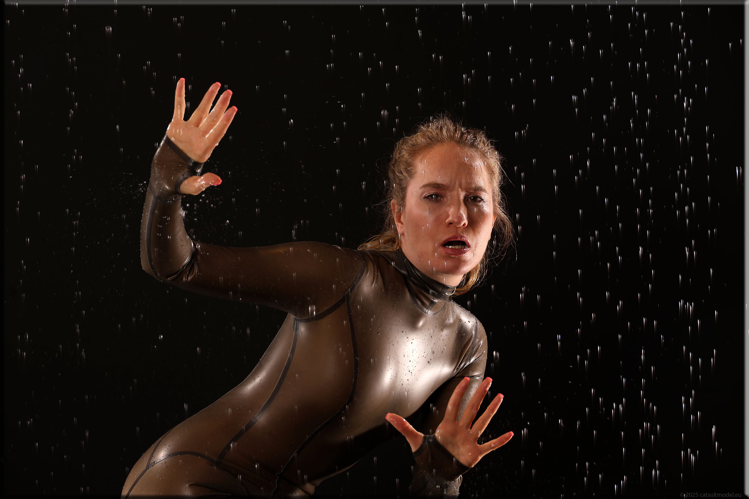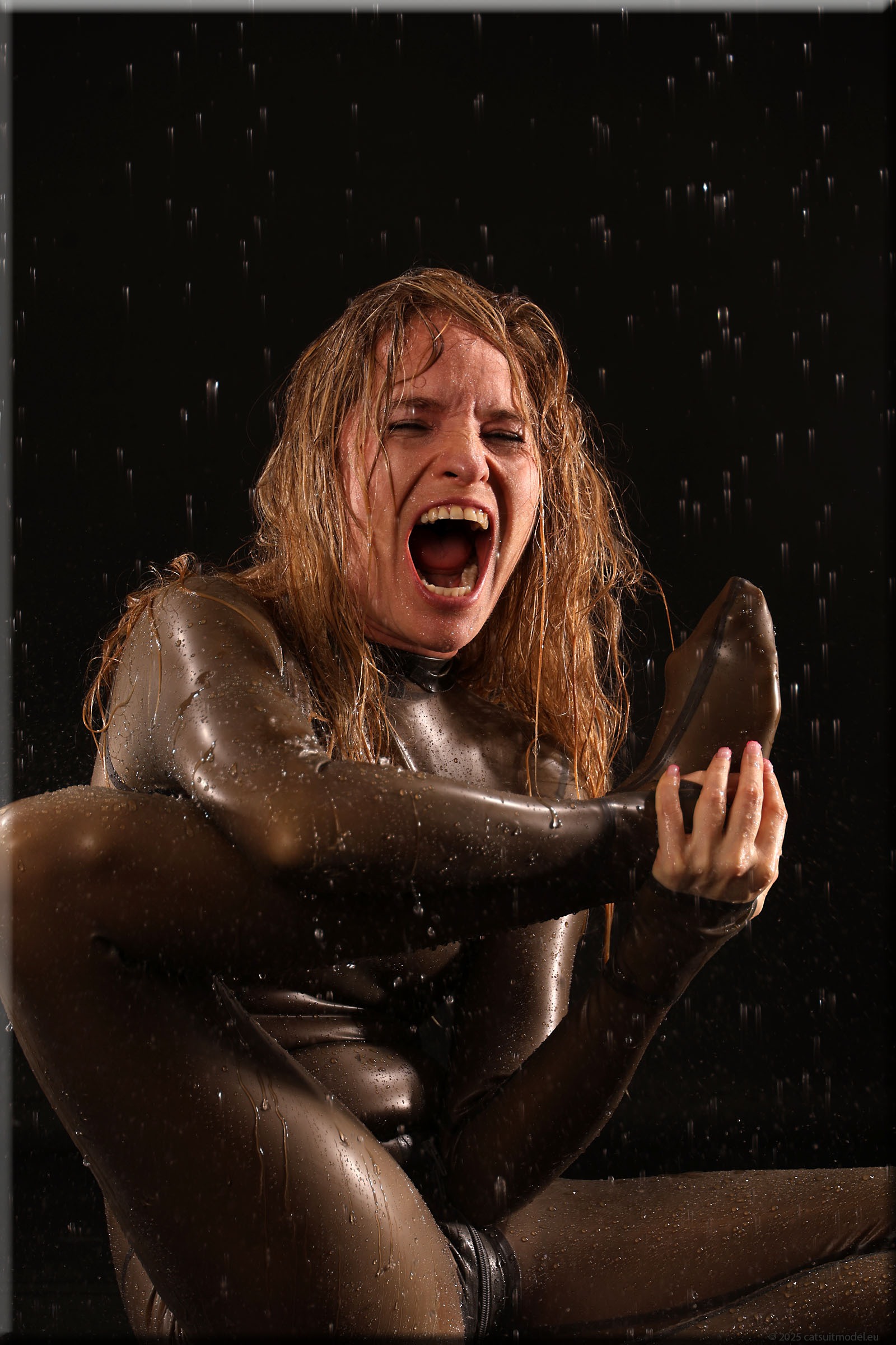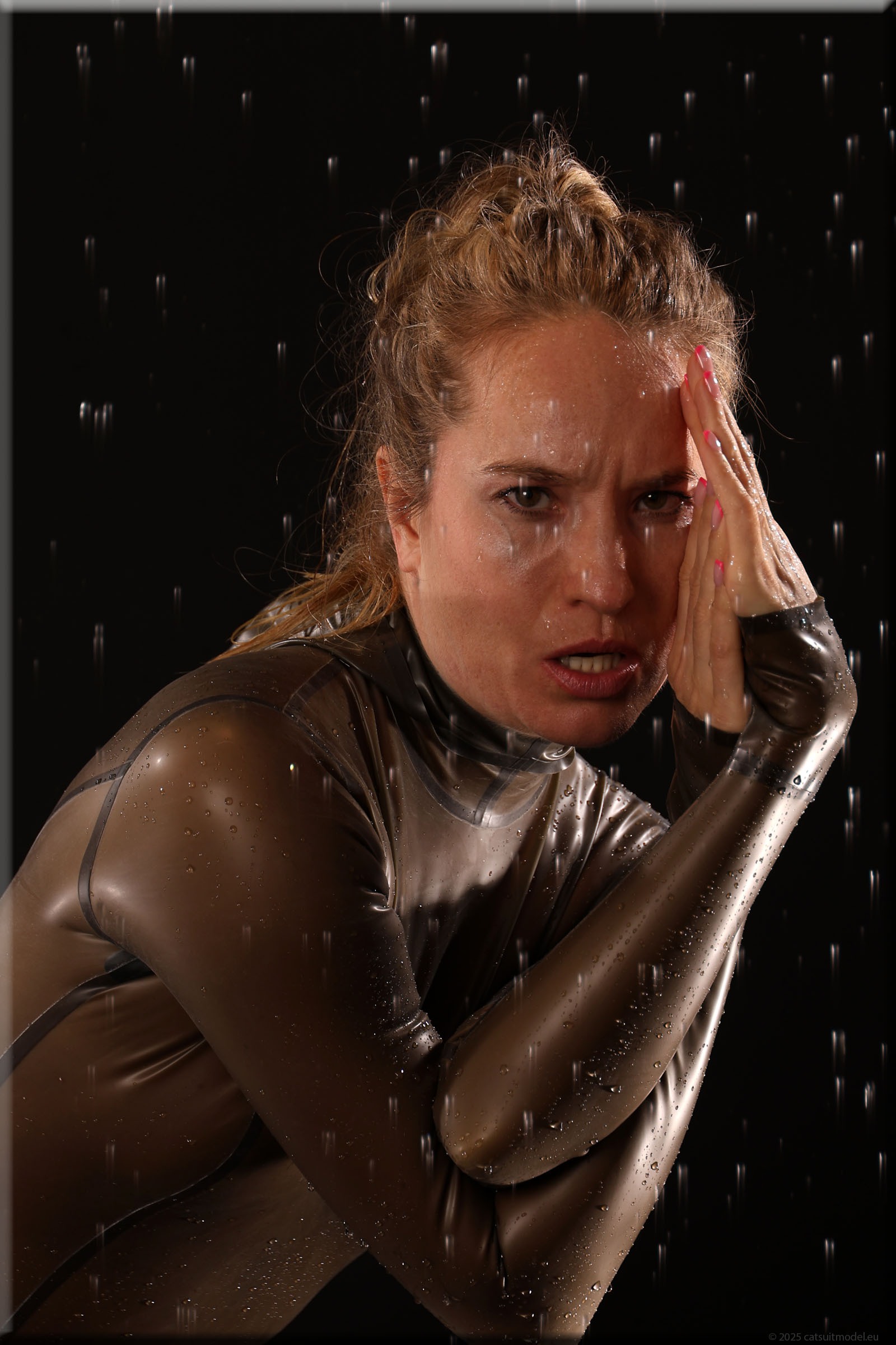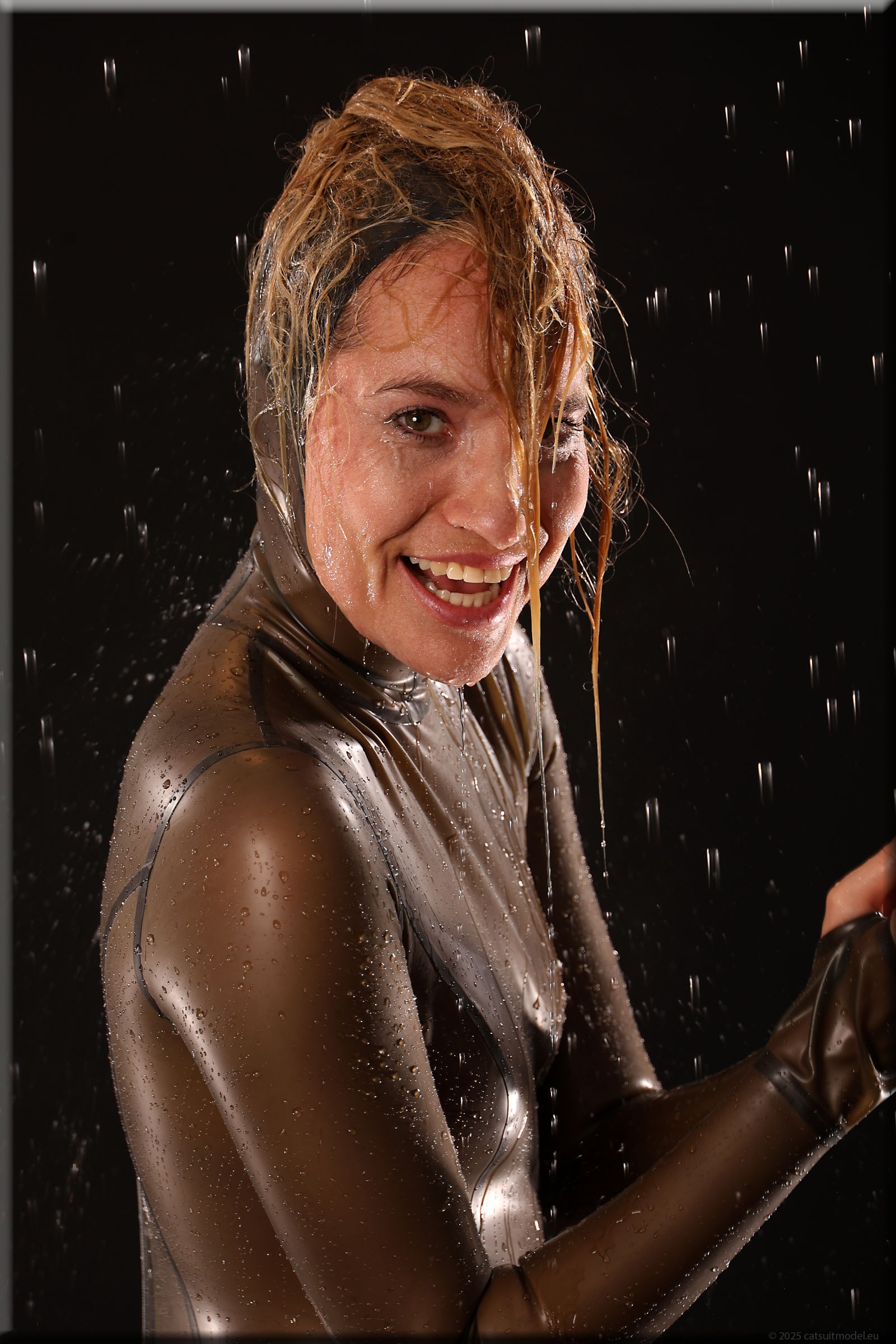 Als erstes musste Maria in den transparenten Catsuit von Latexcrazy steigen, dann hieß es „Wasser marsch!“ und sie musste in 25° warmem Wasser posieren. Es ist laut und anstrengend. Neu ab 326.