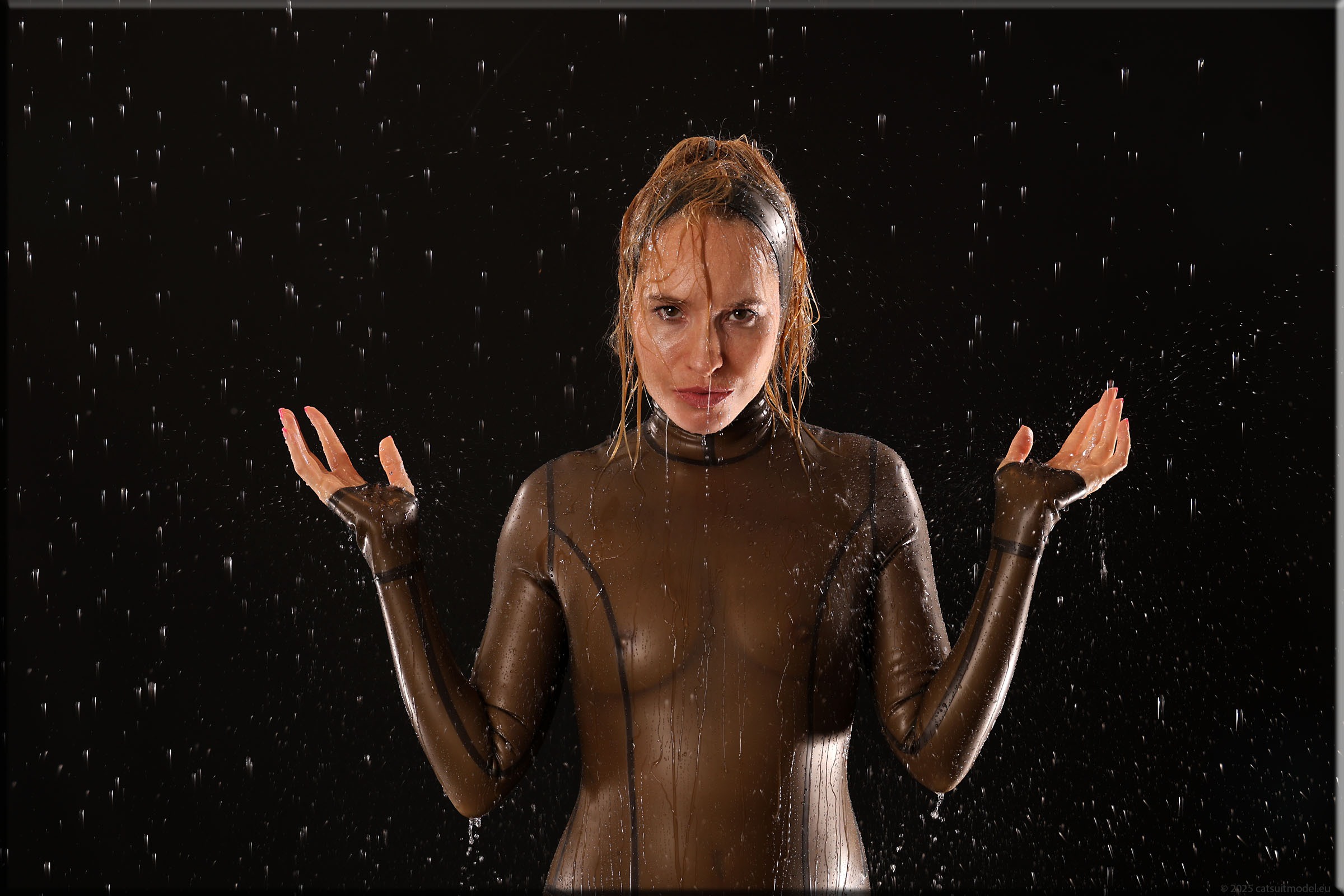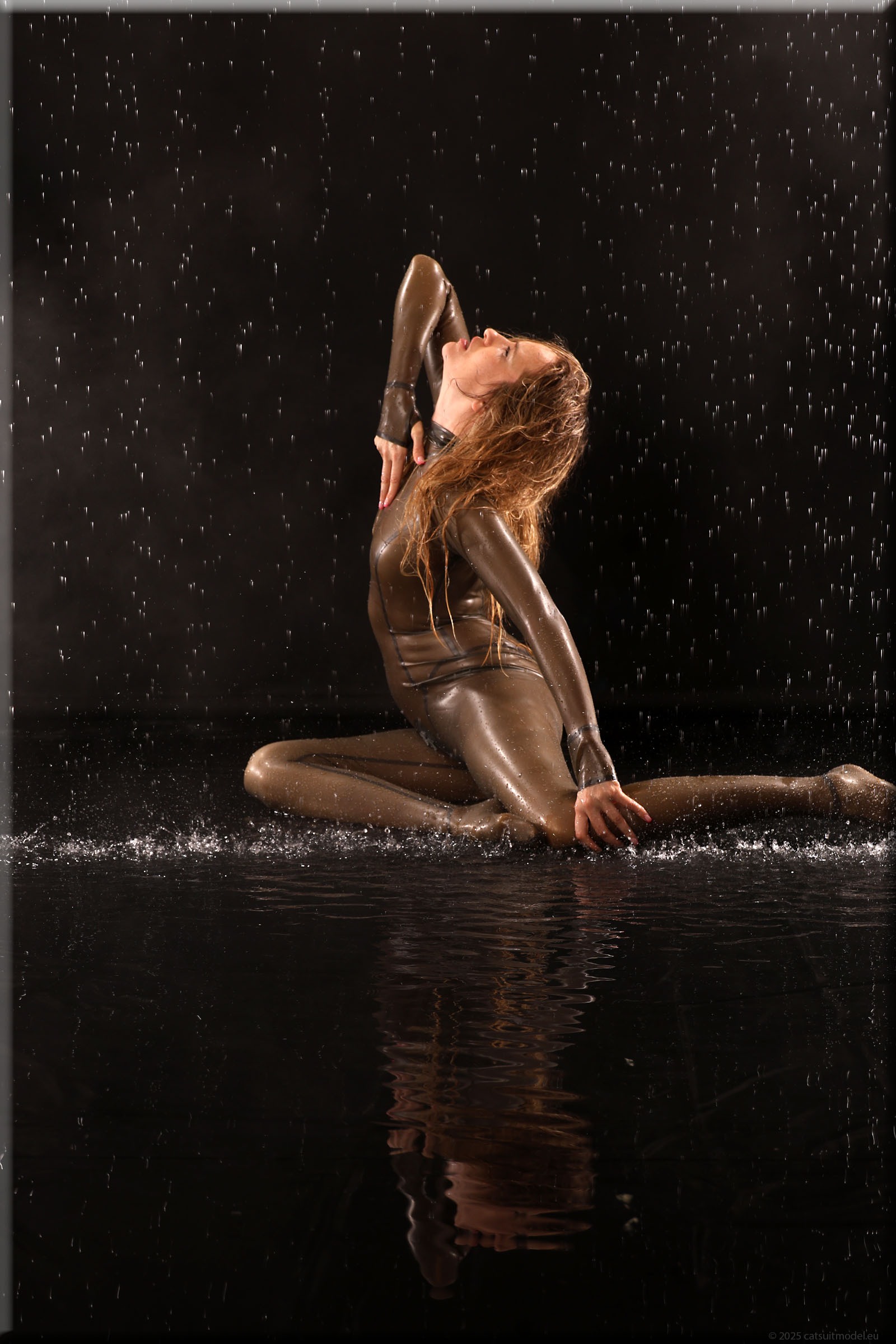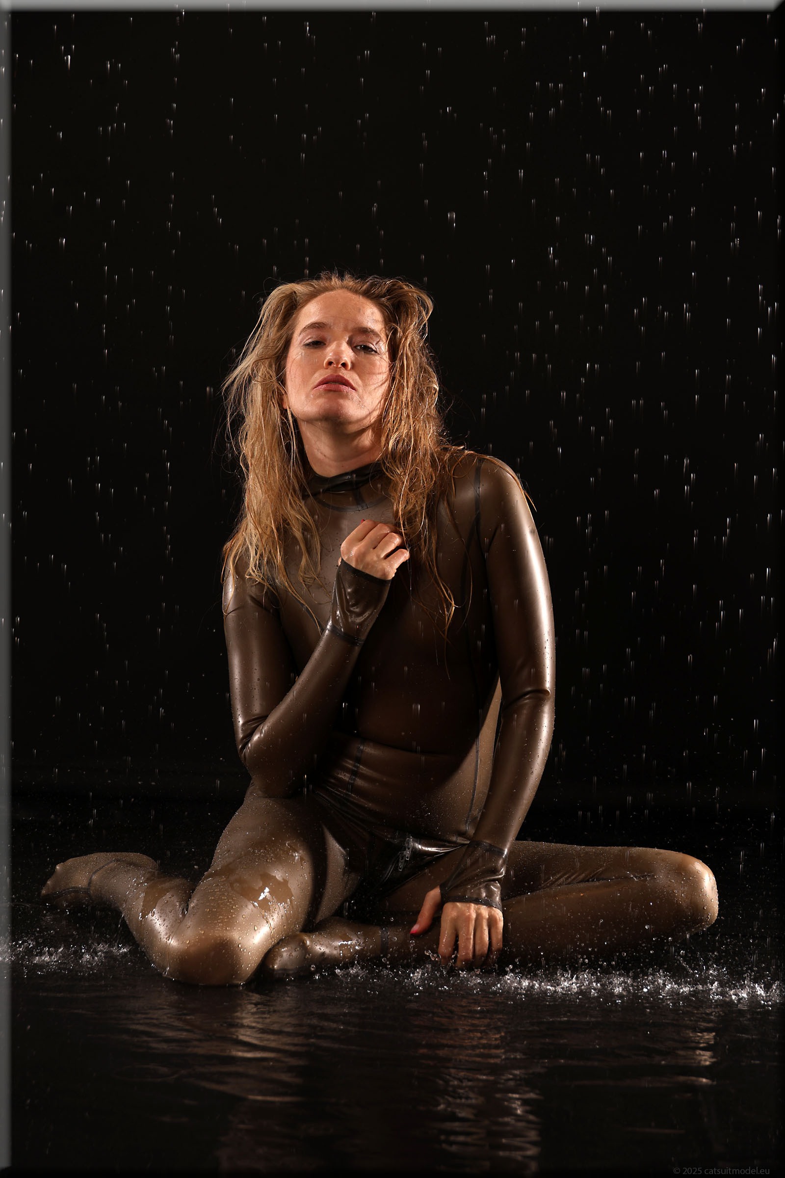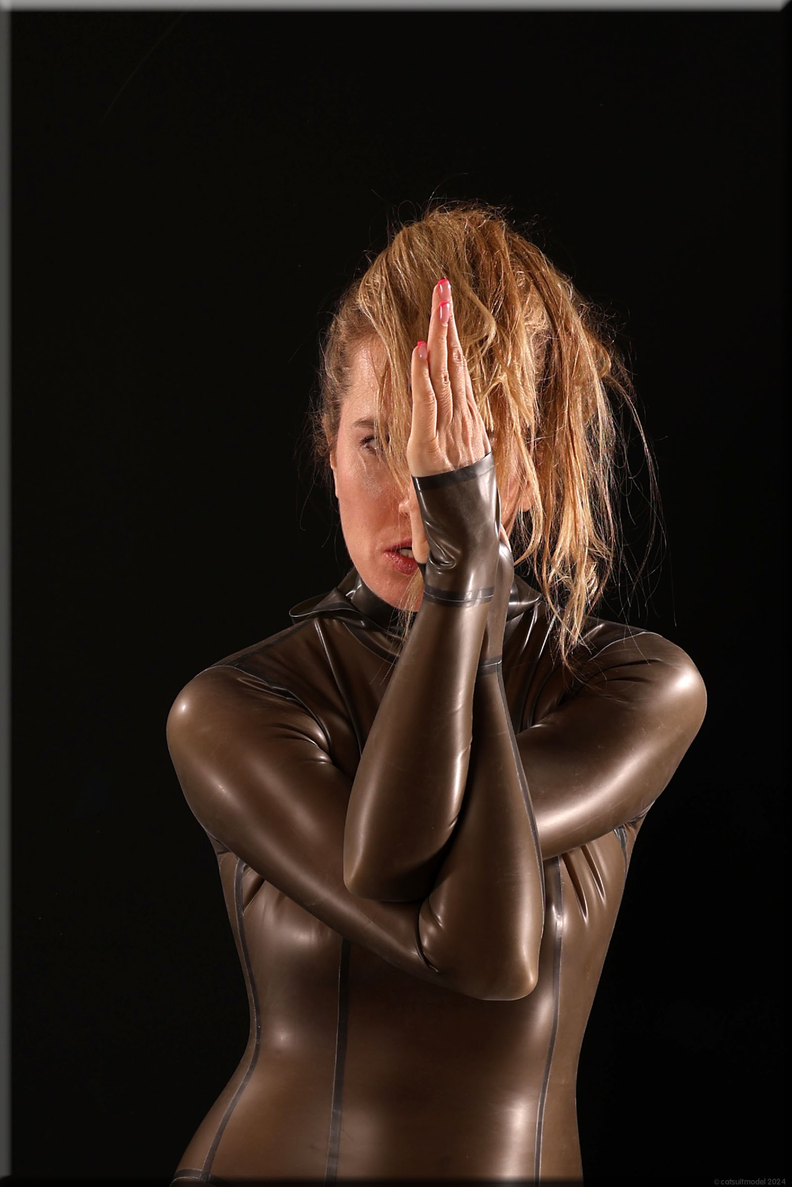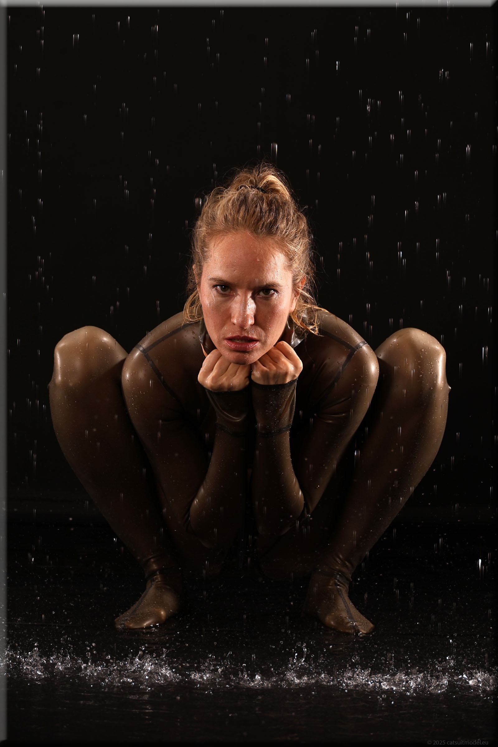Als erstes musste Maria in den transparenten Catsuit von Latexcrazy steigen, dann hieß es „Wasser marsch!“ und sie musste in 25° warmem Wasser posieren. Es ist laut und anstrengend. Neu ab 326.