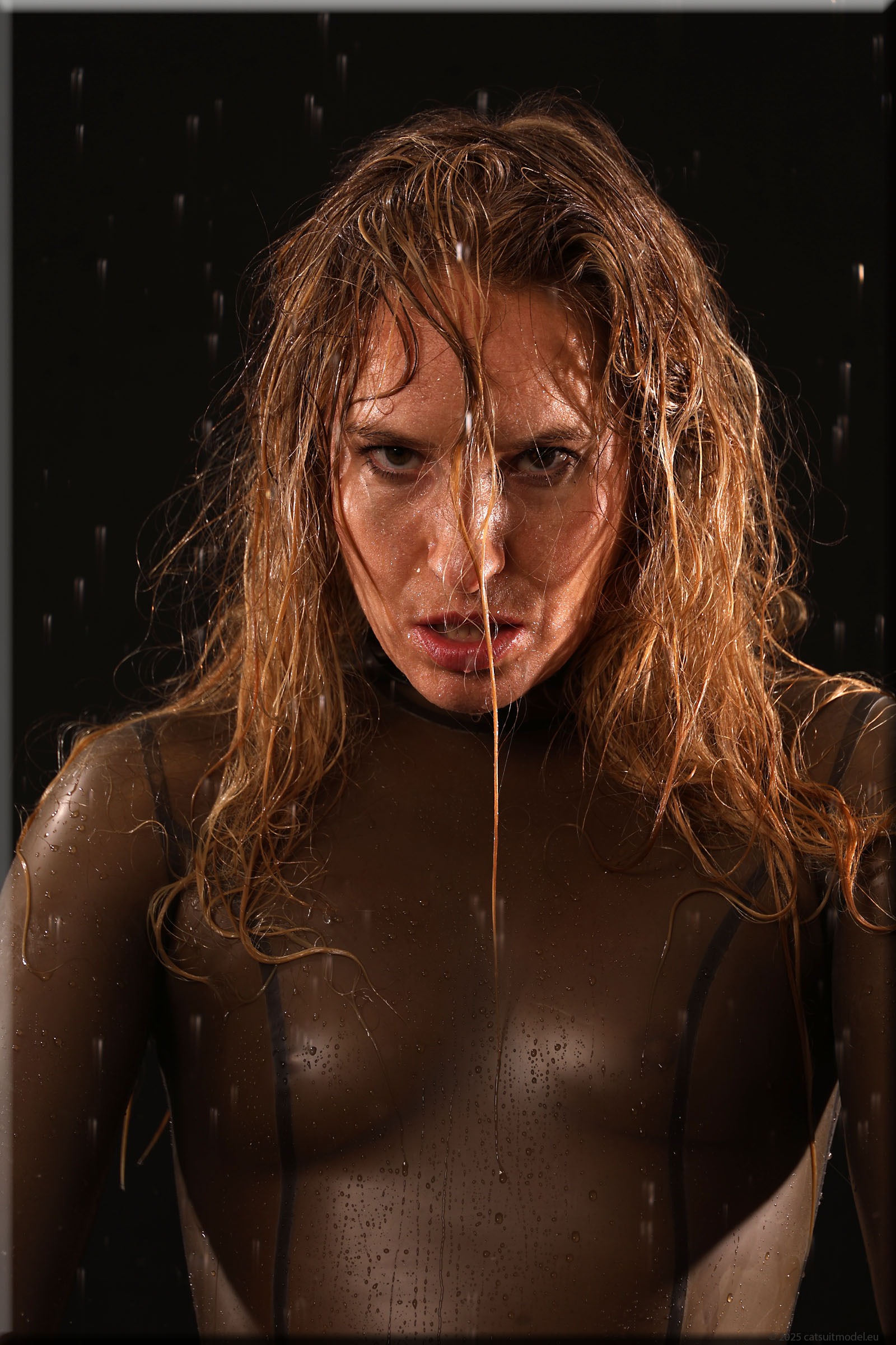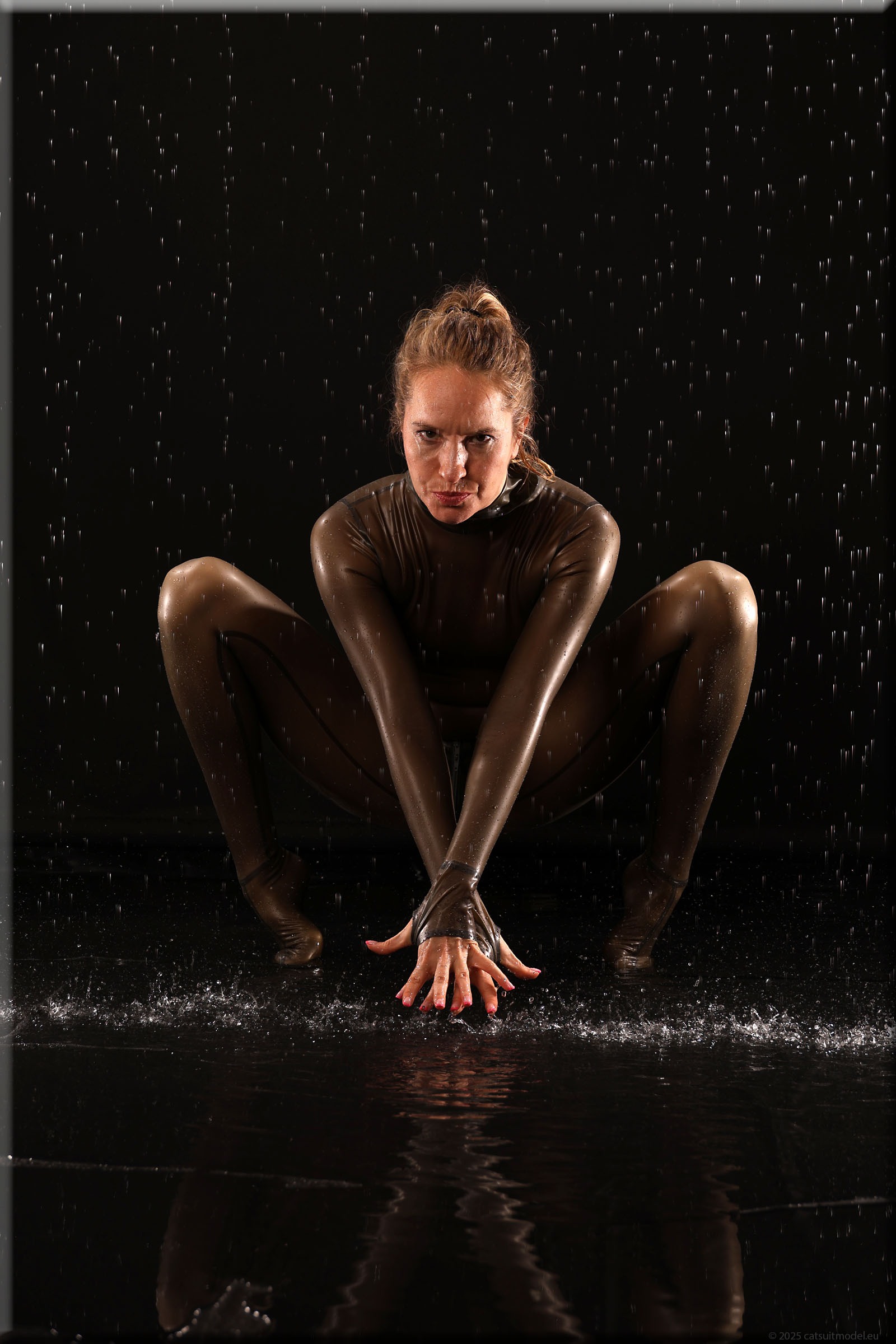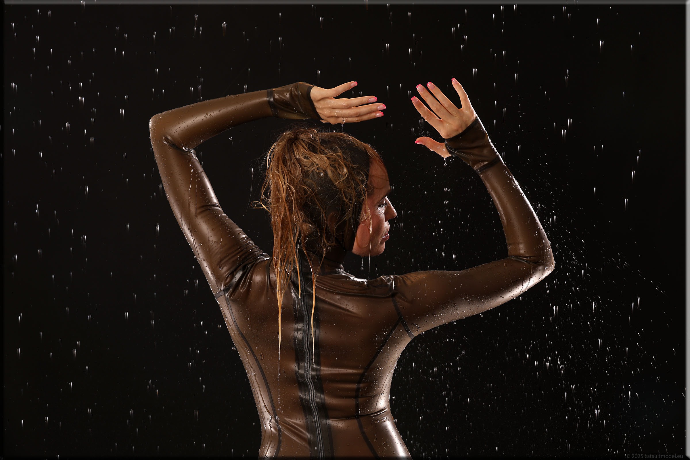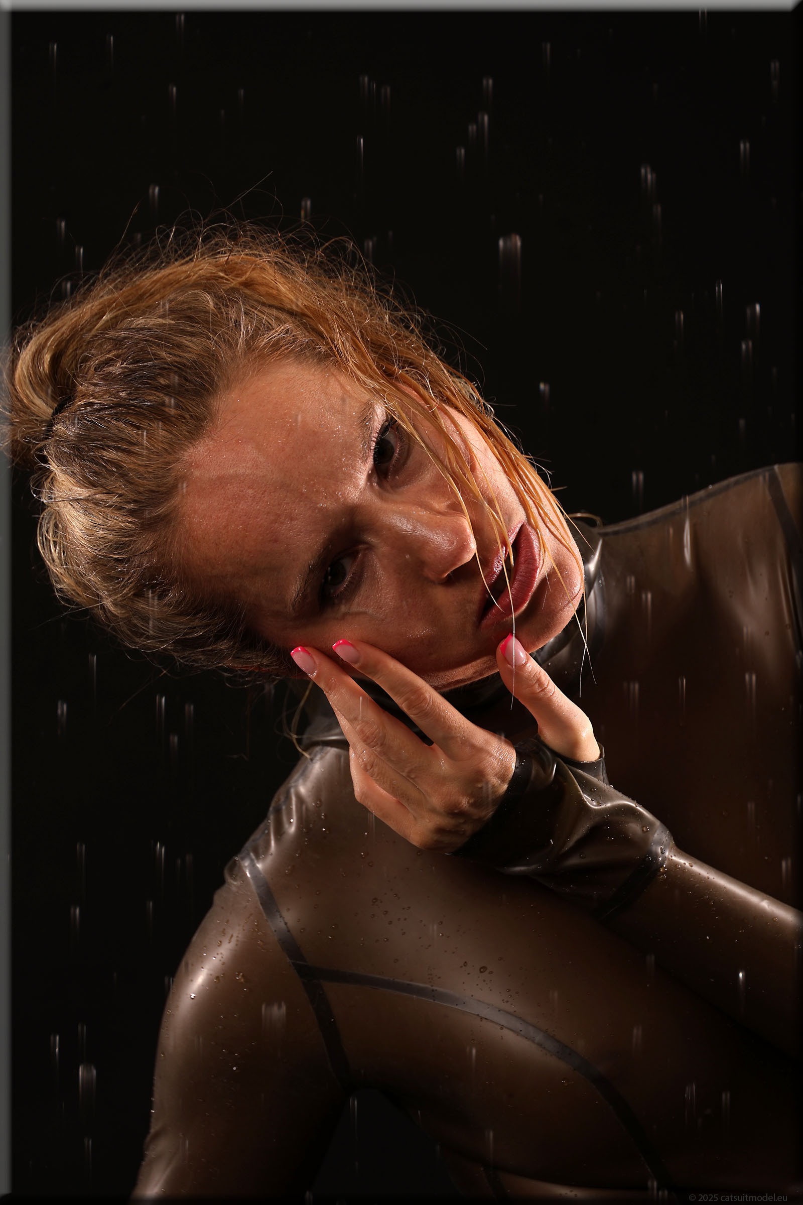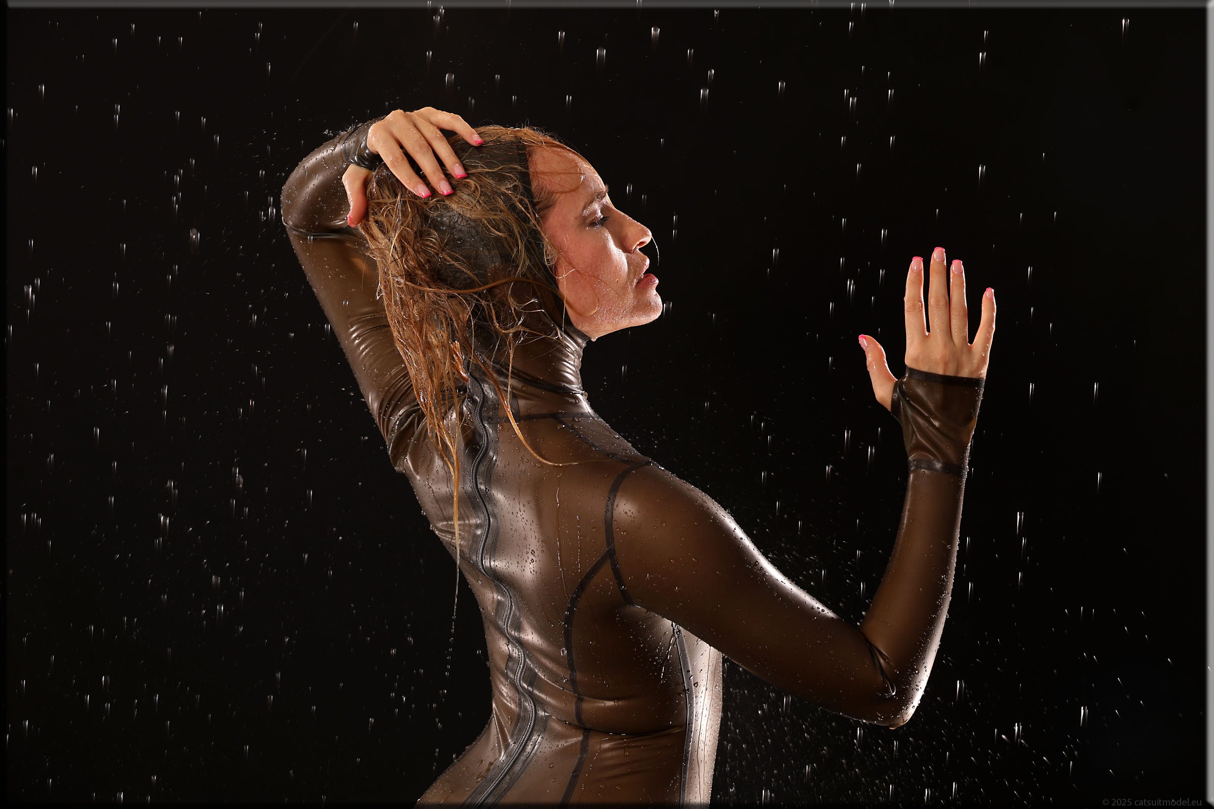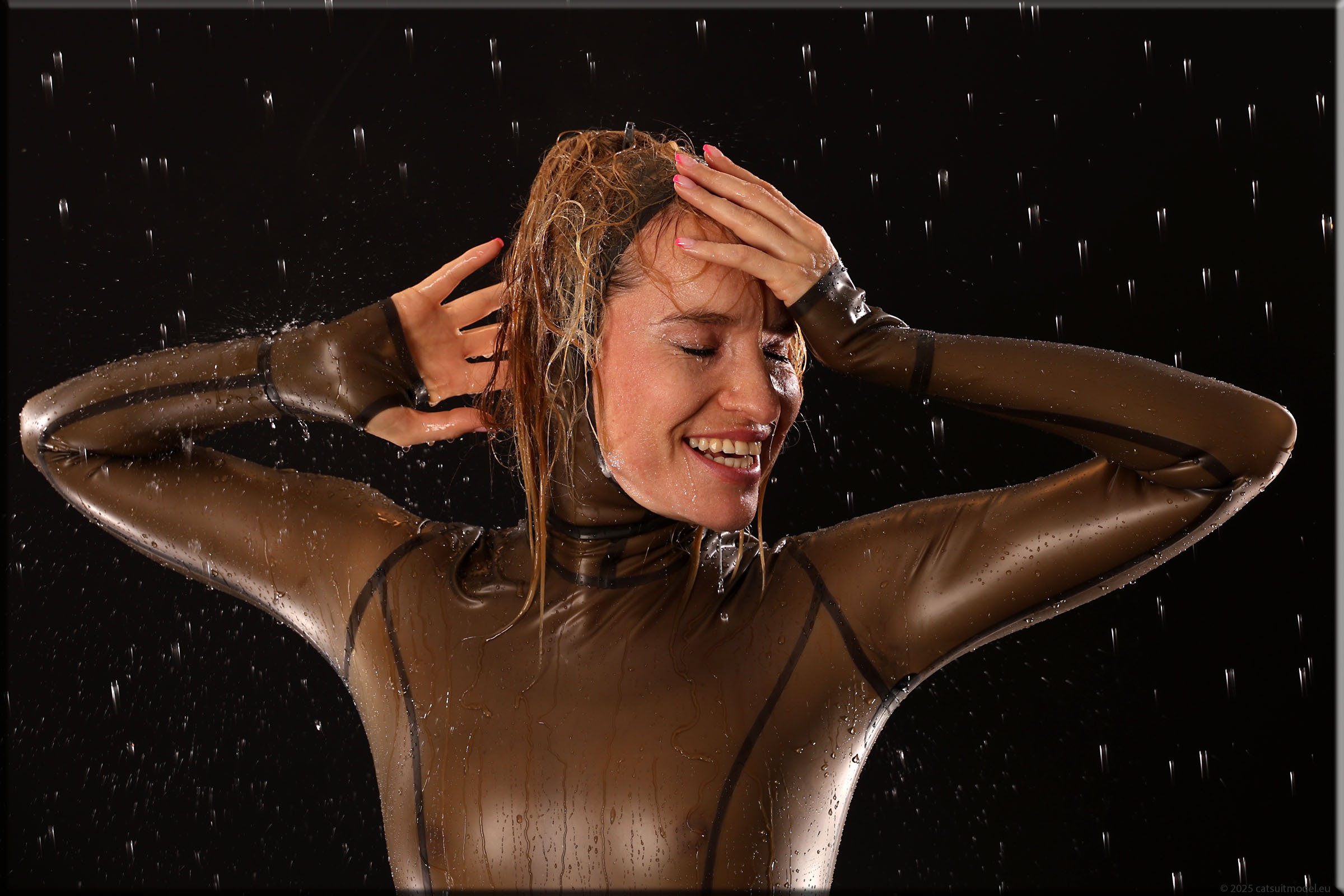 Als erstes musste Maria in den transparenten Catsuit von Latexcrazy steigen, dann hieß es „Wasser marsch!“ und sie musste in 25° warmem Wasser posieren. Es ist laut und anstrengend. Neu ab 326.