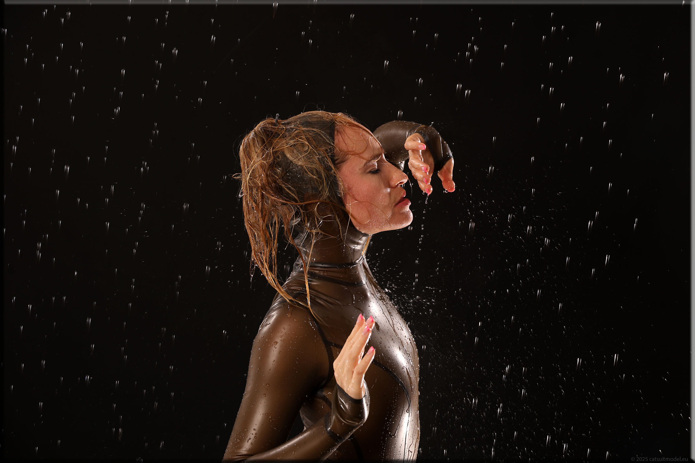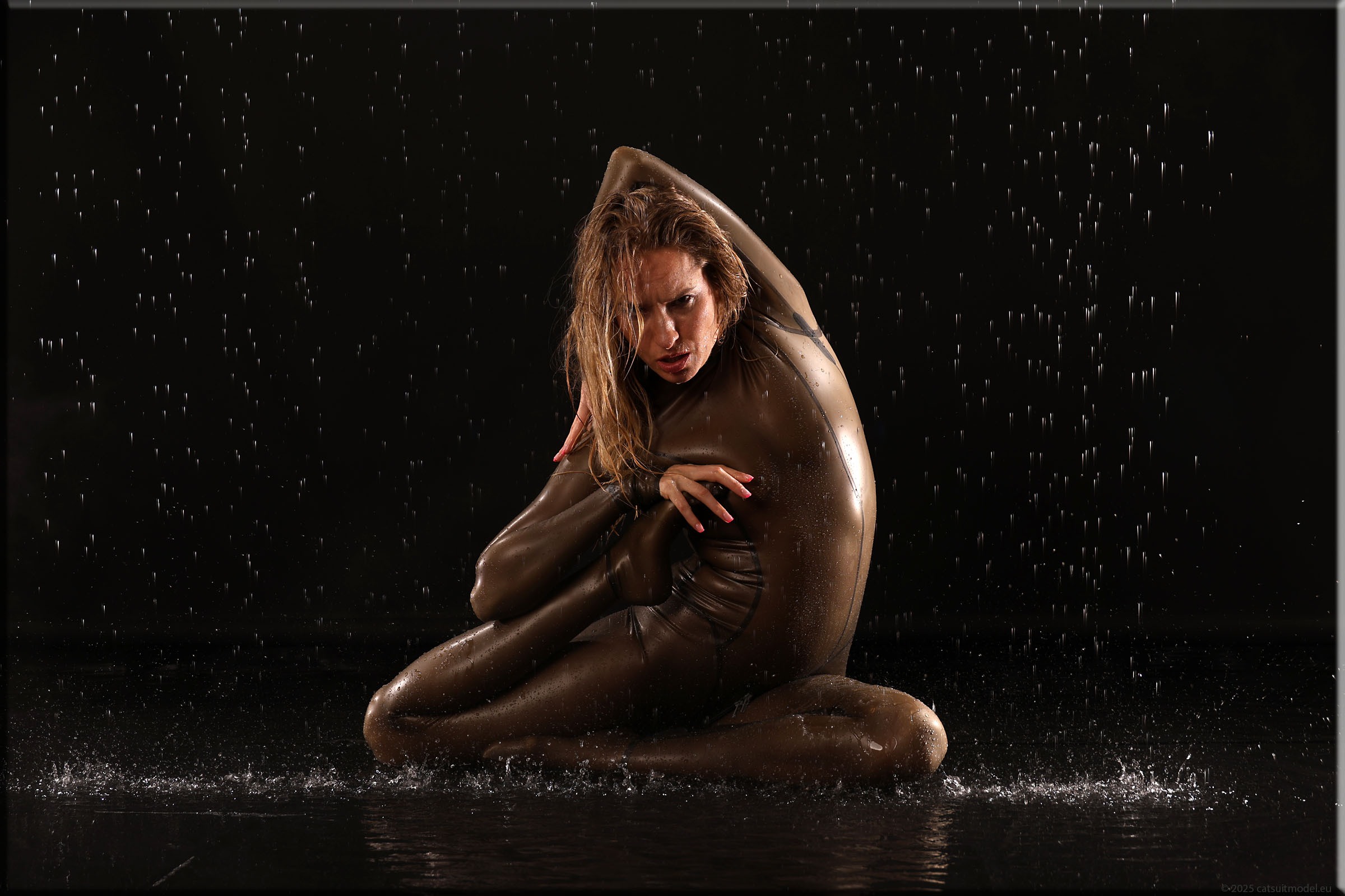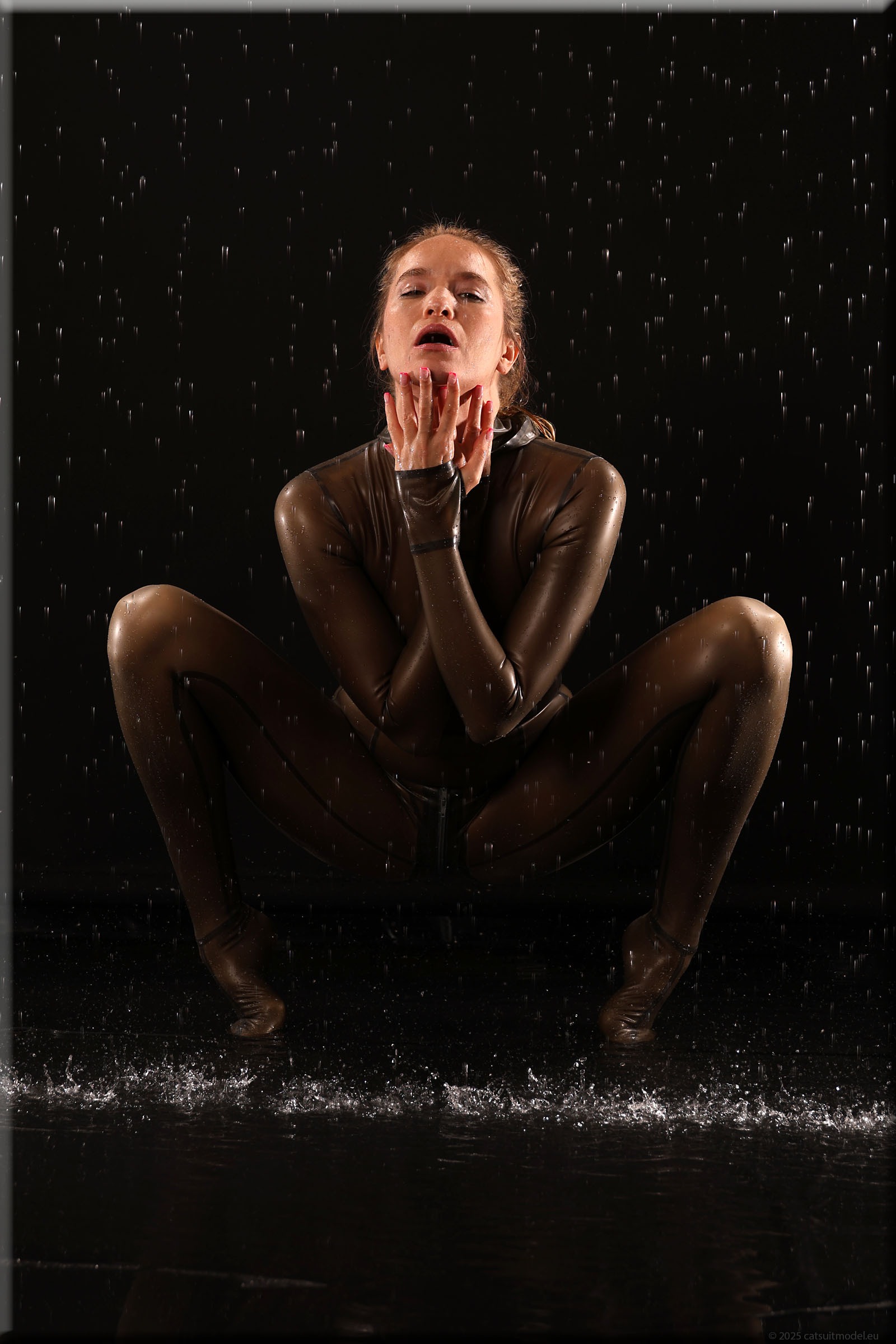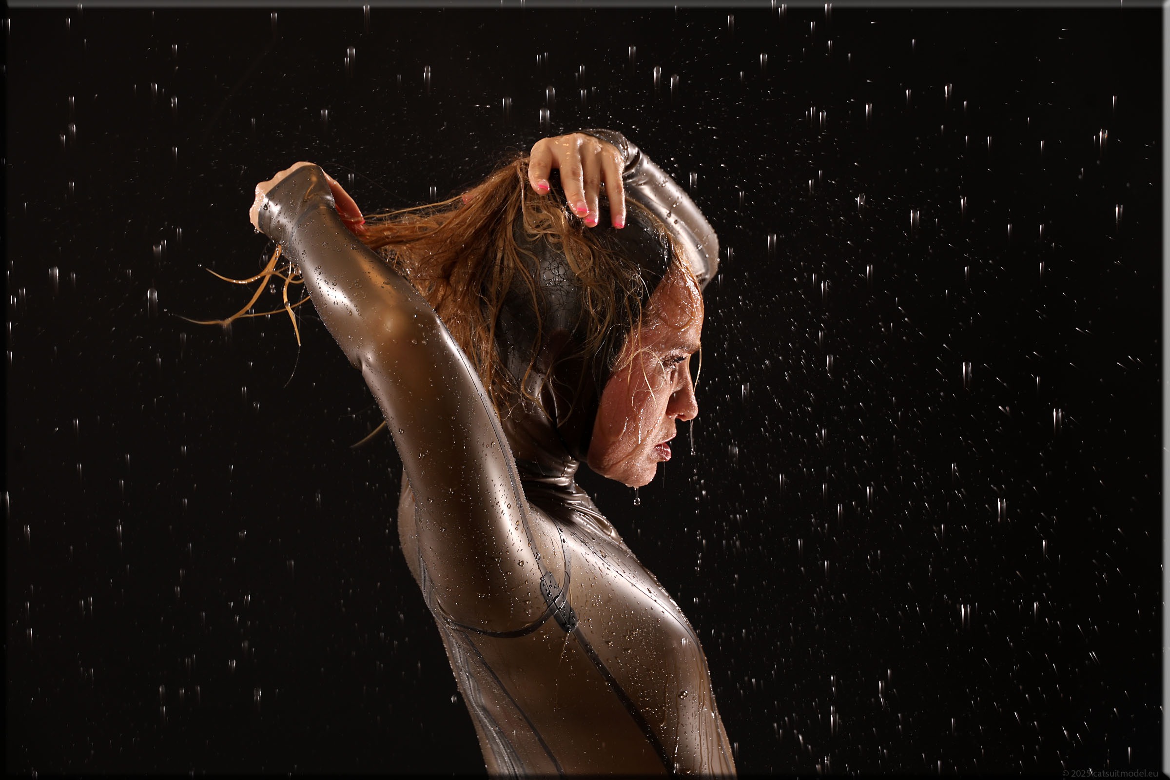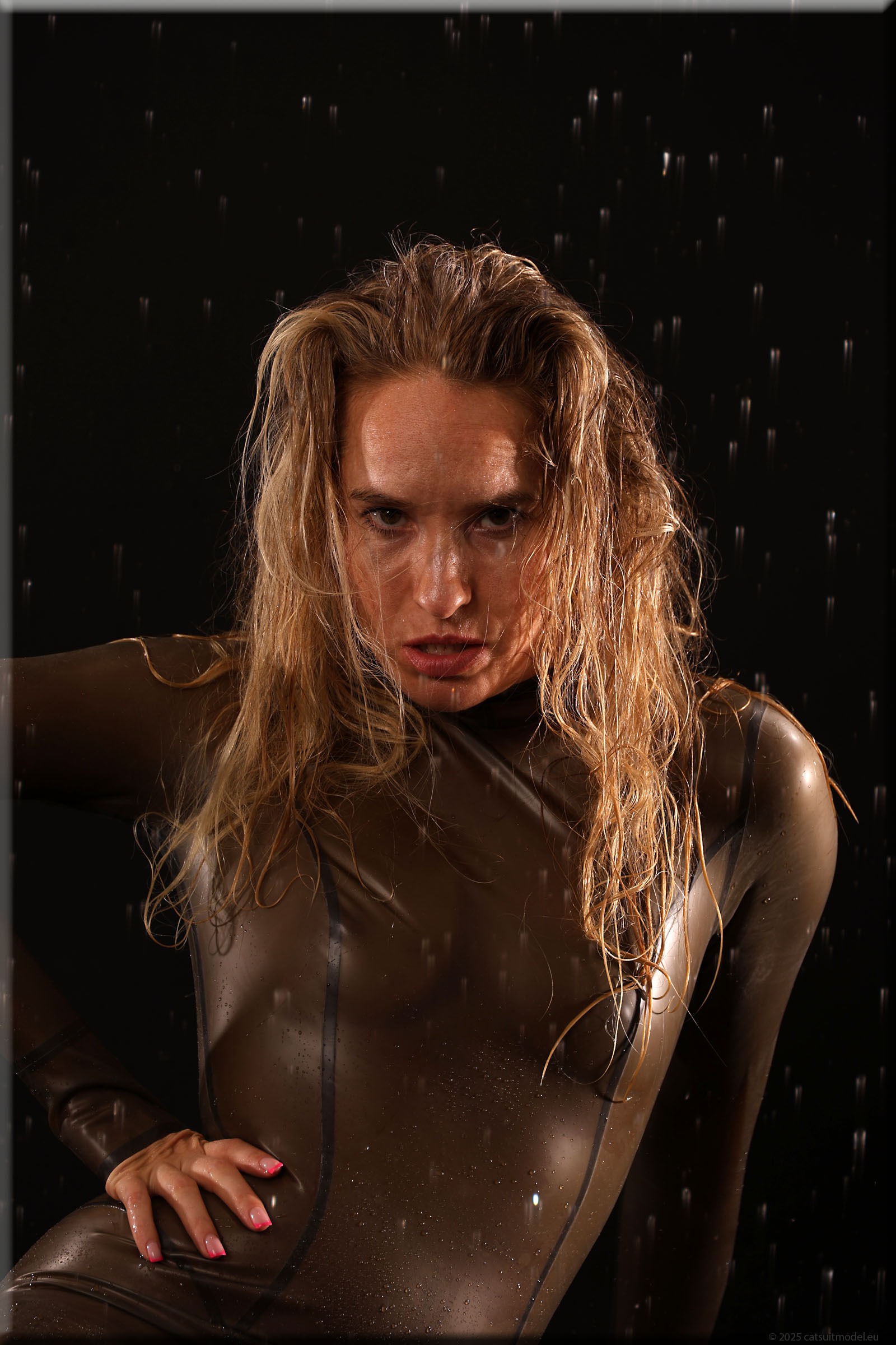 Als erstes musste Maria in den transparenten Catsuit von Latexcrazy steigen, dann hieß es „Wasser marsch!“ und sie musste in 25° warmem Wasser posieren. Es ist laut und anstrengend. Neu ab 326.
