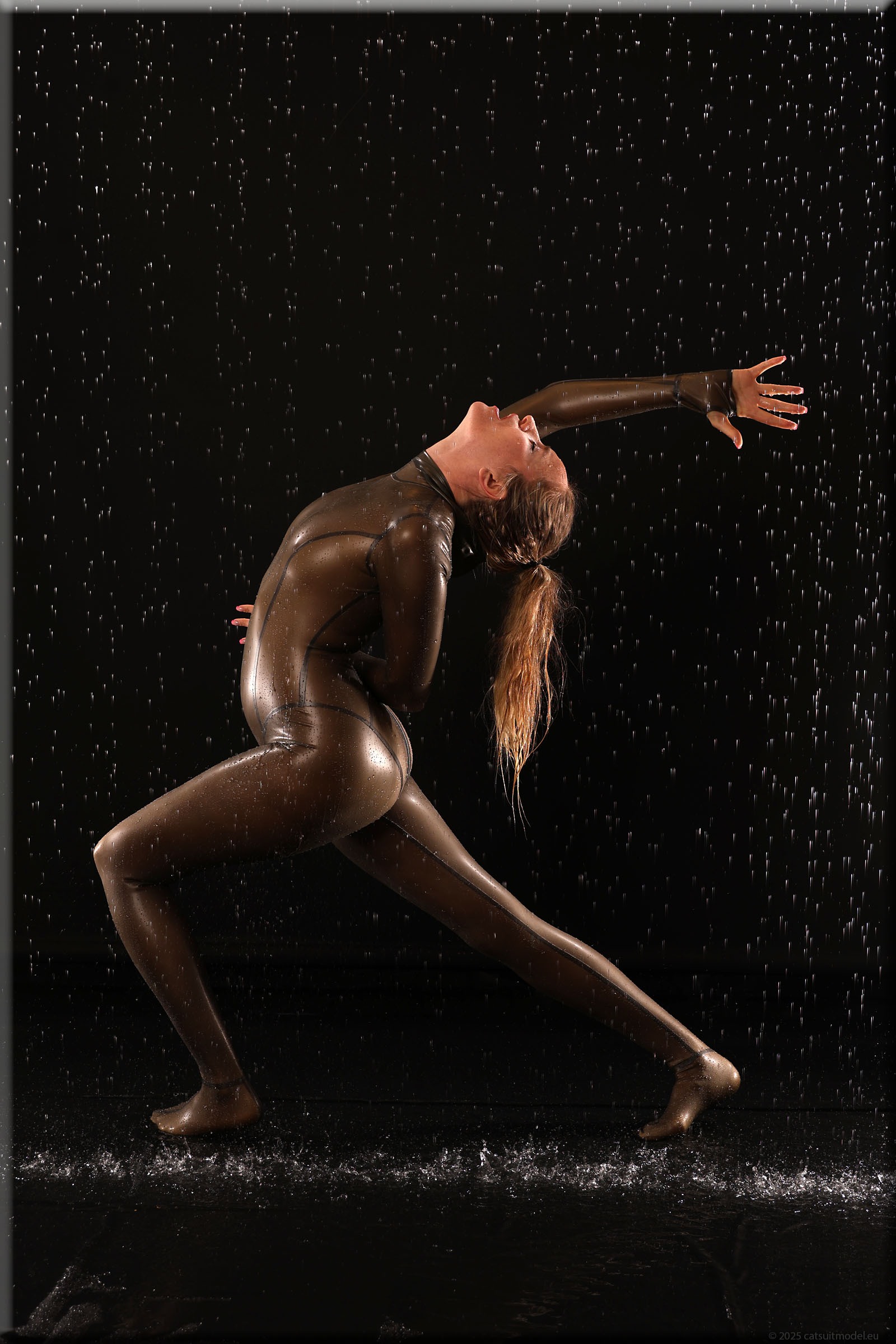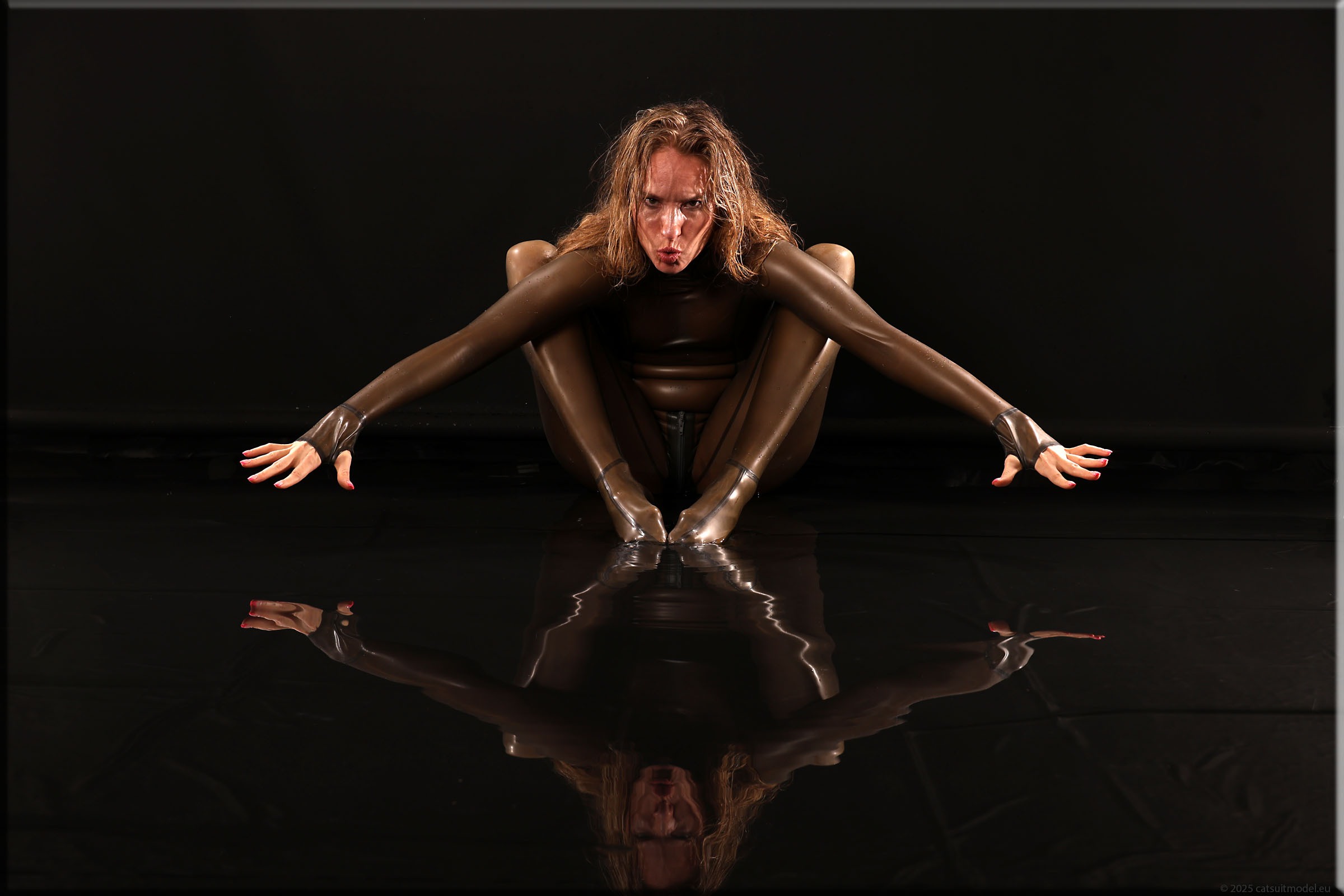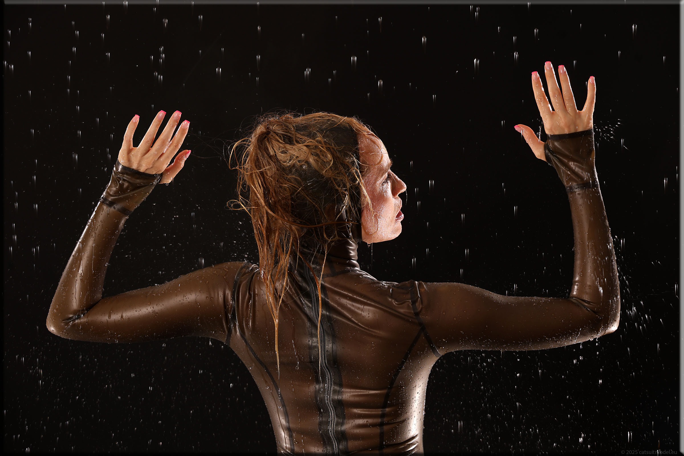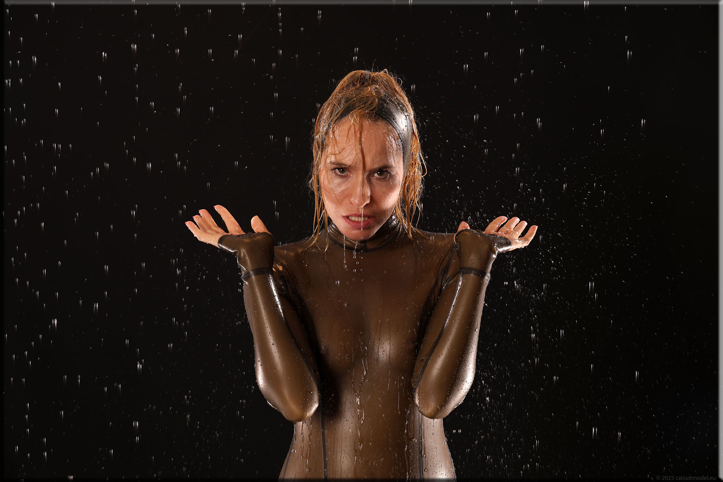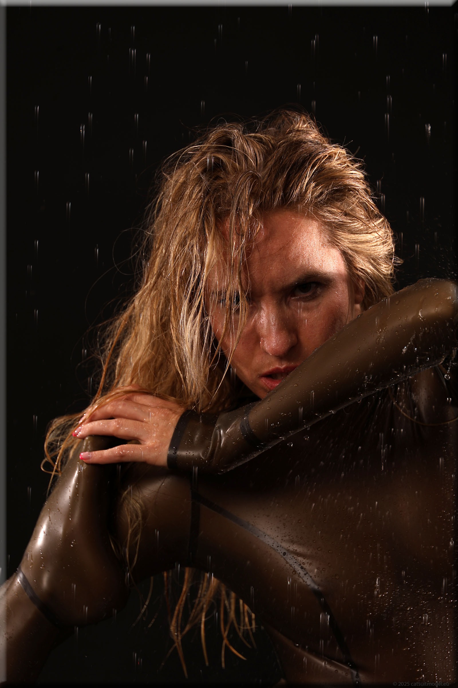 Als erstes musste Maria in den transparenten Catsuit von Latexcrazy steigen, dann hieß es „Wasser marsch!“ und sie musste in 25° warmem Wasser posieren. Es ist laut und anstrengend. Neu ab 326.